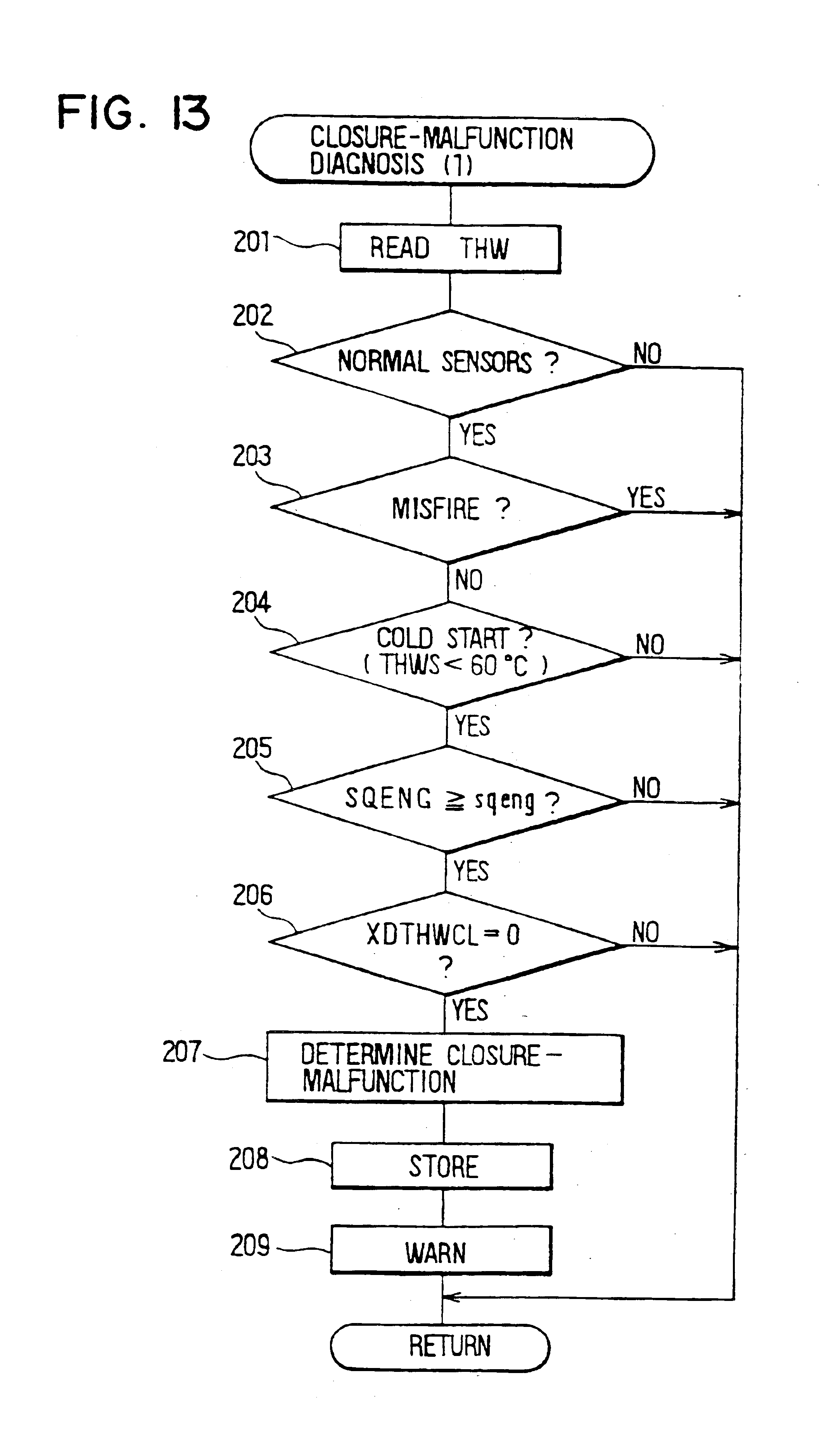 This application is a division of application Ser. No. 10/359,266, filed Feb. 6, 2003; now U.S. Pat. No. 6,725,710 which was a division of application Ser. No. 10/100,039, filed Mar. 19, 2002, now U.S. Pat. No. 6,679,110; which was a division of application Ser. No. 09/693,904, filed Oct. 23, 2000, now U.S. Pat. No. 6,386,022; which was a division of application Ser. No. 08/988,907 filed Dec. 11, 1997, now U.S. Pat. No. 6,279,390; the entire content of each of which is hereby incorporated by reference in this application. This application relates to and incorporate herein by reference Japanese Patent Applications No. 8-336579 filed on Dec. 17, 1996, No. 8-344749 filed on Dec. 25, 1996 and No. 9-283208 filed on Oct. 16, 1997. 1. Field of the Invention The present invention relates to a thermostat malfunction detecting system of an engine cooling system for detecting whether a thermostat for controlling the temperature of coolant of an engine is in malfunction or not. 2. Related Art Generally, a thermostat which opens/closes in correspondence to the temperature of a coolant (cooling water) is provided in a coolant circulating path for circulating the coolant between a water jacket within an engine and a radiator in the water-cooled type engine. It is closed from the start of the engine until when the warm-up operation is completed to halt the circulation of the coolant to raise the temperature of the coolant quickly to the required temperature range and to improve the fuel consumption and to reduce noxious exhaust emission. The thermostat automatically opens when the temperature of the coolant on the engine side exceeds the required temperature range to circulate the low temperature coolant on the radiator side to the engine side to lower or maintain the temperature of the coolant on the engine side to the required temperature range. As modes of malfunction of the thermostat, there are an open-malfunction during which the thermostat is kept opened and a closure-malfunction during which it is kept closed. When the open-malfunction occurs, the cold coolant within the radiator is circulated to the engine from the beginning of start even during the cold start time during which the engine is started while it is cold, so that the temperature of the coolant on the engine side is hampered from rising after the start, thus retarding the warm-up of the engine and increasing the fuel consumption and noxious exhaust emission. When the closure-malfunction occurs, the cold coolant on the radiator side is not circulated even when the temperature of the coolant on the engine side exceeds the required temperature range, so that there is a possibility that the temperature of the coolant on the engine side keeps rising, causing an over-heat of the engine in the end. Thus, there has been a possibility that even when the thermostat has the open-malfunction, a driver continues to drive a vehicle without knowing it for a long period of time and continues to drive the vehicle until engine overheats when it has the closure-malfunction. It is noted that there has been a technology of providing coolant temperature sensors at the inlet and outlet of the radiator, respectively, to evaluate the heat radiating performance of the radiator based on the temperature of coolant at the inlet and outlet of the radiator to detect the deterioration of the radiator as disclosed in Japanese Patent Application Laid-Open No. Hei. 4-19329. However, because the thermostat opens/closes automatically in correspondence to the temperature of the coolant on the engine side, the malfunction of the thermostat cannot be detected even if the coolant temperature on the radiator side which is not related to the opening/closing operation of the thermostat is detected at the two spots as disclosed. Still more, the cost becomes high because two temperature sensors have to be provided anew on the radiator side. Accordingly, it is an object of the present invention to provide a thermostat malfunction detecting system of a cooling system of an internal combustion engine which detects the malfunction of the thermostat accurately at relatively low cost. According to a first aspect of the present invention, a thermostat malfunction detecting system of detects, based on the behavior of a coolant temperature on the engine side, the coolant temperature on the path for circulating the coolant on the engine side from the thermostat (engine side coolant temperature) and diagnoses the thermostat whether it has an open-malfunction by which it is not closed and is kept opened (open-malfunction) based on the engine side coolant temperature detected in a temperature range in which the thermostat is normally closed. Because the behavior of the engine side coolant temperature is largely different during the normal time and during the open-malfunction in the temperature range in which the thermostat is normally closed, the thermostat may be diagnosed whether it has the open-malfunction accurately from the behavior of the engine side coolant temperature in this temperature range. Still more, because the coolant temperature may be detected by using the coolant temperature sensor for controlling the engine provided in the conventional engine, no new coolant temperature sensor needs to be added to the engine control system. When a closure-malfunction by which the thermostat is not opened and is kept closed occurs, the thermostat is not opened, the coolant is not circulated and the engine side coolant temperature continues to rise up. Accordingly, the thermostat malfunction detecting system diagnoses the thermostat whether it has the closure-malfunction based on the detected engine side coolant temperature in the temperature range in which the thermostat is normally opened. Because the behavior of the engine side coolant temperature is largely different during the normal time and during the closure-malfunction in the temperature range in which the thermostat is normally op