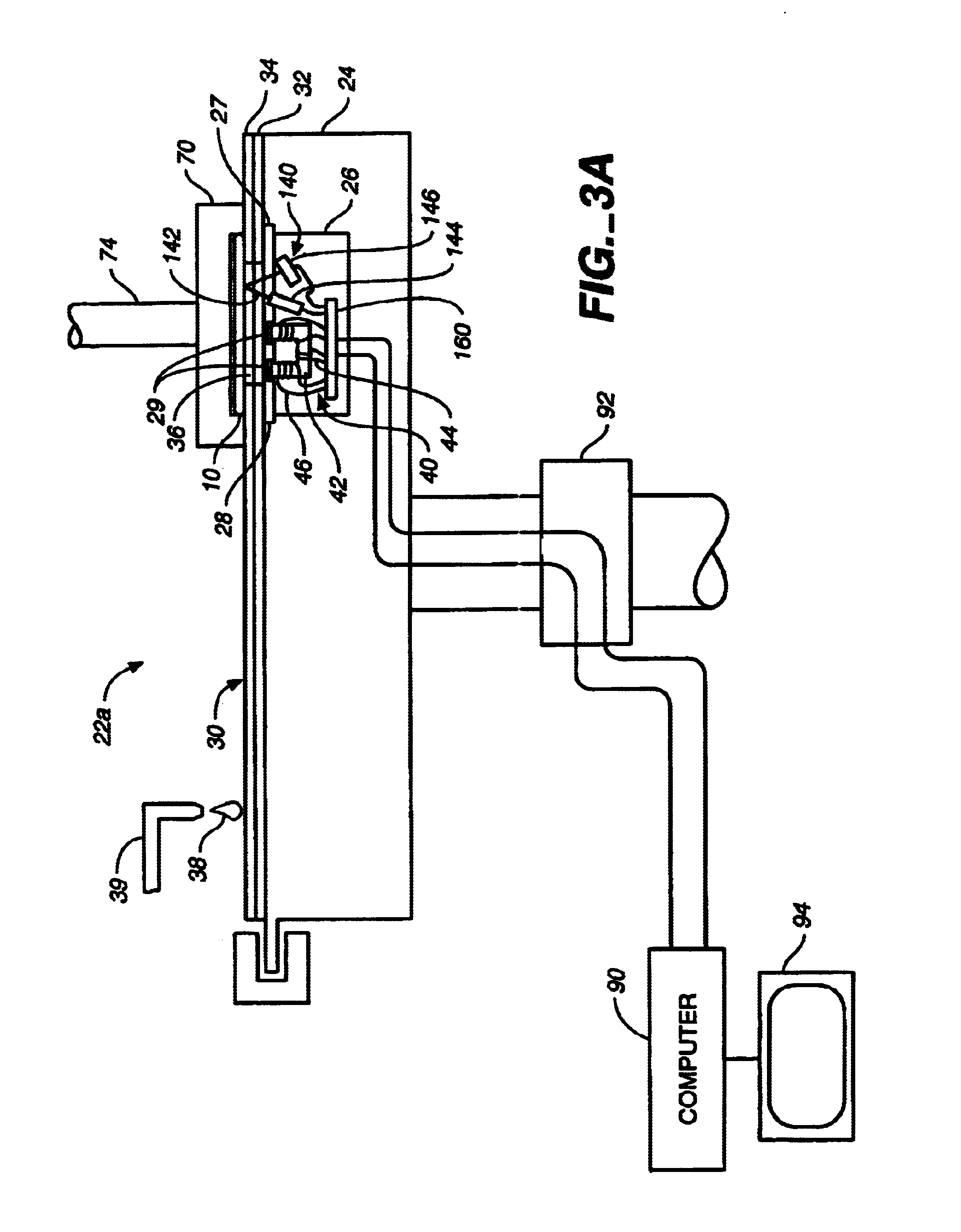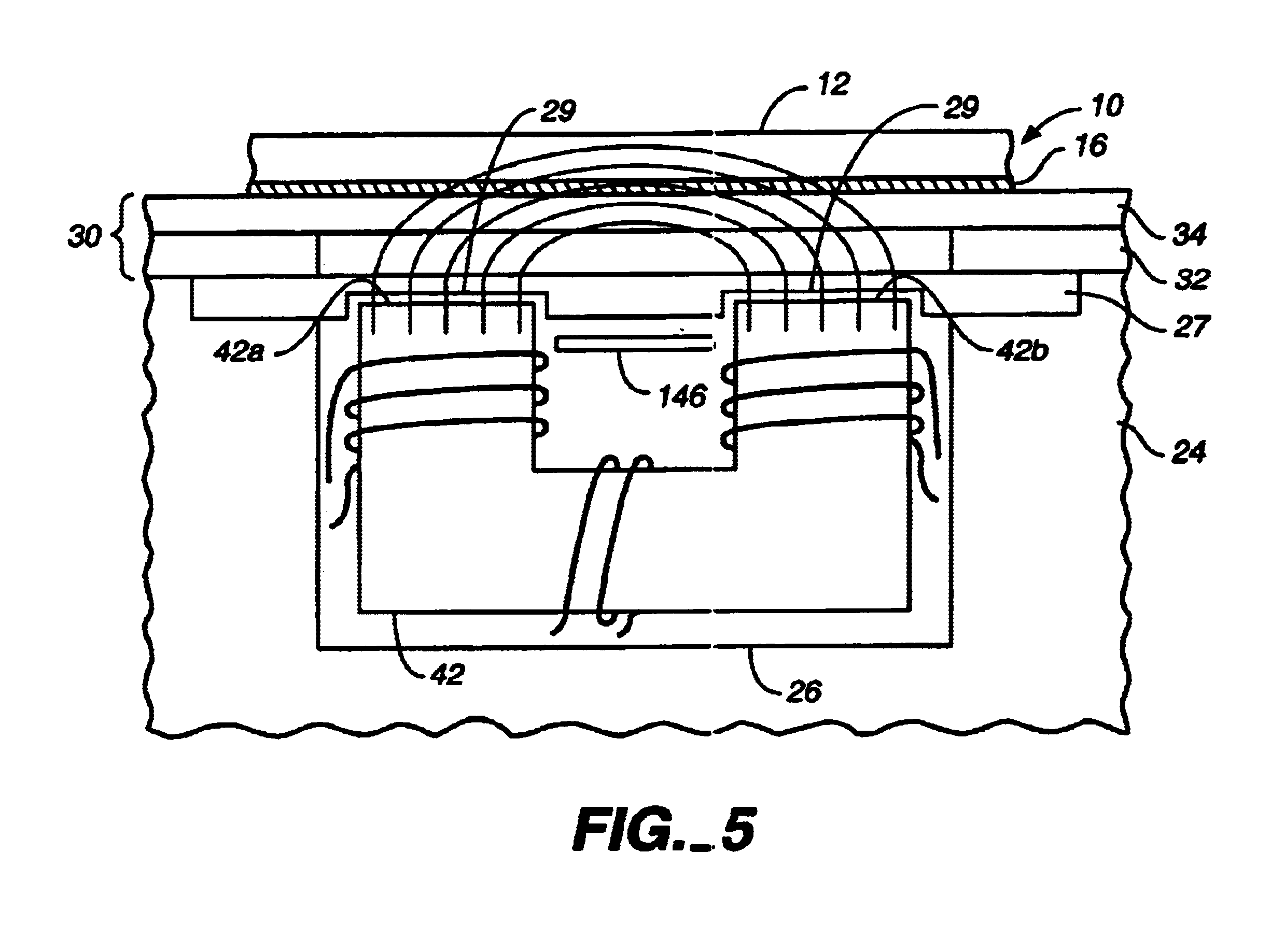 Referring to FIG. 5, core 42 can be a U-shaped body formed of a non-conductive material with a relatively high magnetic permeability. The driving coil can be designed to match the driving signal from the oscillator. The exact winding configuration, core composition and shape, and capacitor size can be determined experimentally. As shown, the lower surface of transparent cover 27 may include two rectangular indentations 29, and the two prongs 42a and 42b of core 42 may extend into the indentations so as to be positioned closer to the substrate.
