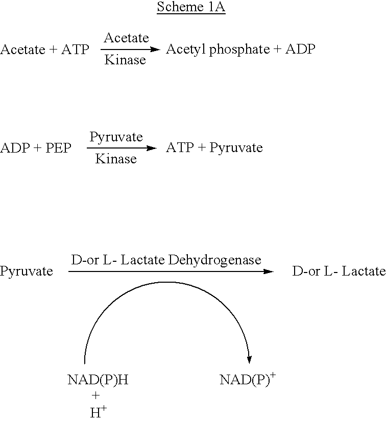 An example of a suitable butyrate kinase is the enzyme having Enzyme Commission Number 2.7.2.7. Step (ii) of Scheme 1B is the same as that of Scheme 1A; pyruvate kinase acts upon ADP and PEP to form ATP and pyruvate. Step (iii) is also the same as in Scheme 1A; lactate dehydrogenase facilitates the formation of lactate from pyruvate. Either of the two types of lactate dehydrogenase, L-lactate dehydrogenase and D-lactate dehydrogenase, can also be employed in step 3 of the enzyme/coenzyme couple employing butyrate kinase. Any suitable buffer can be employed with this type of enzyme/coenzyme couple. The pH of the aqueous solvent layer in which the enzyme/coenzyme couple is operating can range from 6.5 to 8.5. Preferably, the pH of the aqueous solvent layer ranges from 7 to 8.5; this pH range allows optimal functioning of the enzymes and coenzymes of this enzyme/coenzyme couple. The enzyme/coenzyme couples shown in Schemes 1A and 1B for acetate and butyrate could also be employed for other carboxylate byproducts, with appropriate modifications in the kinase enzyme employed and conditions of the aqueous solvent layer. A second kind of enzyme/coenzyme couple for the acetate byproduct can be employed in the present invention. This enzyme/coenzyme couple operates as shown below in Scheme 2.