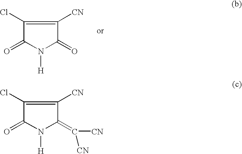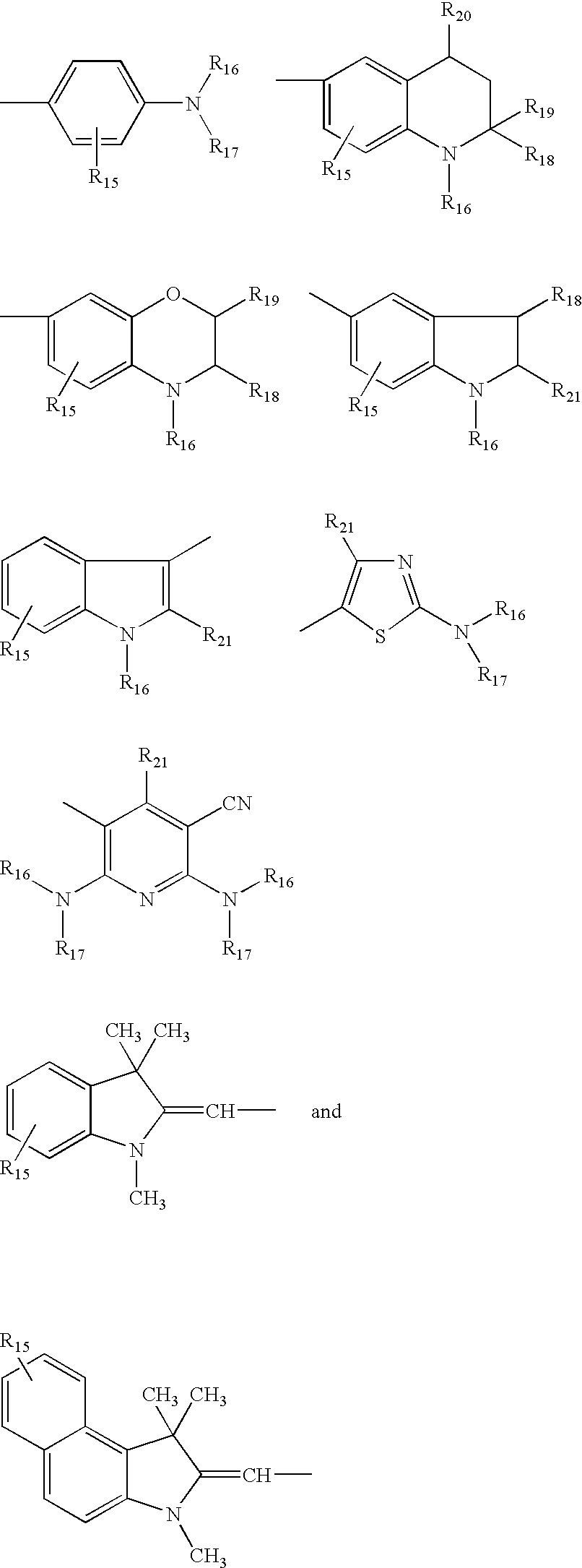 wherein R16, R17, R18, R19, R20and R21are as defined for Z previously in Formula XIII; wherein R16′ is selected from the same groups as R16; wherein R26is selected from cyano, C1–C6-alkoxycarbonyl, C1–C6-alkylsulfonyl, arylsulfonyl, aryl, heteroaryl, formyl, C1–C6-alkanoyl or —CH═AM; wherein R27is hydrogen or cyano; wherein AM is the residue of an active methylene compound selected from malononitrile, α-cyanoaceticacid esters, malonic acid esters, α-cyanoacetic acid amides, α-C1–C6-alkylsulfonyl-acetonitriles, α-arylsulfonylacetonitriles, α-C1–C6-alkanoylacetonitriles, α-arylsulfonylacetonitriles, α-C1–C6-alkanoylacetonitriles, α-arylacetonitriles, α-hereroacylacetonitriles, bis(heteroaryl) methanes, 1,3-indanediones, 2-furanones, benzo-2-furanones, benzo (b) thieno-3-xlidene propanedinitrile-5,5-dioxides, 1,3-bis(dicyanomethylene)indanes, barbituric acid, 5-pyrazolones, dimedone, 3-oxo-2,3-dihydro-1-benzothiophene-1,1-dioxides, aryl C(CH3)═C(CN)2and NC CH2CO2X, R28; wherein —CO2X is a photopolymerizable group as previouly defined.