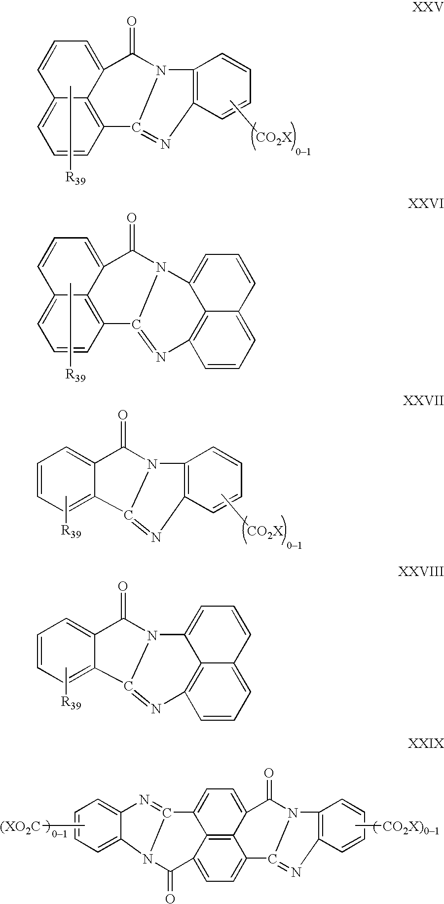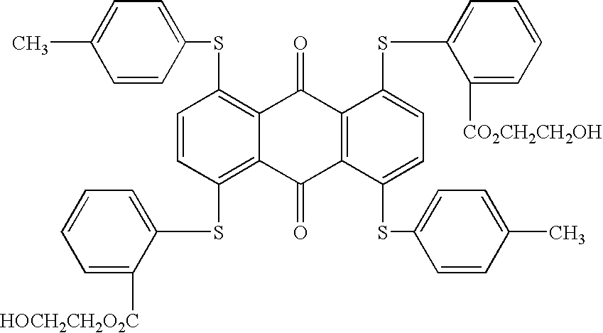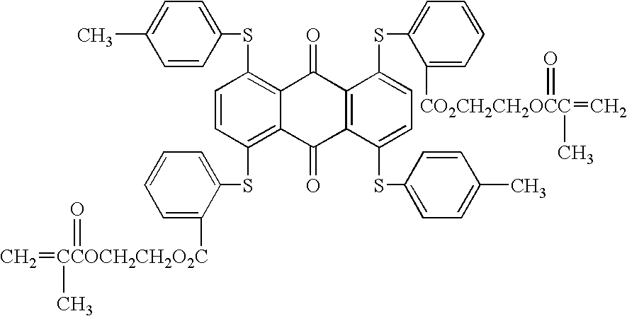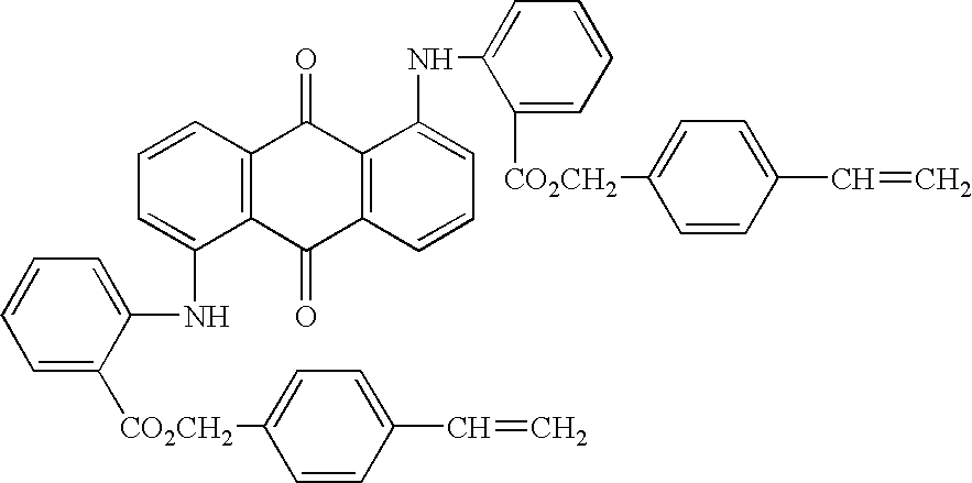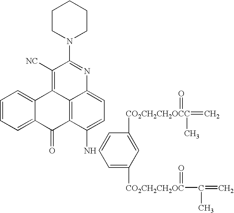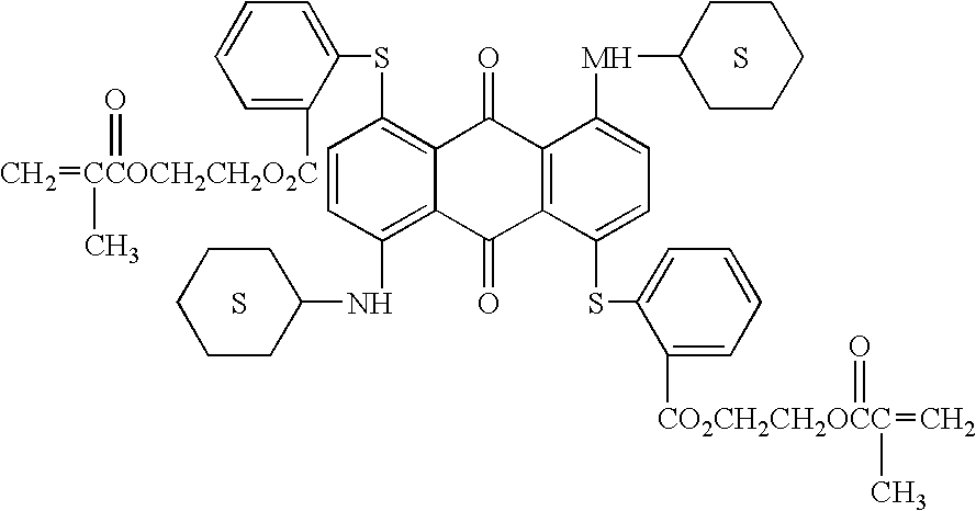 186 H —CH3 —CH3 4-CO2CH2CH2OCOC(CH3)═CH2 187 H —CH2CH3 —CH2CH3 3-CO2CH2CH(CH3)OCOCH═CH2 188 H —CH2CH3 —CH3 3,5-di-CO2CH2CH2— OCOC(CH3)═CH2 189 H —C6H5 —CH3 2,5-di-CO2(CH2)6OCOC(CH3)═CH2 190 H —C4H9-n H 2-CO2CH2—C6H4-4-CH═CH2 191 H —C6H11 H 2-CO2CH2CH2OCONHC(CH3)2— C6H4-3-C(CH3)═CH2 192 H —C6H5 H 2-CO2CH2CH2OCOCH═CH—CO2H 193 H —C6H4-2-(CO2CH2CH2— H H OCOCH═CH2) 194 H —C6H3-3,5-bis(CO2CH2— H H C6H4—CH═CH2) 195 H —C6H4-2-(CO2CH2CH2— H 2-(CO2CH2CH2OCOC(CH3)═CH2) OCOC(CH3)═CH2) Diarylamino Terephthlate Colorants of Formula XXIX Example No. R40 X 196 H —CH2C(CH3)2CH2OCOC(CH3)═CH2 197 H —CH2—C6H10-4-(CH2—OCOCH═CH2) 198 H —CH2CH2(OCH2CH2)2OCOC(CH3)═CH2 199 H —CH2CH(CH3)OCOC(CH3)═CH2 200 H —CH2CH(OH)CH2OCOCH═CH2 201 H —CH2CH2OCONHC(CH3)2—C6H4-3-C(CH3)═CH2 202 H —CH2CH2OCONHCOC(CH3)═CH2 203 4-CH3 —CH2CH2OCOC(CH3)═CH2 204 4-Cl —CH2—C6H4-4-CH═CH2 205 4-Br —CH2CH(CH3)OCOCH═CH2 206 3-C2H5 —CH2CH2OCONH(CH2)6OCOC(CH3)═CH2 207 4-C6H5 —CH2CH2OCOCH═CH—C6H5 208 2-CH3 —CH2CH2OCOCH═CH—CH3 209 2,5-di-CH3 —CH2CH2OCOCH═CH—CO2H 210 4-OC2H5 —CH2CH2OCOC(CH3)2NHCOC(CH3)═CH2 EXAMPLE 211 EXAMPLE 212 EXAMPLE 213 EXAMPLE 213 EXAMPLE 214 EXAMPLE 215 2(3),16(17)-di-[CO2CH2CH2—OCOC(CH3)═CH2]-PcCu Pc = phthalocyanine EXAMPLE 216 2(3),9(10),16(17),23(24)-Tetra[2′-CO2CH2CH2—O—COC(CH3)═CH2)phenoxy]-PcCu PC = Phthalocyanine COATING EXAMPLES