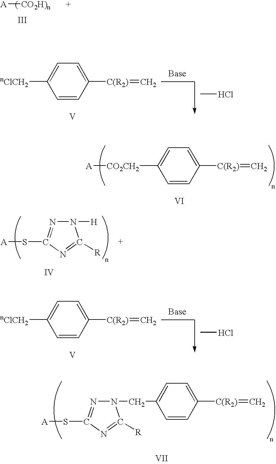 with 4-chloromethylstyrene compounds having the structure ClCH2—C6H4-p-C(R2)═CH2in the presence of a base, wherein A, R, R2and n are defined above.
