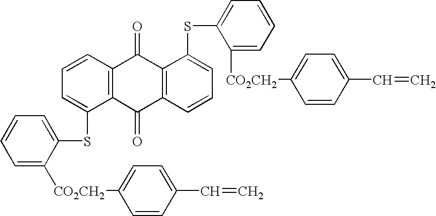 A, is a mono-, di-, tri- or tetravalent anthraquinone, anthrapyridone, or anthrapyridine chromophore; Y is —R1—O-Q, the photopolymerizable group —CH2—C6H4-p-C(R2)═CH2or Q; R is hydrogen, C1–C6alkyl, aryl and C3–C8cycloalkyl; R1is C2–C8alkylene, —(—CH2CH2O—)m—CH2CH2— or 1,4-cyclohexylenedimethylene; R2is hydrogen or C1–C6alkyl; n is 1 to 4; m is 1–3; Q is a photopolymerizable group selected from an organic radical having the formula: