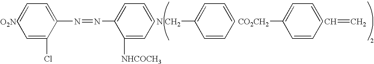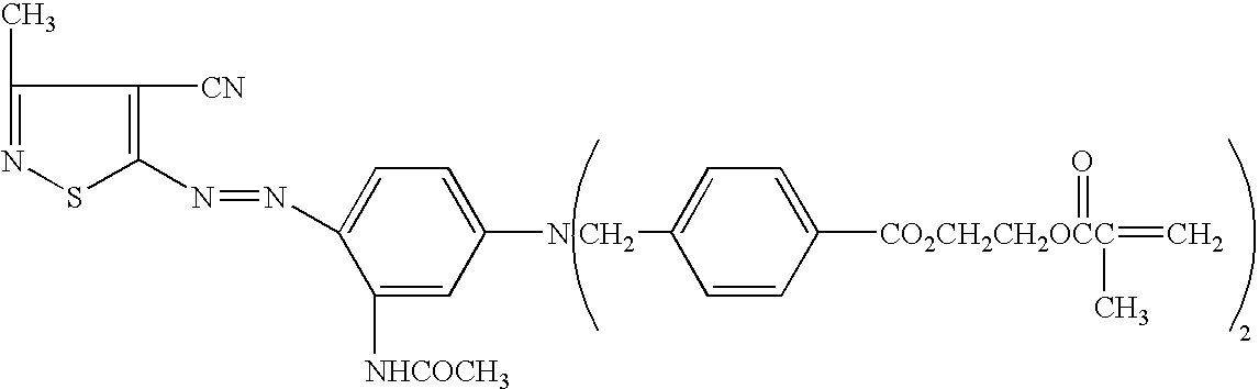 Azo Colorants of Formula XIII Example No. D R15 R16 R17 25 4-NO2-phenyl H —CH2—C6H4-4-CO2—CH2CH2— —CH2—C6H4-4-CO2—CH2CH2— OCOC(CH3)═CH2 OCOC(CH3)═CH2 26 2-Cl-4-NO2-phenyl 3-CH3 —CH2—C6H4-4-CO2—CH2CH2— —CH2—C6H4-4-CO2—CH2CH2— OCOC(CH3)═CH2 OCOC(CH3)═CH2 27 2-Br-4-CN-phenyl 3-NHCOCH3 —CH2—C6H4-4-CO2—CH2CH2— —CH2—C6H4-4-CO2—CH2CH2— OCOC(CH3)═CH2 OCOC(CH3)═CH2 28 2,6-di-CN-4-NO2-phenyl 3-NHCOCH3 —CH2—C6H4-4-CO2—CH2CH2— —CH2—C6H4-4-CO2—CH2CH2— OCOC(CH3)═CH2 OCOC(CH3)═CH2 29 2-Br-4,6-di-NO2-phenyl 2-OCH3-5-NHCOCH3 —CH2—C6H4-4-CO2—CH2CH2— —CH2—C6H4-4-CO2—CH2CH2— OCOC(CH3)═CH2 OCOC(CH3)═CH2 30 2-Cl-4-CH3SO2-phenyl 3-NHCOCH3 —C2H5 —CH2—C6H4-4-CO2—CH2CH2— OCOC(CH3)═CH2 31 2-CN-4-CH3SO2-phenyl 3-NHCOCH3 —C2H5 —CH2—C6H4-4-CO2—CH2CH2— OCOC(CH3)═CH2 32 2-CN-4-CH3SO2-phenyl 3-CH3 —C2H5 —CH2CH2O—C6H3-3,5-bis- (—CO2CH2—C6H4-4-CH═CH2) 33 2-Br-4-NO2-phenyl 3-NHCOCH3 —CH2—C6H4-4-(CO2—CH2— —CH2—C6H4-4-(CO2—CH2— C6H4-4-CH═CH2) C6H4-4-CH═CH2) 34 5-C2H5S-1,3,4- 3-NHCOCH3 —CH2—C6H4-4-(CO2—CH2— —CH2—C6H4-4-(CO2—CH2— thiadiazol-2-yl C6H4-4-CH═CH2) C6H4-4-CH═CH2) 35 6-CH3SO2- 3-NHCOCH3 —CH2—C6H4-4-(CO2—CH2— —CH2—C6H4-4-(CO2—CH2— benzothiazol-2-yl C6H4-4-CH═CH2) C6H4-4-CH═CH2) 36 5,6-di-Cl- 3-NHCOCH3 —CH2—C6H4-4-(CO2—CH2— —CH2—C6H4-4-(CO2—CH2— benzothiazol-2-yl C6H4-4-CH═CH2) C6H4-4-CH═CH2) 37 5-NO2-benzothiazol-2-yl 3-NHCOCH3 —CH2—C6H4-4-(CO2—CH2— —CH2—C6H4-4-(CO2—CH2— C6H4-4-CH═CH2) C6H4-4-CH═CH2) 38 4-Br-3-CH3-iso- 3-NHCOCH3 —CH2—C6H4-4-(CO2—CH2— —CH2—C6H4-4-(CO2—CH2— thiazol-5-yl C6H4-4-CH═CH2) C6H4-4-CH═CH2) 39 3-CH3-4-CN-iso- 3-NHCOCH3 —CH2—C6H4-4-(CO2—CH2— —CH2—C6H4-4-(CO2—CH2— thiazol-5-yl C6H4-4-CH═CH2) C6H4-4-CH═CH2) 40 3-SCH3-1,2,4- H —CH2CH2—CO2—CH2CH2— —CH2CH2—CO2—CH2CH2— thiadiazol-5-yl OCO(CH3)═CH2 OCO(CH3)═CH2 41 5-NO2-thiazol-2-yl 3-CH3 —CH2CH2—C6H4-2-(CO2— —C2H5 CH2—C6H4-4-CH═CH2) 42 2-CH3CO-4-NO2- 3-NHCOCH3 —CH2CH2S—C6H4-2-(CO2— —CH2CH2S—C6H4-2-(CO2— thien-5-yl CH2CH2—C6H4-4-CH═CH2) CH2CH2—C6H4-4-CH═CH2) 43 4-CH3CO-2-NO2- 3-CH3 —CH2CH2S—C6H4-2-(CO2— —CH2CH2S—C6H4-2-(CO2— thien-5-yl CH2—C6H4-4-CH═CH2) CH2—C6H4-4-CH═CH2) 44 2,4-di-CH3O2C-4- H —CH2CH2O—C6H4-2-(CO2— —C2H5 CH3-thien-5-yl CH2CH2OCO—CH═CH2) 45 5-NO2-benziso- 3-NHCOC2H5 —CH2—C6H4-4-(CO2— —C2H5 thiazol-3-yl CH2CH2CH2OCO═CH2) 46 4-phthalimidyl 3-NHCOCH3 —CH2CH2SO2—C6H4-2-(CO2— CH2—CH(CH3)—OCO—CH═CH2) 47 4-Br-N-C2H5-5-phthalimidyl 3-CH3 —C2H5 Methine Colorants of Formula XV Example No. AM R15 R16 R17 48 ═C(CN)CN H —C2H5 —CH2—C6H4-4-(CO2—CH2CH2— OCOC(CH3)CH═CH2) 49 ═C(CN)SO2CH3 3-CH3 —CH2—C6H4-4-(CO2—CH2CH2— —CH2—C6H4-4-(CO2—CH2CH2— OCOC(CH3)CH═CH2) OCOC(CH3)CH═CH2) 50 ═C(CN)CO2CH3 3-CH3 —CH2CH2O—C6H3-3,5-bis- —C2H5 (—CO2CH2—C6H4-4-CH═CH2) 51 ═C(CN)CONH2 3-CH3 —C2H5 —CH2CH2S—C6H4-2(CO2— CH2C6H4-4-CH═CH2) 52 ═C(CN)CO2C2H5 3-CH3 —CH2C6H5 —CH2—C6H4-4-(CO2—CH2— C6H4-4-CH═CH2) 53 ═C(CN)CN 3-CH3 —C2H5 54 ═C(CN)CO2CH3 3-CH3 —CH2CH2S—C6H4-2-(CO2— —CH3 CH2—C6H4-4-CH═CH2) 55 ═C(CN)CN 2,5-di-OCH3 —CH2—C6H4-4-(CO2—CH2CH2— —CH2CH2O—C6H4-2-(CO2— OCOC(CH3)CH═CH2) CH2CH2—OCO—CH═CH2) 56 ═C(CN)CO2C2H5 H —CH2CH2—CO2CH2—C6H4— —CH2CH2—CO2CH2—C6H4— 4-CH═CH2 4-CH═CH2 3-Aryl-2,5-Dioxypyrroline Colorants of Formula XVII Example No. R15 R16 R16′ R17 57 H —CH2CH3 H —CH2—C6H4-4-(CO2—CH2CH2— OCOC(CH3)═(CH2) 58 H —CH2CH3 —CH3 —C6H4-4-(CO2—CH2—C6H4-4-CH═CH2) 59 H —CH2—C6H4-4-(CO2—CH2—C6H4— —C2H5 —CH2—C6H4-4-(CO2—CH2—C6H4— 4-CH═CH2) 4-CH═CH2) 60 H —CH2CH2S—C6H4-2-(CO2—CH2CH2— —CH2C6H5 —CH2CH2S—C6H4-2-(CO2—CH2CH2— OCOC(CH3)═CH2) OCOC(CH3)═CH2) 61 H —CH2CH2O—C6H3-3,5-bis-(—CO2CH2— H —C2H5 C6H4-4-CH═CH2) 62 —CH3 —CH2—C6H4-4-(CO2—CH2CH2— R16 —C2H5 OCOCH═CH2) ANTHRAQUINONE COLORANTS OF FORMULA XXa Example No. R28 L4 X 63 H 1-NH— —CH2—C6H4-4-CH═CH2 64 H 2,7-di-S— —CH2—C6H4-4-CH═CH2 65 H 1,5-di-NH— —CH2—C6H4-4-CH═CH2 66 H 1,8-di-NH— —CH2—C6H4-4-CH═CH2 67 H 1,5-di-S— —CH2—C6H4-4-CH═CH2 68 H 1,5-di-S— —CH2CH(CH3)OCOC(CH3)═CH2 69 H 1,5-di-NH— —CH2—CH(OH)CH2—OCONH— CH2CH2OCOCH═CH2 70 1-NH2-2-Br 4-NH —CH2—C6H4-4-C(CH3)═CH2 71 1-NH2-2-SO2C6H5 4-NH —CH2CH(CH3)OCOCH═CH2 72 1-NH2-2-S—C6H5 4-NH —CH2CH2CH2OCOC(CH3)═CH2 73 1-NH2-2-CN 4-NH —(CH2)4—OCONHCOC(CH3)═CH2 74 1-NHCH3 4-NH —CH2C(CH3)2CH2OCOC(CH3)═CH2 75 1-NHCH2CH(CH3)2 4-S— —CH2—C6H10-4-(CH2OCOC(CH3)═CH2) 76 1-NH2-4-OH 2-O— —(CH2)4—OCOCH═CH2 77 H 1,4-di-S— —CH2-1,4-C6H4CH═CH2 78 1-NH2-4-NHC6H5 2-S— —CH2CH2OCONHC(CH3)2—C6H4- 3-C(CH3)═CH2 79 1-NH2, 4-S-benzo- 2-SO2— —CH2—1,4-C6H4—CH═CH2 thiazol-2-yl 80 1,5-di-S—C6H5 4,8-di-S— —CH2CH(CH3)—OCOC(CH3)═CH2 81 1,8-di-NH2-4,5- 2,7-di-O— —CH2CH2OCH2CH2OCOC(CH3)═CH2 di-OH 82 1,8-di-NH2-4,5-di-OH 2,5-di-S— 83 1,8-di-OH 4,5-di-S— —CH2CH2(OCH2CH2)3OCOC(CH3)═CH2 Anthraquinone Colorants of Formula XXb Example No. R28 R29 L4 —CO2X 84 H H 1-S— 2′-CO2CH2CH(CH3)OCOC(CH3)═CH2 85 H H 1,5-di-NH— 2′-CO2CH2CH(CH3)OCOCH═CH2 86 H 4′-Br 1,5-di-NH— 2′-CO2CH2CH(CH3)OCONHC(CH3)2—C6H4 3-C(CH3)═CH2 87 H H 1,5-di-S— 3′-CO2CH2CH2OCOC(CH3)═CH2 88 H H 1,8-di-S— 4′-CO2CH2CH2CH2OCOCH═CH—CO2H 89 H 2′-CH3 1,4-di-S— 4′—CO2CH2—C6H4-4-CH═CH2 90 H H 1,4,5,8-tetra-S— 2′-CO2CH2CH(CH3)OCOC(CH3)═CH2 91 1,5-di-NH— H 4,8-di-S— 2′-CO2CH2CH(CH3)OCOC(CH3)═CH2 C6H11 92 1-NH2-2-Br H 4-NH— 2′-CO2CH2CH(CH3)OCOC(CH3)═CH2 93 1-NH2-2-OCH3 H 4-S— 2′-CO2CH2—C6H4-4-C(CH3)═CH2 94 1-NH2-2- H 4-NH— 2′-CO2CH2CH(C
