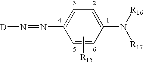 wherein D is the residue of an aromatic or heteroaromatic, diazotizable amine which has been diazotized and coupled with an electron rich coupling component H-Z and is preferably derived from the aromatic and heteroaromatic classes of unsubstituted and substituted anilines, 1-naphthylamines, 1-aminoanthraquinones, 4-aminoazobenzenes, 2-aminothiazoles, 2-aminobenzothiazoles, 3-amino-2,1-benzisothiazoles, 2-aminothieno [2,3-d]thiazoles, 5-aminopyrazoles, 4-aminopyrazoloisothiazoles, 2-amino-1,3,4-thiadiazoles, 5-amino-1,2,3-thiadiazoles, 5-amino-1,2,3-triazoles, 2-amino-1,3,4-triazoles, 2(5) aminoimidazoles, 3-aminopyridines, 2(3)aminothiophenes, 2(3)aminobenzo [5]thiophenes, 2-aminothieno[3,2-5]thiophenes, 3-aminothieno[2,3]-isothiazoles, 3-amino-7-benz-2,1-isothiazoles, 3-aminoisothiazolo[3,4-d]pyridines, 3(4)-aminophthalimides and 5(6) amino-1,2-benzisothiazolon-1,1-dioxides; wherein the substituuents which are present on D are selected from C1–C6-alkyl; C1–C6-alkoxy; C3–C8-cycloalkyl; halogen; C2–C6-alkoxycarbonyl;