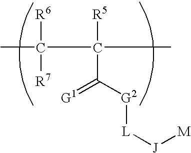 wherein R5is H or (C1–C6)alkyl; R6is H or (C1–C6)alkyl; R7is H or (C1–C6)alkyl; G1is O or S; G2is O, S or NR8, wherein R8is H or (C1–C6)alkyl; L is one or more units of ethylene glycol, divalent (C1–C20) alkyl, divalent (C6–C12) aryl, divalent (C1–C20alkoxy) C1–C20alkyl , divalent (C1–C10alkyl)C6–C12aryl, divalent (C6–C12aryl)C1–C10alkyl, divalent (C1–C10alkoxy)C6–C12aryl, or divalent (C6–C12aryloxy)C1–C10alkyl; J is a carboxylate or a sulfonate group; and M is an ammonium or phosphonium cationic component according to the structure: