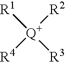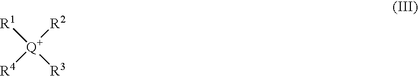 wherein Q is nitrogen or phosphorus; R1, R2, R3, and R4are each independently a C1–C20alkyl, a (C6–C12aryl)C1–C10alkyl group, a (C1–C10alkyl)C6–C12aryl group, or a C6–C12aryl group. Suitable C1–C20alkyl groups include, for example, methyl, ethyl, n-propyl, iso-propyl, n-butyl, t-butyl, n-pentyl, n-hexyl, n-heptyl, n-octyl, lauryl, stearyl, and the like. Non-limiting examples of phosphonium or ammonium cations include, tetramethyl phosphonium, tetraethyl phosphonium, tetrapropyl phosphonium, tetrabutyl phosphonium, triethylmethyl phosphonium, tributylmethyl phosphonium, tributylethyl phosphonium, trioctylmethyl phosphonium, trimethylbutyl phosphonium trimethyloctyl phosphonium, trimethyllauryl phosphonium, trimethylstearyl phosphonium, triethyloctyl phosphonium, or their ammonium analogs, and the like; and aromatic phosphoniums such as tetraphenyl phosphonium, triphenylmethyl phosphonium, triphenylbenzyl phosphonium, tributylbenzyl phosphonium, or their ammonium analogs, and the like.