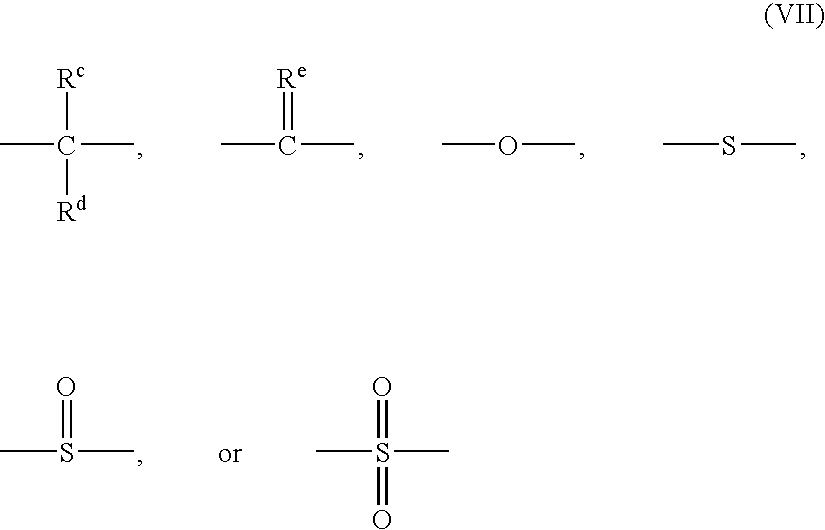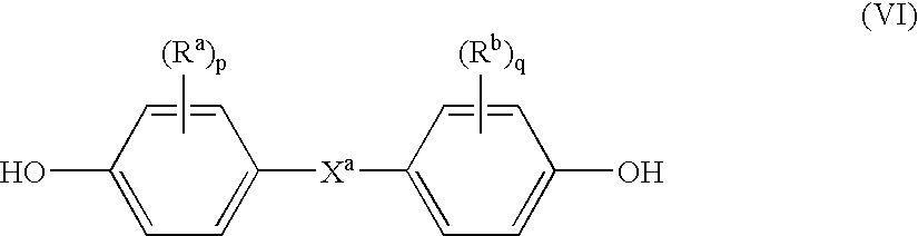 wherein Raand Rbeach independently represent hydrogen, a halogen atom, preferably bromine, or a monovalent hydrocarbon group; p and q are each independently integers from 0 to 4; and Xarepresents one of the groups of formula (VII):