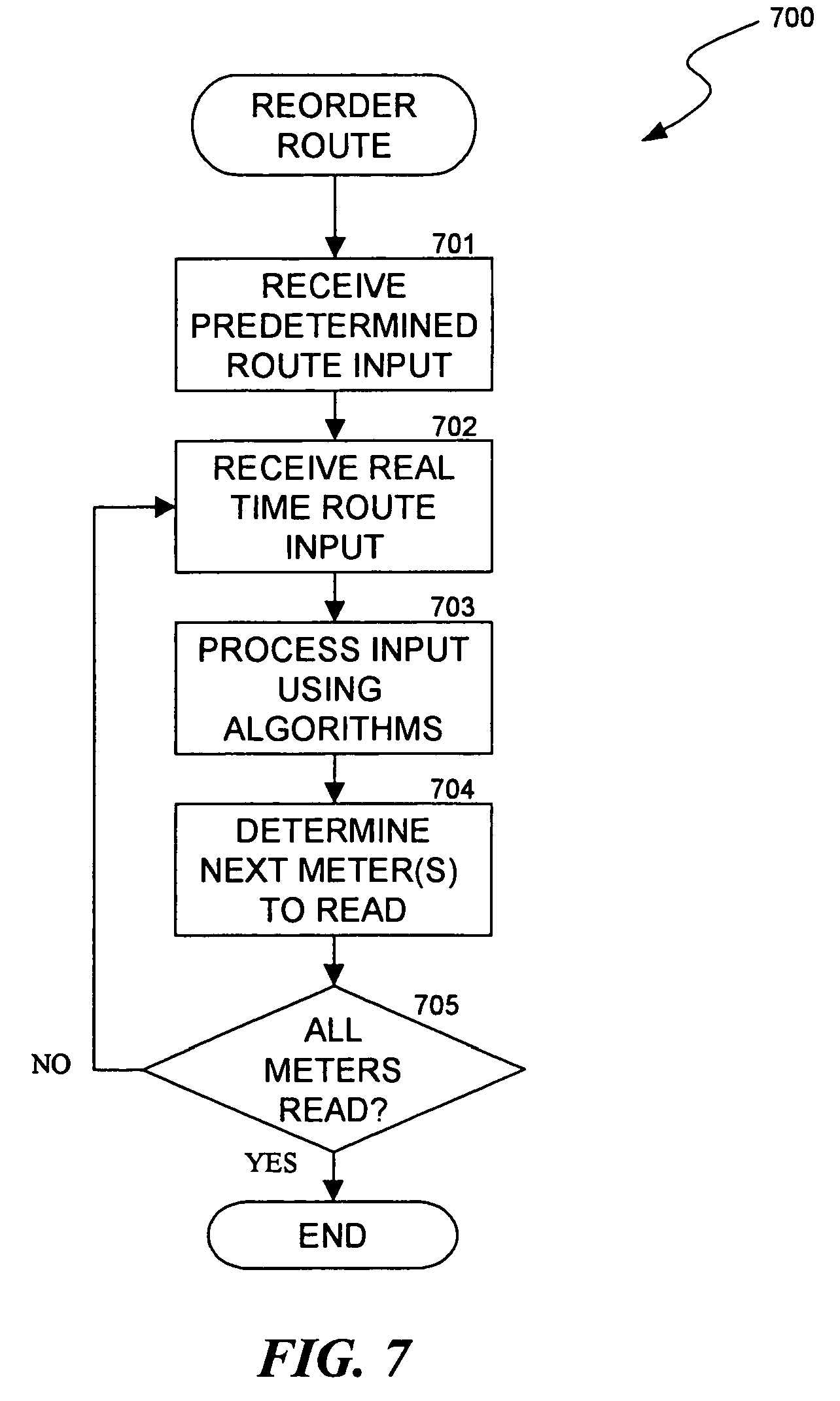 means for receiving information associated with a meter reading route; means for identifying a first meter or first set of meters to be read on the meter reading route; means for receiving input used in identifying a next meter or set of meters to be read on the meter reading route, wherein the means for receiving is configured for receiving input while the meter reading route is in progress, and wherein the input does not include Global Positioning System (GPS) data, or includes both GPS data and additional data for use in automatically identifying the next meter or set of meters to be read on the meter reading route; means for identifying a next meter or set of meters to be read on the meter reading route, wherein the identifying is based on the input received by the means for receiving, and wherein the means for identifying is configured for identifying a next meter or set of meters while the meter reading route is in progress; and means for communicating with the next identified meter or set of meters, wherein the communicating includes receiving meter reading data from the identified meter. 26. The system of 27. The system of 28. The system of 29. A computer-readable medium containing instructions for performing a method associated with sequencing an order of endpoints to be read while performing a meter reading route using an at least partially automated mobile data collection system, the method comprising: