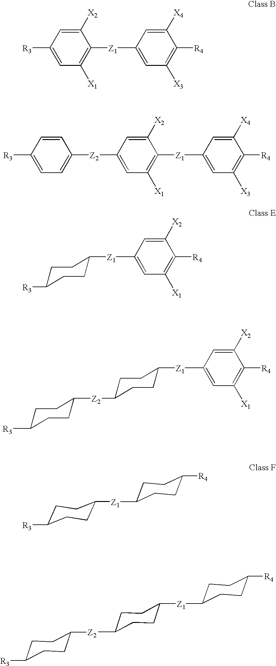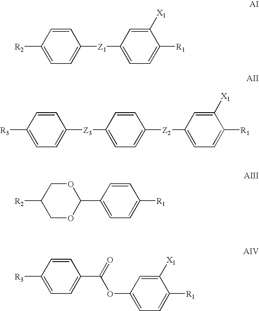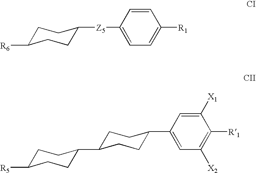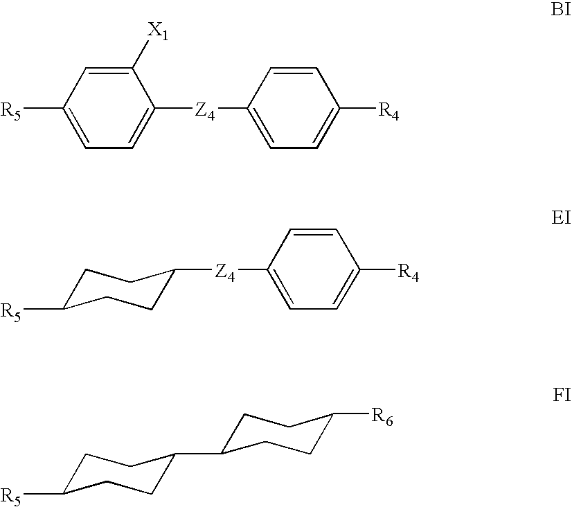 13 AI 4-pentyl-4′-cyanobiphenyl 12 AI 4-heptyl-4′-cyanobiphenyl 7 AIV 3-fluoro-4-cyanophenyl-4′-ethylbenzoate 5 AIV 3-fluoro-4-cyanophenyl-4′-propylbenzoate 5 AIV 3-fluoro-4-cyanophenyl-4′-butylbenzoate 8 AIV 4-cyanophenyl-4′-ethylbenzoate 10 AIV 4-cyanophenyl-4′-butylbenzoate 7 AIV 3-fluoro-4-cyanophenyl-4′-trans-ethyl- cyclohexylbenzoate 7 AIV 3-fluoro-4-cyanophenyl-4′-trans-propyl- cyclohexylbenzoate 3 AIV 3-fluoro-4-cyanophenyl-4′-trans-butyl- cyclohexylbenzoate 16 EI 4-pentylphenyl-4′- pentylcyclohexylcarboxylate 4 BI 4,4′-Bis (4-propyl-cyclohexyl)-biphenyl 3 BI 4′-(4-pentyl-cyclohexyl)-4-(4-propyl- cyclohexyl)-biphenyl TN-1= 71.3° C.; Uλ/2= 16.8 V at T = 20° C.