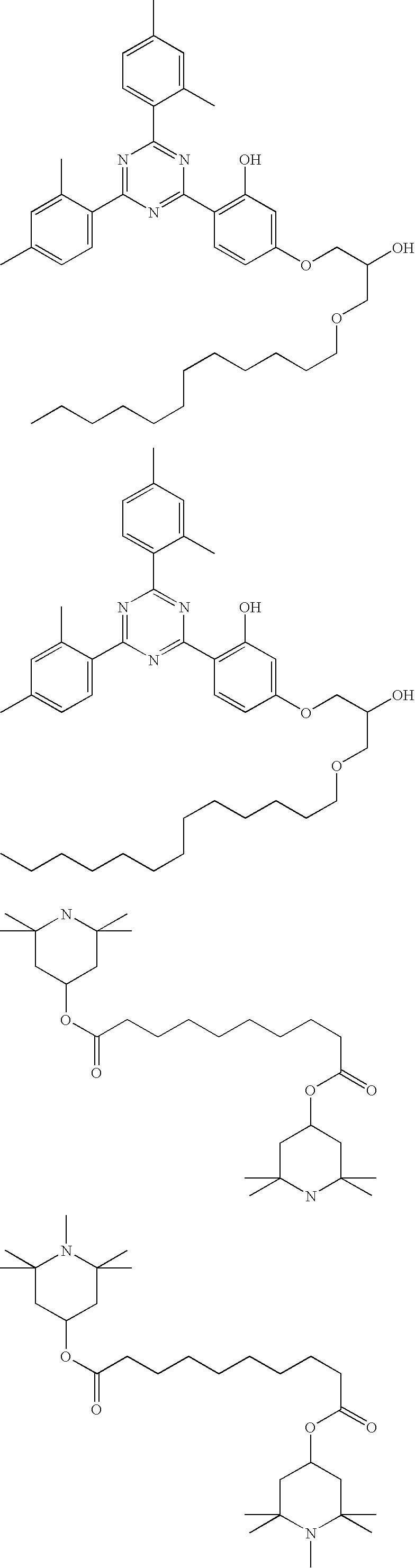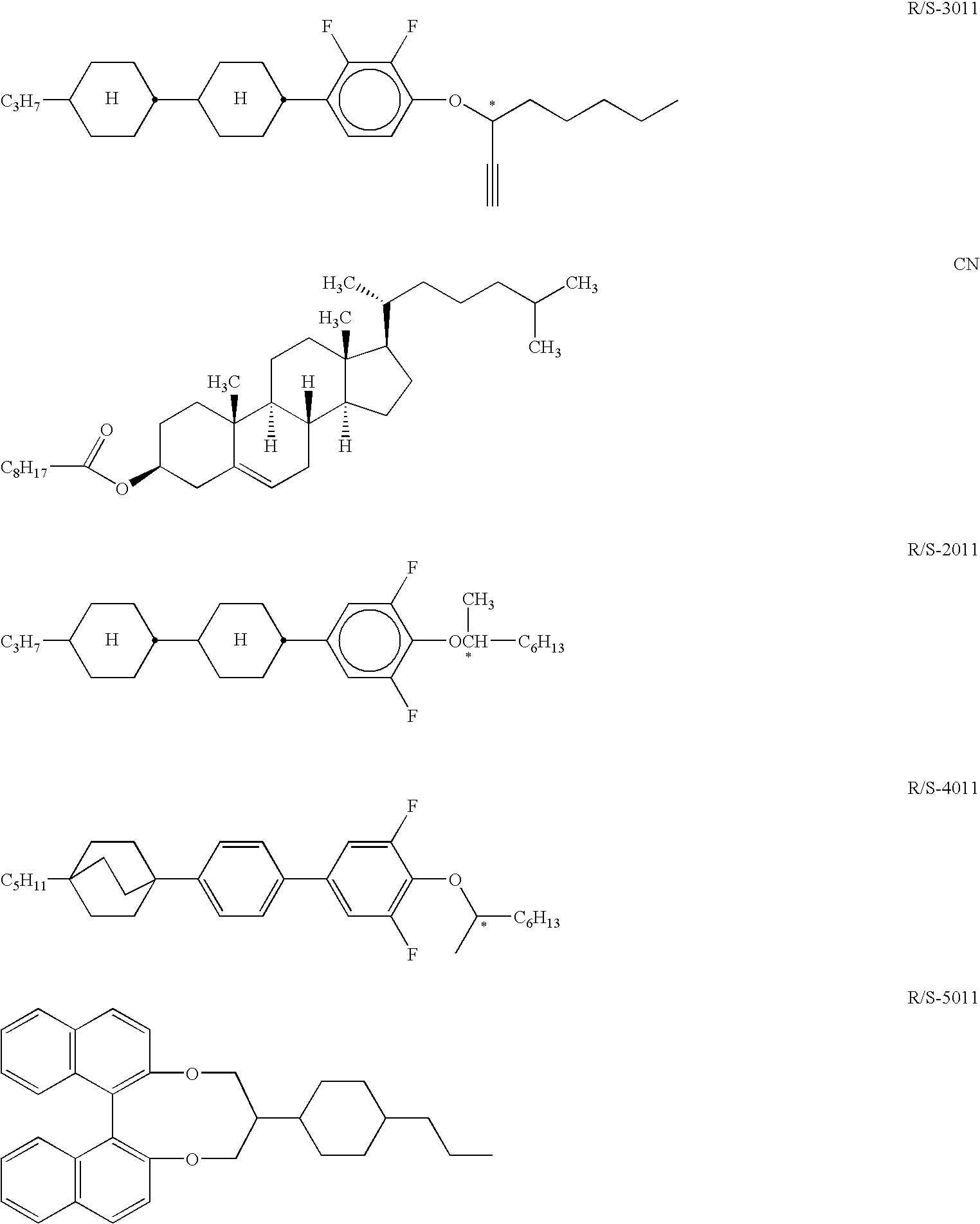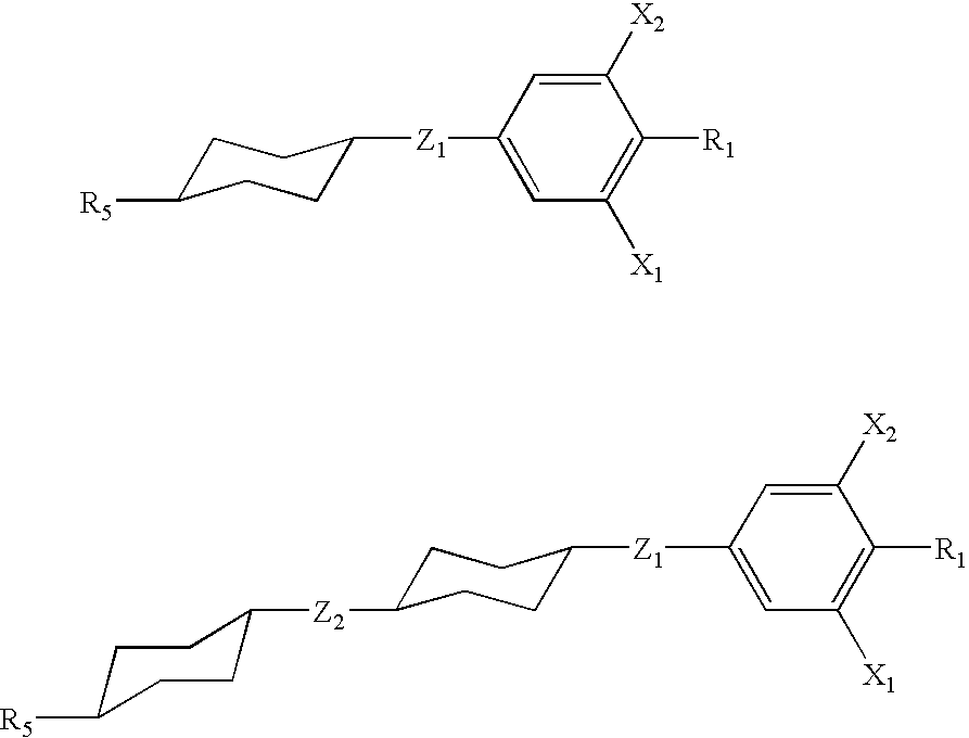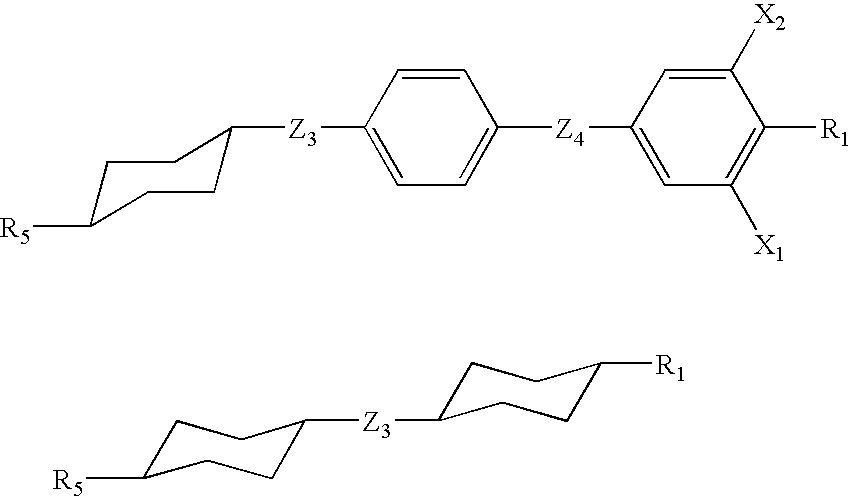 13 AI 4-pentyl-4′-cyanobiphenyl 12 AI 4-heptyl-4′-cyanobiphenyl 7 AIV 3-fluoro-4-cyanophenyl-4′-ethylbenzoate 5 AIV 3-fluoro-4-cyanophenyl-4′-propylbenzoate 5 AIV 3-fluoro-4-cyanophenyl-4′-butylbenzoate 8 AIV 4-cyanophenyl-4′-ethylbenzoate 10 AIV 4-cyanophenyl-4′-butylbenzoate 7 AIV 3-fluoro-4-cyanophenyl-4′-trans-ethyl- cyclohexylbenzoate 7 AIV 3-fluoro-4-cyanophenyl-4′-trans-propyl- cyclohexylbenzoate 3 AIV 3-fluoro-4-cyanophenyl-4′-trans-butyl- cyclohexylbenzoate 16 EI 4-pentylphenyl-4′- pentylcyclohexylcarboxylate 4 BI 4,4′-Bis (4-propyl-cyclohexyl)-biphenyl 3 BI 4′-(4-pentyl-cyclohexyl)-4-(4-propyl- cyclohexyl)-biphenyl TN-1= 71.3° C.; Uλ/2= 16.8 V at T = 20° C.