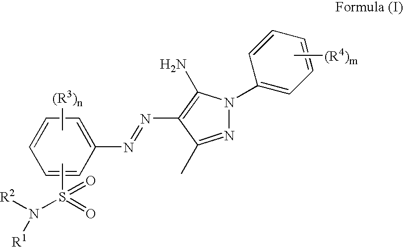 The present invention has been made in view of the above various problems and has the object of providing an azo compound which has high heat resistance and light fastness and is highly soluble in water or an organic solvent. Another object of the invention is to provide a colorant-containing curable composition superior in the molar extinction coefficient and chromatic value of a dye, light fastness, heat resistance and pattern forming characteristics (developing characteristics), and a color filter and a method of producing the color filter. According to the invention, a compound having a specific structure having the following aminopyrazole skeleton and a sulfonamide group at the same time and a colorant-containing curable composition for color filter use containing the compound are provided. According to a first aspect of the invention, there is provided an azo compound represented by the following formula (I): wherein R1and R2respectively represent a hydrogen atom, an alkyl group having 1 to 21 carbon atoms, an alkenyl group having 2 to 21 carbon atoms, an aryl group having 6 to 21 carbon atoms or an aralkyl group having 7 to 21 carbon atoms and R1and R2may form a hetero ring with nitrogen atoms bonded therewith; R3represents a halogen atom, a trihalomethyl group, an alkoxy group having 1 to 21 carbon atoms or a nitro group; R4represents a halogen atom or a —SO3M group; M represents a metal atom cation or a cation comprising a nitrogen-containing compound; m denotes an integer from 0 to 5; and n denotes an integer from 0 to 4. According to the invention, an azo compound which has high heat resistance and light fastness and is also superior in solubility in water or an organic solvent can be provided. According to a second aspect of the invention, there is provided a colorant-containing curable composition comprising a colorant, wherein the colorant contains a compound represented by the formula (I). According to a third aspect of the invention, there is provided a positive type colorant-containing curable composition comprising a compound represented by the above formula (I), a photosensitizer and a solvent. According to a fourth aspect of the invention, there is provided a positive type colorant-containing curable composition comprising a compound represented by the above formula (I), a photo-acid generating agent and a hardener. According to a fifth object of the invention, there is provided a color filter comprising a compound represented by the formula (I). According to a sixth aspect of the invention, there is provided a method of producing a color filter, the method comprising applying the above colorant-containing curable composition to a support, then exposing the composition to light through a mask and developing the composition to form a pattern. This production method may comprise a step of curing the pattern by heating and/or exposure according to the need and may be a method in which these steps are repeated plurally. According to the invention, an azo compound having high heat resistance and light fastness and high solubility in water or an organic solvent, a colorant-containing curable composition superior in the heat resistance, light fastness and molar extinction coefficient (chromatic value) of the colorant and pattern-forming characteristics, a color filter and a simple and high cost performance method of producing a color filter can be provided. An azo compound, a colorant-containing curable composition, a color filter and a method of producing the color filter will be hereinafter explained in detail. <<Colorant-containing Curable Composition>> The colorant-containing curable composition (hereinafter called “the composition of the invention” if necessary) is a colorant-containing curable composition containing a colorant, wherein the colorant contains a compound (azo compound of the invention) represented by the following formula (I)). wherein R1and R2respectively represent a hydrogen atom, an alkyl group having 1 to 21 carbon atoms, an alkenyl group having 2 to 21 carbon atoms, an aryl group having 6 to 21 carbon atoms or an aralkyl group having 7 to 21 carbon atoms and R1and R2may form a hetero ring with nitrogen atoms bonded therewith; R3represents a halogen atom, a trihalomethyl group, an alkoxy group having 1 to 21 carbon atoms or a nitro group; R4represents a halogen atom or a —SO3M group; M represents a metal atom cation or a cation comprising a nitrogen-containing compound; m denotes an integer from 0 to 5; and n denotes an integer from 0 to 4. The composition of the invention contains the compound (azo compound of the invention) represented by the above formula (I) and can hence exhibit high performance as to the heat resistance, light fastness and molar extinction coefficient (chromatic value) of the colorant. Also, the composition of the invention is improved particularly in chromatic value, allowing the amount of the dye to be decreased. This makes it possible to increase the content of other additives, with the result that various performances of a resist can be improved. Moreover, the composition of the invention can improve the developing characteristics and residual film rate of an exposed portion and an unexposed portion and can therefore exhibit good pattern-forming characteristics. Also, the composition of the invention is free from fear of a deterioration in the aforementioned various performances in production processes, ensuring high productivity. The composition of the invention contains at least a colorant and is usually used together with a solvent. Also, the composition of the invention may contain a binder, a polymerizable compound (monomer), a photoinitiator, a crosslinking agent, photosensitizer and a photo-acid generating agent according to the need. Specifically, when the composition of the invention is a negative type composition, it may contain, besides the above colorant, a solvent, a polymerizable compound (monomer), a b
