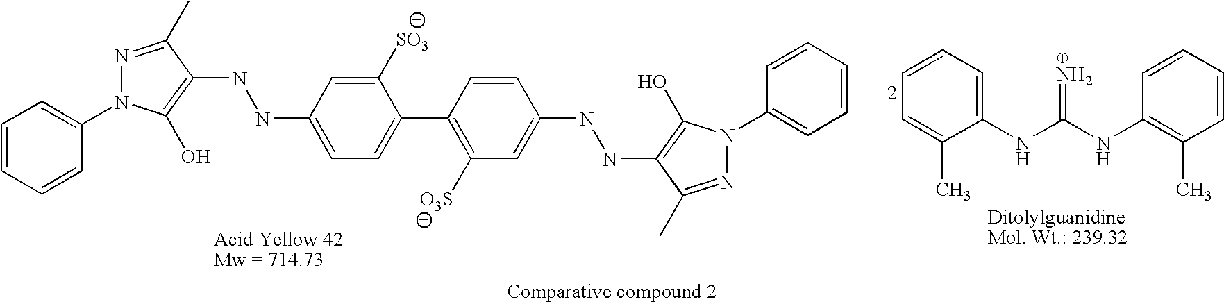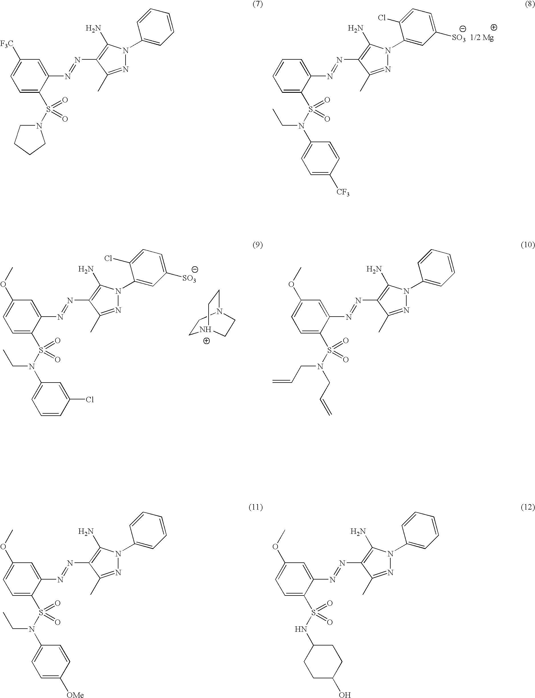 Unexposed Exposed Heat Light- portion portion resistance fastness developing residual ΔEab ΔEab ε Colorant characteristics film rate (200° C./1 h) (2 M lux · h) (1 · mol−1cm−1) ε/Mw Example 1 Specific example (22) 100 100 5.08 4.89 23900 49.7 Example 2 Specific example (2) 100 100 1.81 3.40 17000 38.7 Example 3 Specific example (3) 100 99 2.51 1.35 17000 36.2 Example 4 Specific example (4) 100 100 2.81 3.20 15800 32.2 Example 5 Specific example (5) 100 99 2.30 2.20 15500 33.6 Example 6 Specific example (23) 100 99 3.60 3.10 16200 34.8 Example 7 Specific example (24) 100 98 4.50 3.55 18500 40.8 Example 15 Specific example (22) 100 99 5.60 5.10 23900 49.7 Example 16 Specific example (22) 100 98 5.20 5.05 23900 49.7 Comparative Example 1 Comparative compound 1 100 68 36.80 28.60 16500 19.7 Comparative Example 2 Comparative compound 2 45 89 43.50 38.50 55300 46.3 Example 17