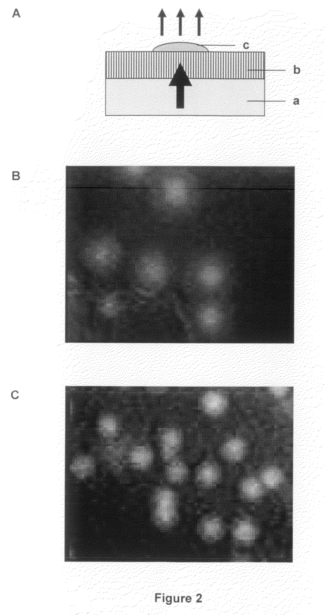 The arrays are then removed from the selective agar, and the cells on the array lysed in situ, their DNA cross-linked to the substrate. Then, standard nucleic acid hybridization is performed, using the functionality of the flow-through array as a rapid hybridization array, with a labelled oligonucleotide that detects transposon X by specific hybridization. The expected results are shown in FIG. 10—arrays 1G and 1H. Now, only strains that are captured by a specific antibody, are able to grow on the medium used and contain the transposon sequence are detected.