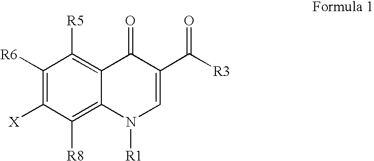 The aza nomenclature used herein follows the conventional nomenclature and is the position where the ring nitrogen is attached to the quinolone nucleus.
