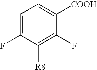 is treated with a strong, non-nucleophilic base. This base may be any base useful in permutational hydrogen-metal exchange. Preferred bases include lithium diisopropylamide (LDA), lithium 2,2,6,6-tetramethylpiperidide (LiTMP), lithium bis(trimethylsilyl)amide (LTSA), t-butoxide, or other known bases for this purpose. Suitable bases are known in the literature, and can be found in common reference texts as non-nucleophilic bases. Most preferred is LDA, which produces intermediates that are reasonably stable over a range of times and temperatures. It is preferred that the temperature of this reaction is from about −80° C. up to about 40° C., more preferably up to about room temperature, most preferably to about −40° C. Temperature may vary with the base used, for example the most preferred reaction temperature is about −65° C. with LDA. Reaction times may be up to about 24 hours, preferably about 2 hours, most preferably the process is carried on as soon as it is apparent that the resulting benzene derivative may proceed to the next step in the process. It is also preferred that this reaction take place under an inert atmosphere.