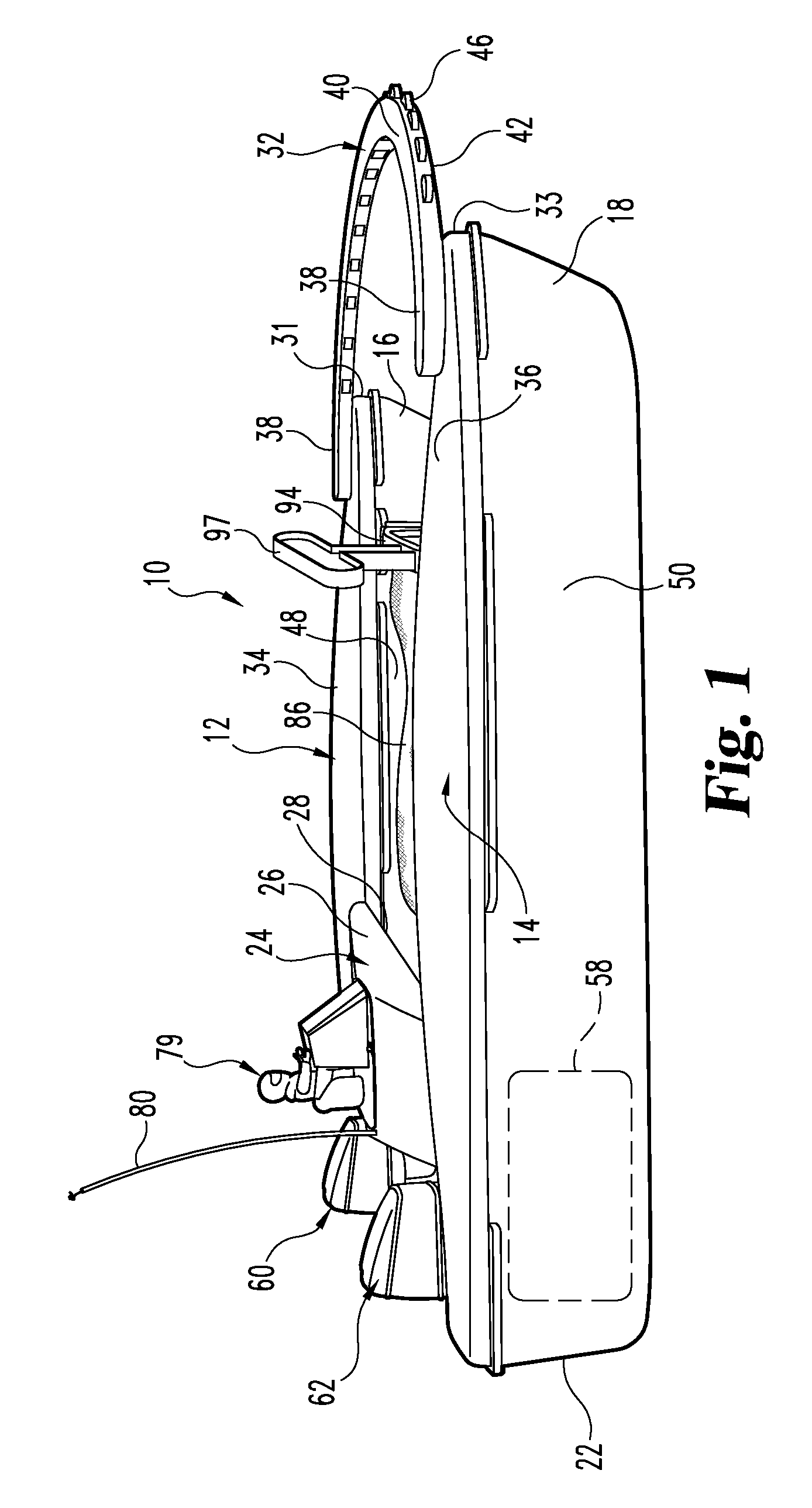 Pontoons 12 and 14 may be formed from any appropriate material such as fiberglass, plastics, metal, and the like so long as the pontoons provide buoyancy for the device 10. The pontoons 12 and 14 each have lower hulls 48 and 50 which mate with upper housings 34 and 36, respectively. The lower hulls 48, 50 and upper housings 34, 36 are fastened together, respectively, by either glue, heat welding or other means to form watertight, buoyant compartments. In one embodiment of the present invention, as shown by dashed lines 56 and 58, weights are incorporated in the aft end of the pontoons for a purpose to be described later. In another embodiment of the present invention, see FIG. 4A, this “weighting” is achieved by using thicker wall sections 55 and/or by creating added walls or ribs 57 to weight the stern greater than the bow. This weighting is non-linear with a greater proportion of the weight being provided to the stern half of the two pontoons 12 and 14.