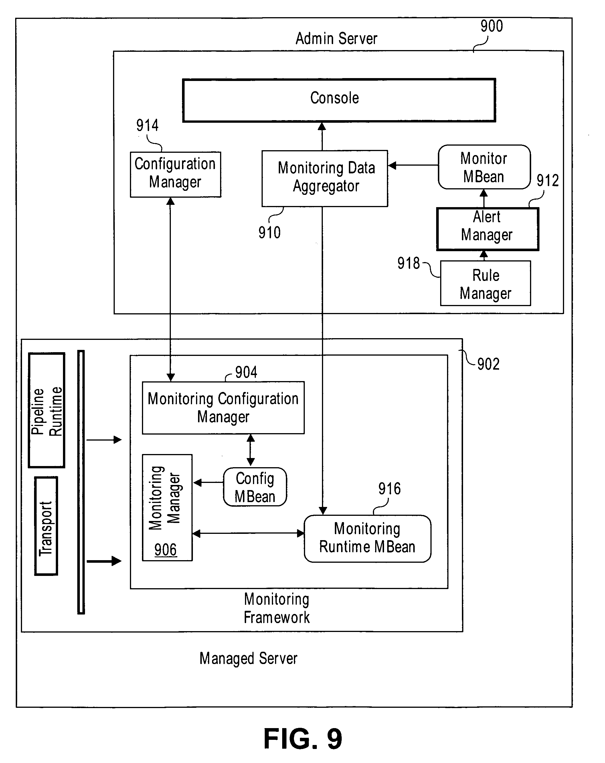 In one embodiment, a data aggregator 910 runs on an admin servers at regular intervals (configurable) and aggregates data from all the information from service bus segments in a given domain. The aggregated data are processed and classified into specific time intervals as specified in the configuration of each application. The console can display monitoring information uses the aggregated data. At regular interval the monitoring data publisher (not shown) publishes data to registered external applications for the purpose of archiving or external computing. A rule manager 918 is charged of storing rules and evaluates rules using the aggregated data. In one embodiment, when a rule is evaluated to true it calls the alert manager 912. The alert manager notifies other processes when a rule is evaluated to true. For example, it can send an email and/or post a message on a queue according to the action associated with the rule. In one embodiment and by way of illustration, the data aggregator 910 keeps less and less data in memory as the data get older. Windows can be defined to view the data with different precisions on different periods of time. For example, we define the following windows: 5 min, 1 h, 24 h. For a counter it means we are going to store for the last 5 min the all variations (may change that and decide to get variations by second for example or by 10 seconds). For the last hour the variations by 5 min. For the last 24 h the variations by hour. For any larger period the variation by day (implicit). With this configuration it means we need to store in memory an undetermined number of value for the last 5 min, +12 values for the last hour, +24 values for the last day and +1 value by day. So, for 365 days:˜=400 values. The aggregated data can be displayed in graphs on the console and/or used to trigger rules. In one embodiment, the user can interactively specify rules in the console. For example, the console can display a tree of monitored variables organized by services/stages/transport/quality of service which can be dragged and dropped inside an XQuery expression for the rule. Functions can also be dragged and dropped into the XQuery expression. In one embodiment, applications that want to use the monitoring framework to capture monitoring data can specify the list of attributes that need to be monitored and optionally specify a sliding window of time and the frequency of updates within that window to capture data. When a sliding window and an interval within that window are specified, the system can also be configured to maintain “Recent Activity Window”, which is a list of all monitoring entries that were made in the most recent time interval that is configured. In one embodiment, the system supports monitoring using counters and timers. In one embodiment, the configuration information defines the list of attributes that each application is monitoring. Every application (or application instance, as in the case of transports) can register itself with the monitoring framework. Registration can involve providing a unique name and a list of attributes (and the corresponding data types) that can be monitored and time window specifications. The framework can publish a schema for the configuration. In one embodiment, an admin server includes all of the runtime functionality provided by the framework. On an admin server this can include: aggregating data from all the managed servers; triage the data into respective time interval windows; compute statistics on the aggregated data; define an Management interface to provide access to the aggregated data; notify the Alert Manager of changes in data so rules can be triggered (or evaluate rules at regular interval); and provide a mechanism to publish monitoring data to external archival systems. On a service bus segment, the monitoring manager can: defines APIs for applications to record monitoring data; provide a runtime store for data; and expose its data through Management Interfaces. In one embodiment, in order to log monitoring values, applications (e.g., transport, pipeline stage) need to first retrieve a monitoring context for the respective application by passing in a unique application name. The monitoring context provides access to named counters and timers that provide methods to log data. For example, sample source code can look like this: ctx.getMonitoringService( ).getTimer(“execution_time”).start( ); ctx.getMonitoringService( ).getCounter(“nb_messages”).increment ( ); ctx.getMonitoringService( ).getTimer(“execution_time”).stop( ); An admin server includes a data aggregator 910 which polls each service bus segment on a specific polling interval and aggregates data. The aggregated data is sorted and binned into memory storage bins organized by application name and the respective time windows configured. Statistics are then computed on the updated data. A Monitoring Runtime Management Interface 916 can allow applications to access this aggregated data. In addition, an admin server can notify the rule manager 918 so the rules can be run against the updated data and/or publish data. If the condition of a rule is true the associated action(s) can be performed. In one embodiment, an action can be implemented as a service. In one embodiment, rules can be evaluated periodically at a user-specified interval. In one embodiment, alerts are implemented as services deployed on the service bus. The framework provides a configuration mechanism from which external applications can choose to have the aggregated monitoring data published to them on a specific JMS topic. In one embodiment, a rule is a statement that evaluates one or more expressions and yields a Boolean result. In a further embodiment, a rule also has a list of associated actions that are executed if the result of evaluating ALL the conditions included in the rule results in a value of “true”. Examples of conditions that could be included in a rule are: curr