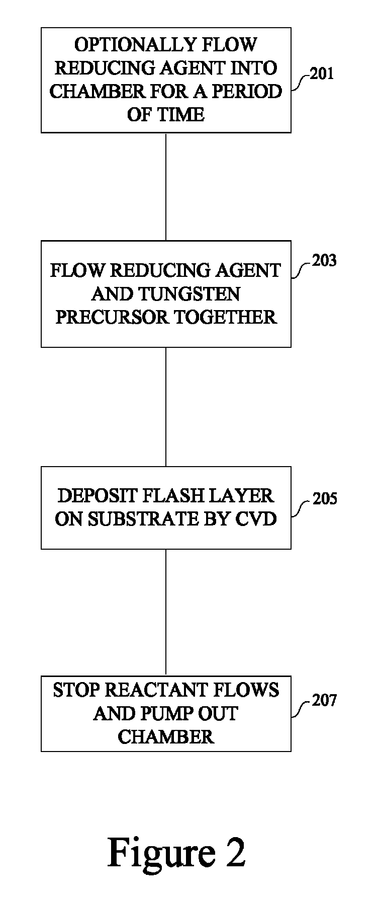 (a) exposing the substrate to a tungsten-containing precursor and a reducing agent simultaneously to deposit a tungsten flash layer by chemical vapor deposition; wherein the substrate temperature is maintained at a temperature of less than about 350° C. during deposition; and (b) depositing the tungsten-containing layer on the flash layer, wherein depositing the tungsten-containing layer on the flash layer comprises exposing the flash layer to a tungsten-containing precursor to thereby deposit a tungsten-containing nucleation or seed layer on the flash layer, wherein the tungsten-containing nucleation or seed layer is a metallic tungsten layer. 2. The method of 3. The method of 4. The method of 5. The method of 6. The method of 7. The method of 8. The method of 9. The method of 10. The method of 11. The method of 12. The method of 13. A method of forming a tungsten nitride layer on a substrate, comprising: