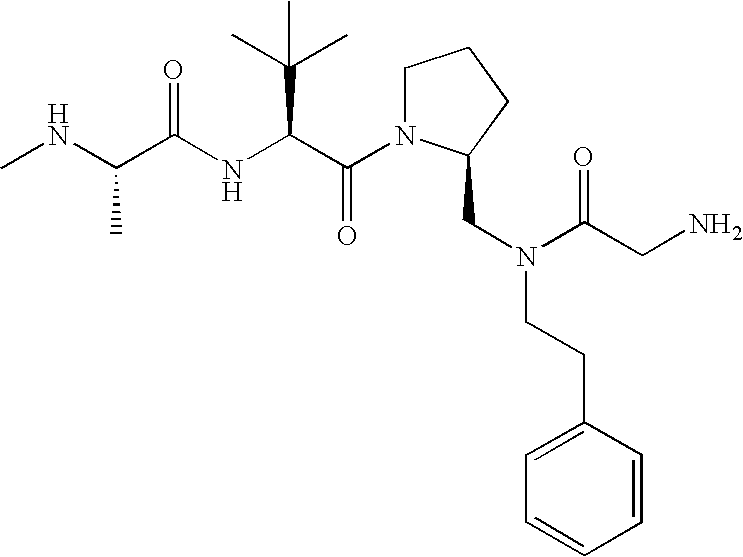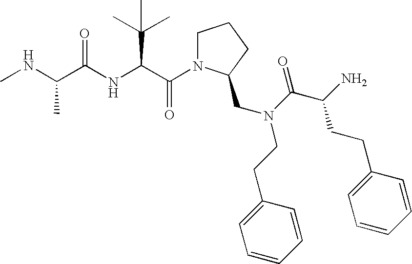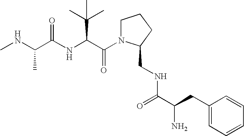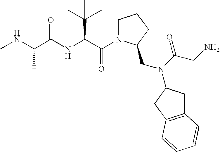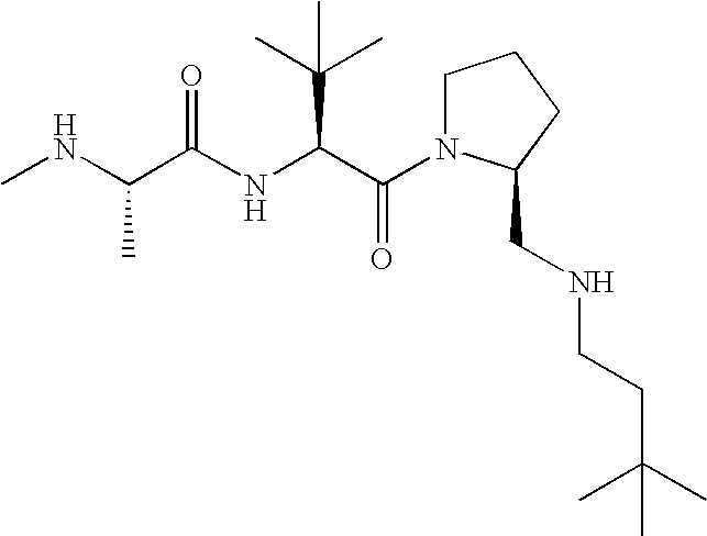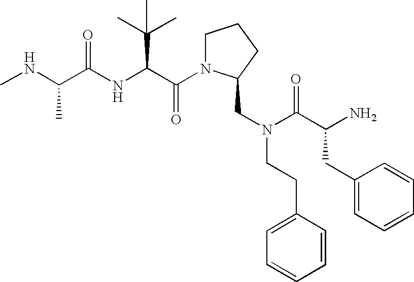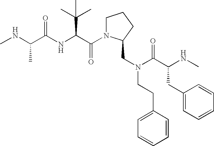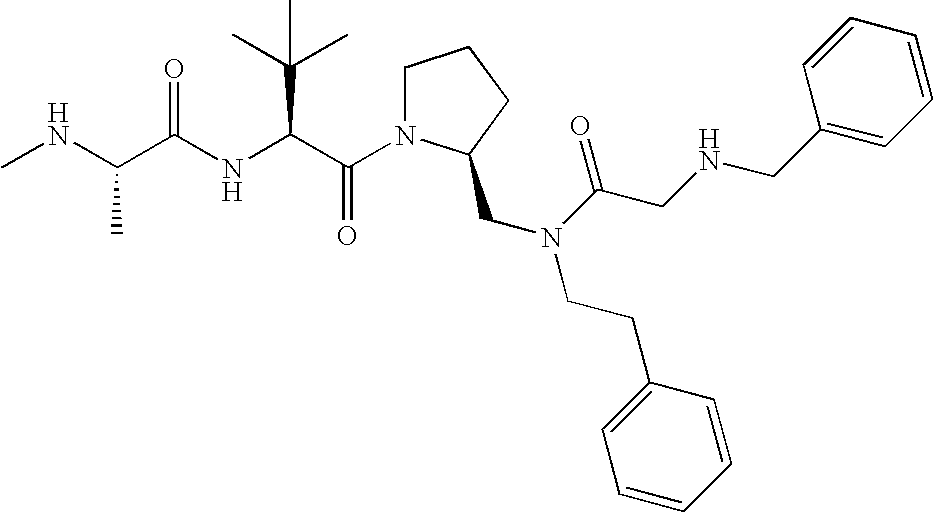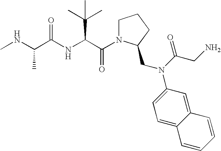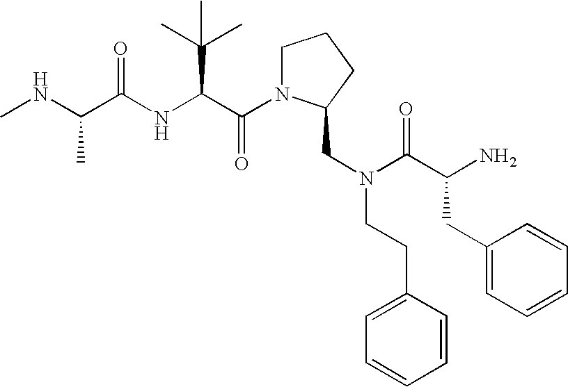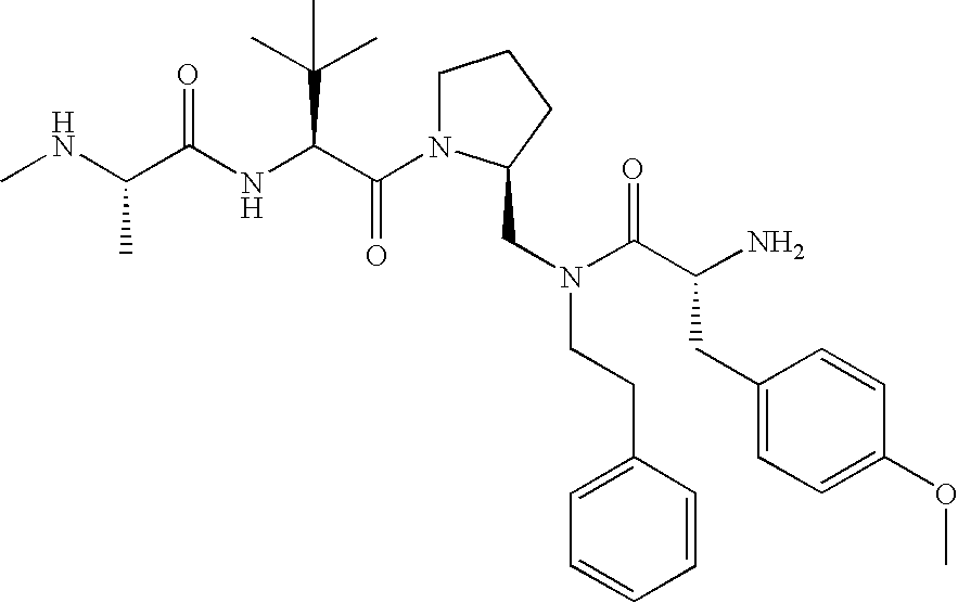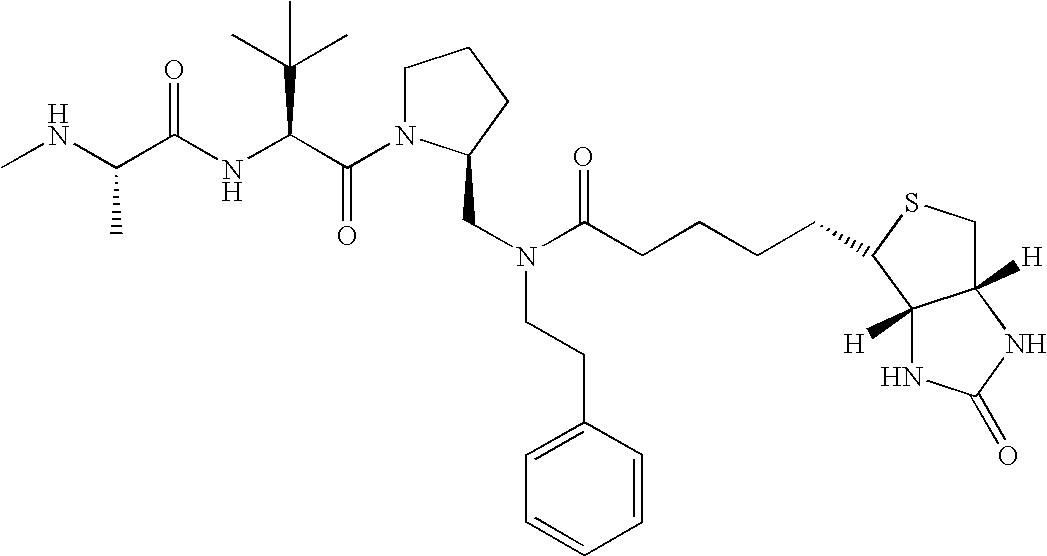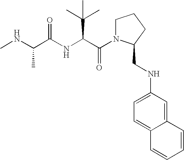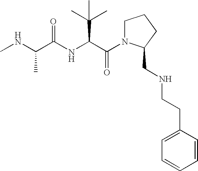 Without wishing to be bound by theory, we believe that the compounds of the present invention bind within the BIR domains of the IAPs. More specifically, compounds of the instant invention bind XIAP and prevent the interaction of the activated caspases with XIAP. Specifically, our data supports the notion that the compounds of the present invention can significantly reduce or essentially eliminate the interaction of XIAP with active caspase-9 and with active caspase-3. Since caspase-7 can also bind to the BIR2 site of XIAP, it is possible that the compounds can also prevent activated caspase-7 from binding to XIAP. Thus one possible mechanism of action of the compounds is to bind to the BIR motif and prevent the interaction with the caspase. In doing so the ratio of active/non-bound caspase in the cells is believed to increase and prime the cells to apoptosis. Alternatively, the compounds of the present invention may bind to the IAPs and modify the global protein conformation and thus modulate its half-life or again prevent XIAP from binding to other proteins. For IAPs having RING domain/E3 ligase activity, the mechanism of action of the compounds may be to prevent the interaction of yet other unknown protein to interact with IAP domains and possibly preventing or inducing the ubiquination of these proteins.