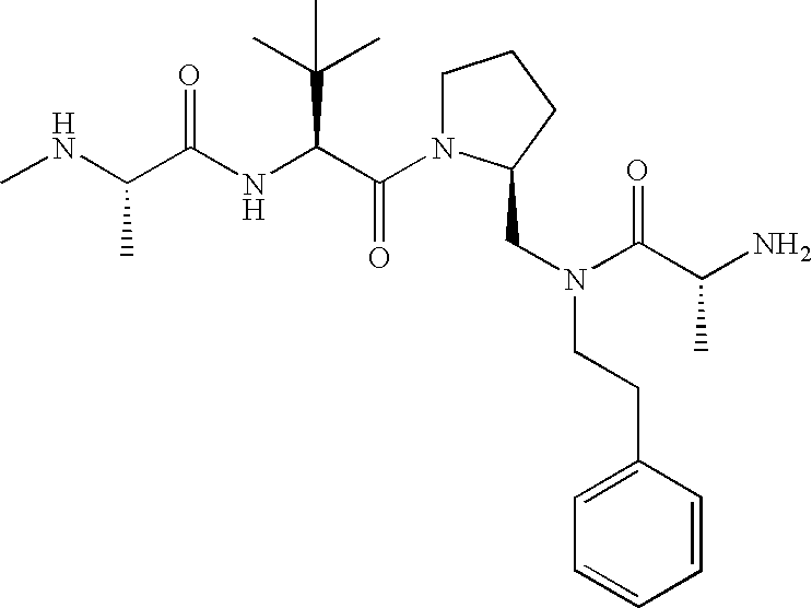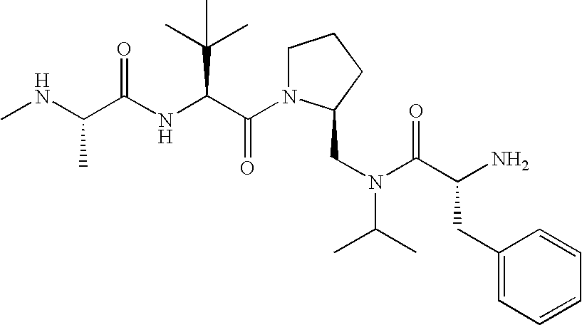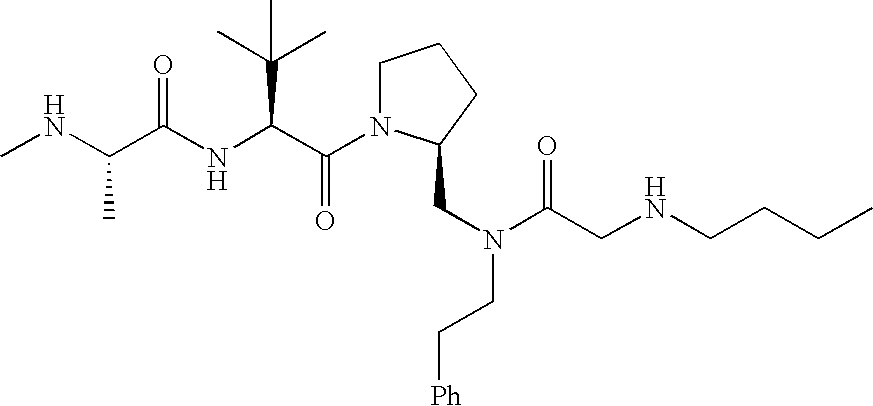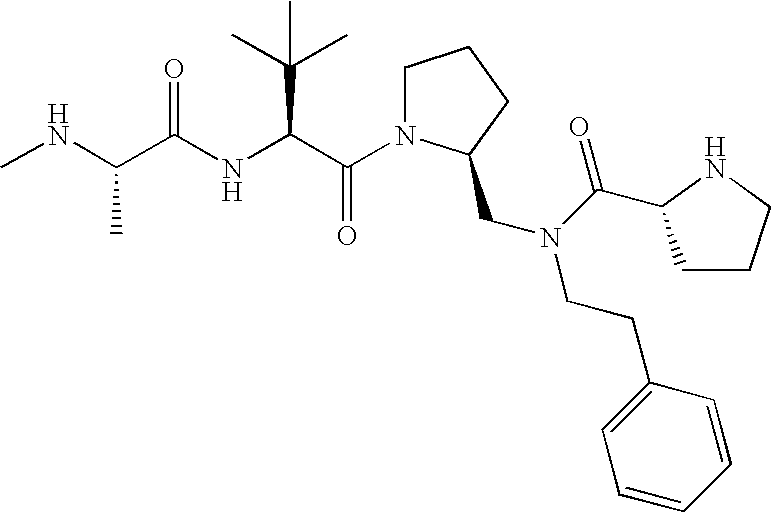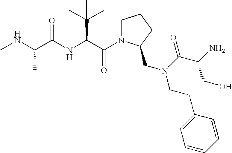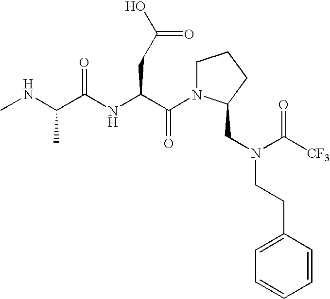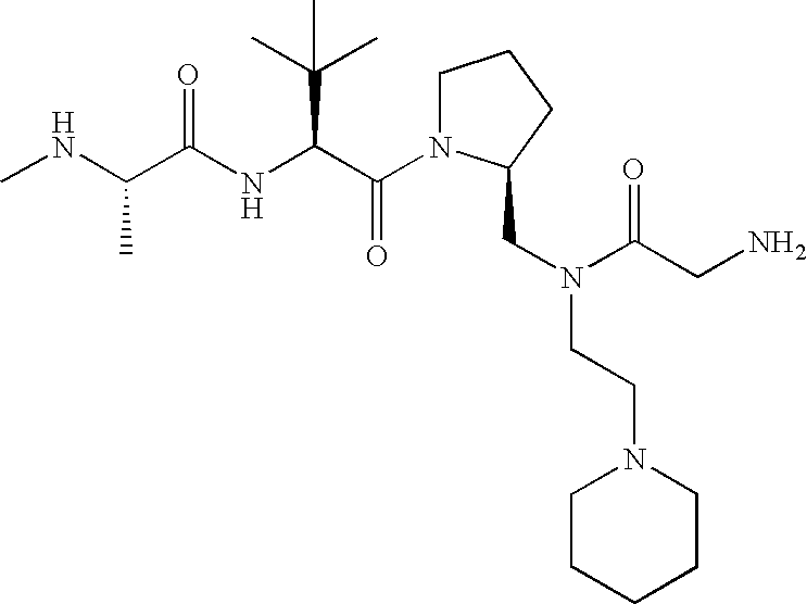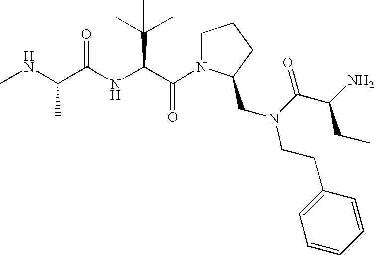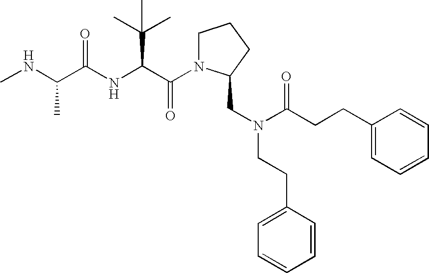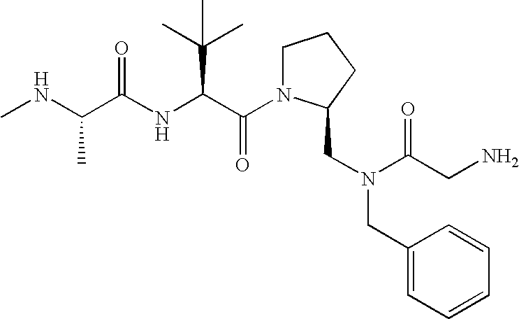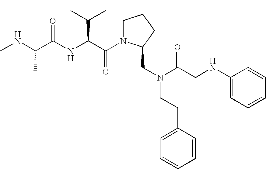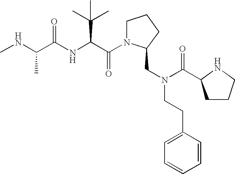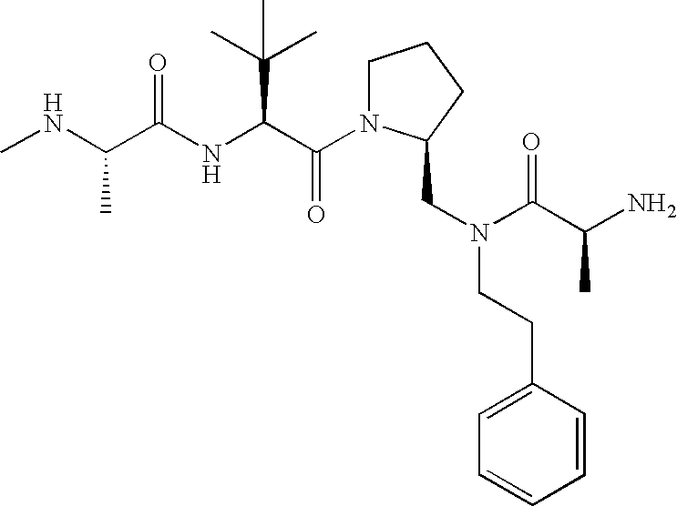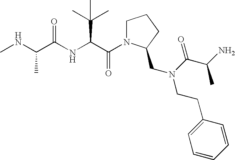 Without wishing to be bound by theory, we believe that the compounds of the present invention bind within the BIR domains of the IAPs. More specifically, compounds of the instant invention bind XIAP and prevent the interaction of the activated caspases with XIAP. Specifically, our data supports the notion that the compounds of the present invention can significantly reduce or essentially eliminate the interaction of XIAP with active caspase-9 and with active caspase-3. Since caspase-7 can also bind to the BIR2 site of XIAP, it is possible that the compounds can also prevent activated caspase-7 from binding to XIAP. Thus one possible mechanism of action of the compounds is to bind to the BIR motif and prevent the interaction with the caspase. In doing so the ratio of active/non-bound caspase in the cells is believed to increase and prime the cells to apoptosis. Alternatively, the compounds of the present invention may bind to the IAPs and modify the global protein conformation and thus modulate its half-life or again prevent XIAP from binding to other proteins. For IAPs having RING domain/E3 ligase activity, the mechanism of action of the compounds may be to prevent the interaction of yet other unknown protein to interact with IAP domains and possibly preventing or inducing the ubiquination of these proteins.