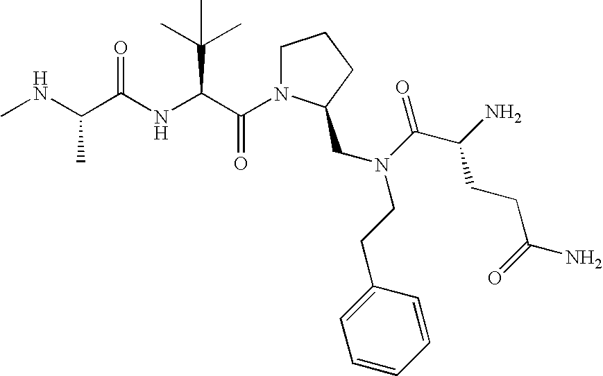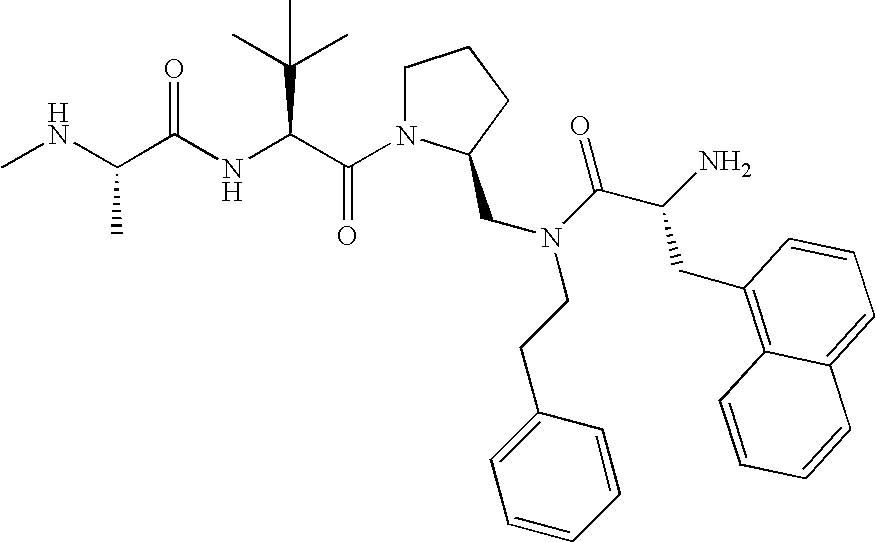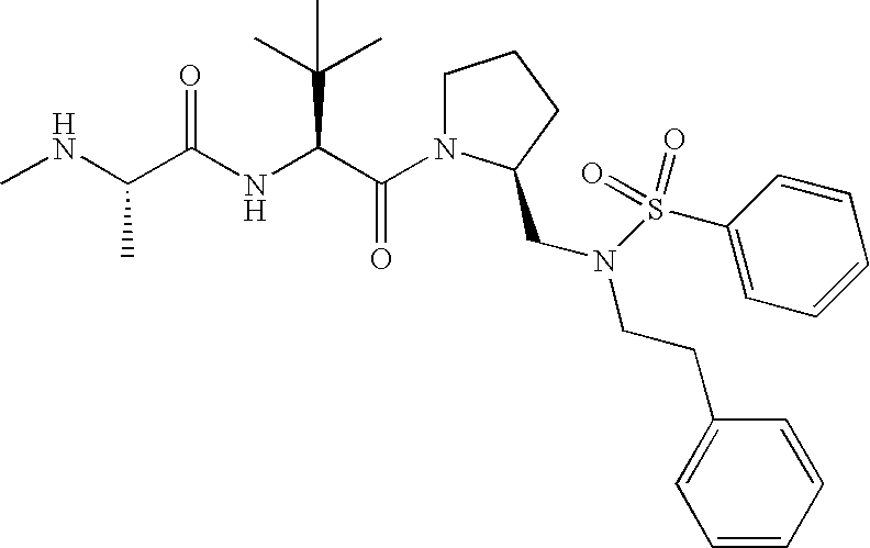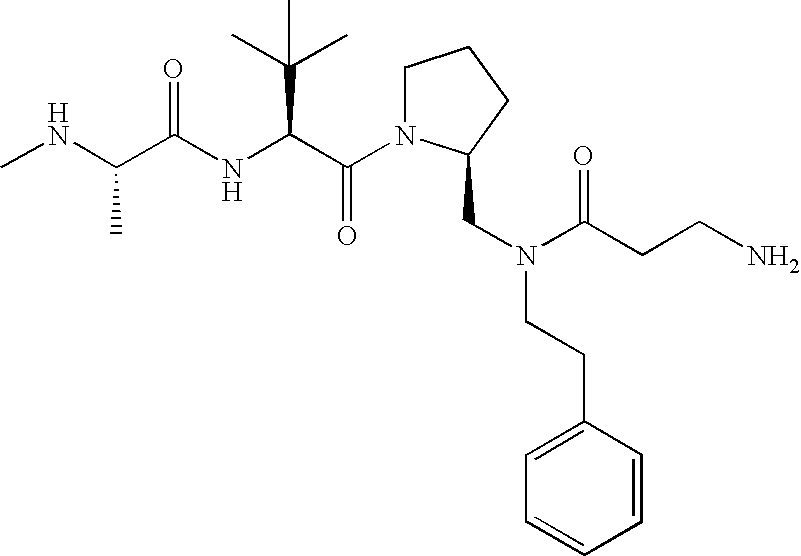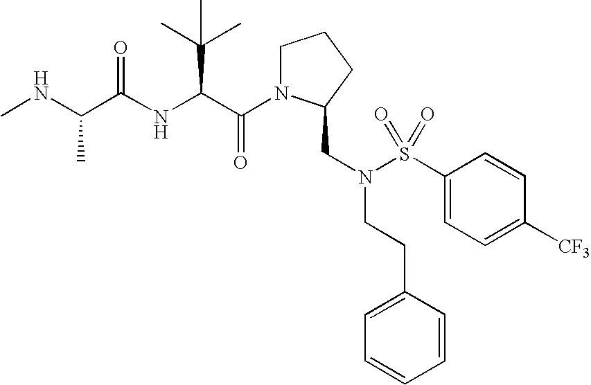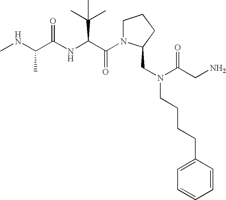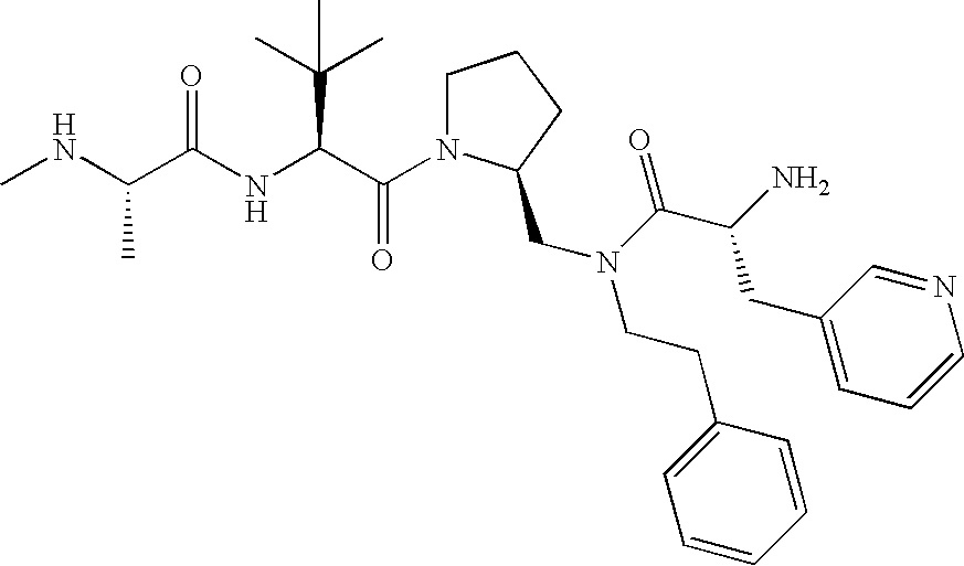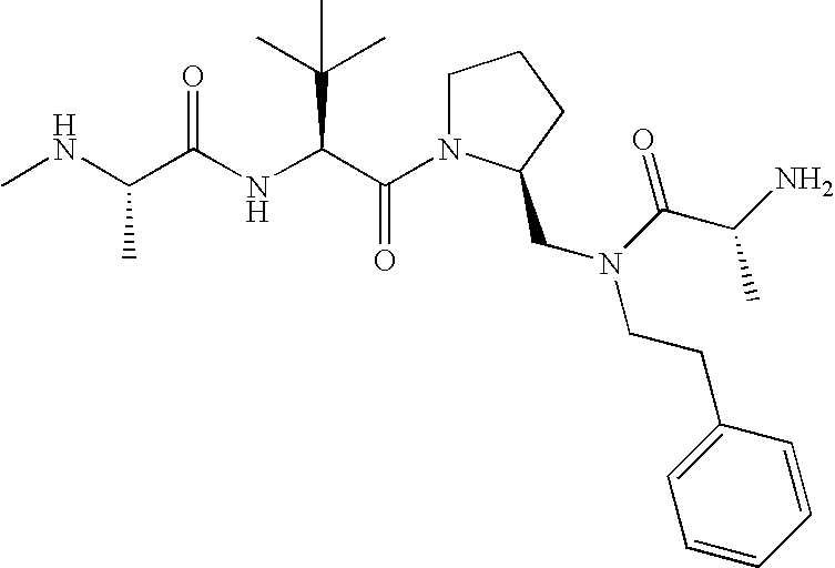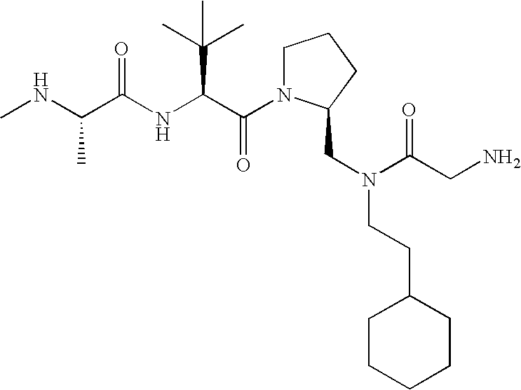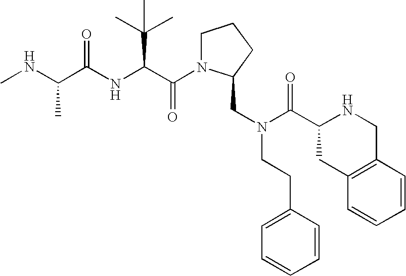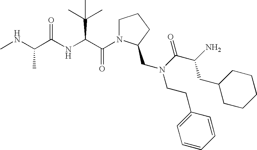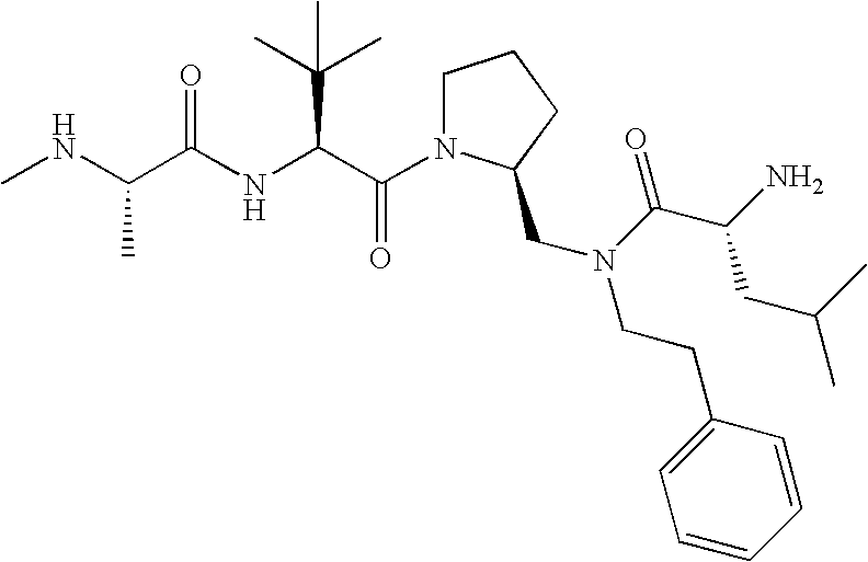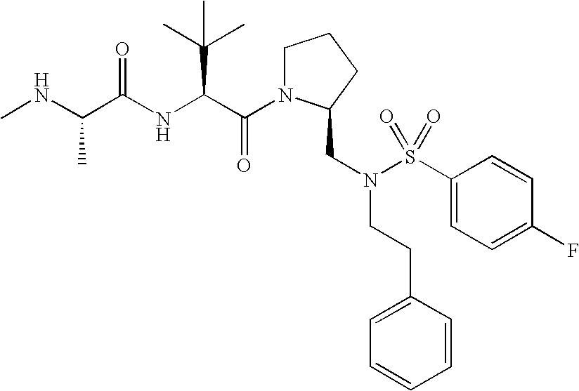 Without wishing to be bound by theory, we believe that the compounds of the present invention bind within the BIR domains of the IAPs. More specifically, compounds of the instant invention bind XIAP and prevent the interaction of the activated caspases with XIAP. Specifically, our data supports the notion that the compounds of the present invention can significantly reduce or essentially eliminate the interaction of XIAP with active caspase-9 and with active caspase-3. Since caspase-7 can also bind to the BIR2 site of XIAP, it is possible that the compounds can also prevent activated caspase-7 from binding to XIAP. Thus one possible mechanism of action of the compounds is to bind to the BIR motif and prevent the interaction with the caspase. In doing so the ratio of active/non-bound caspase in the cells is believed to increase and prime the cells to apoptosis. Alternatively, the compounds of the present invention may bind to the IAPs and modify the global protein conformation and thus modulate its half-life or again prevent XIAP from binding to other proteins. For IAPs having RING domain/E3 ligase activity, the mechanism of action of the compounds may be to prevent the interaction of yet other unknown protein to interact with IAP domains and possibly preventing or inducing the ubiquination of these proteins.