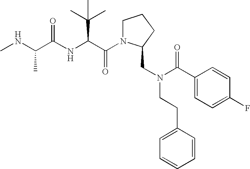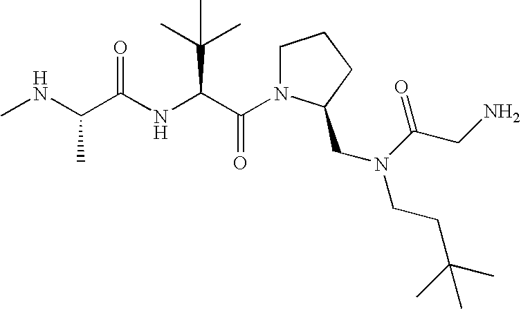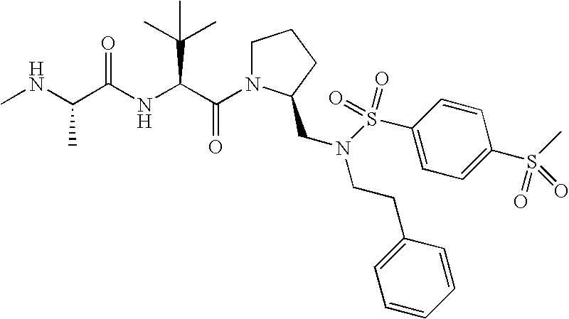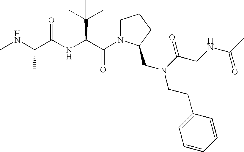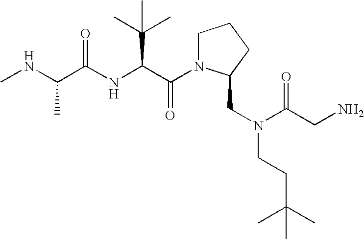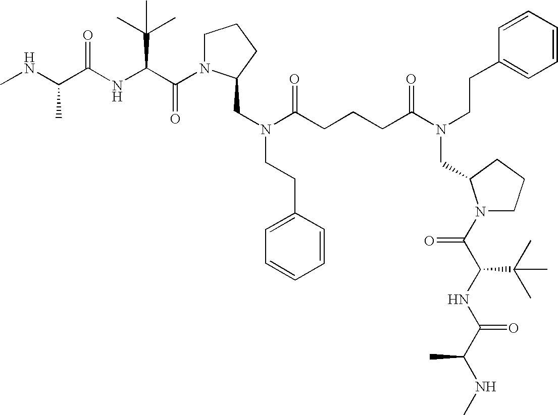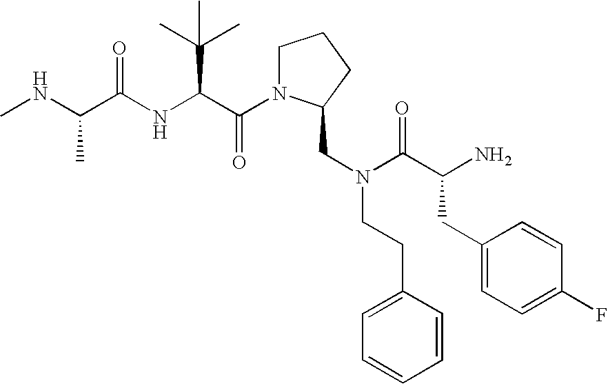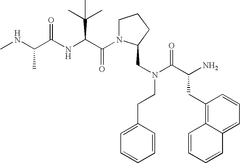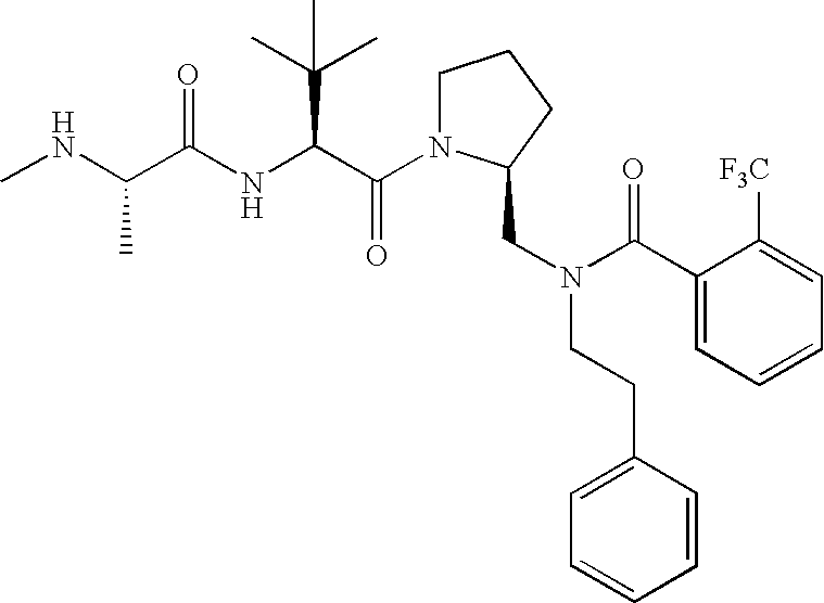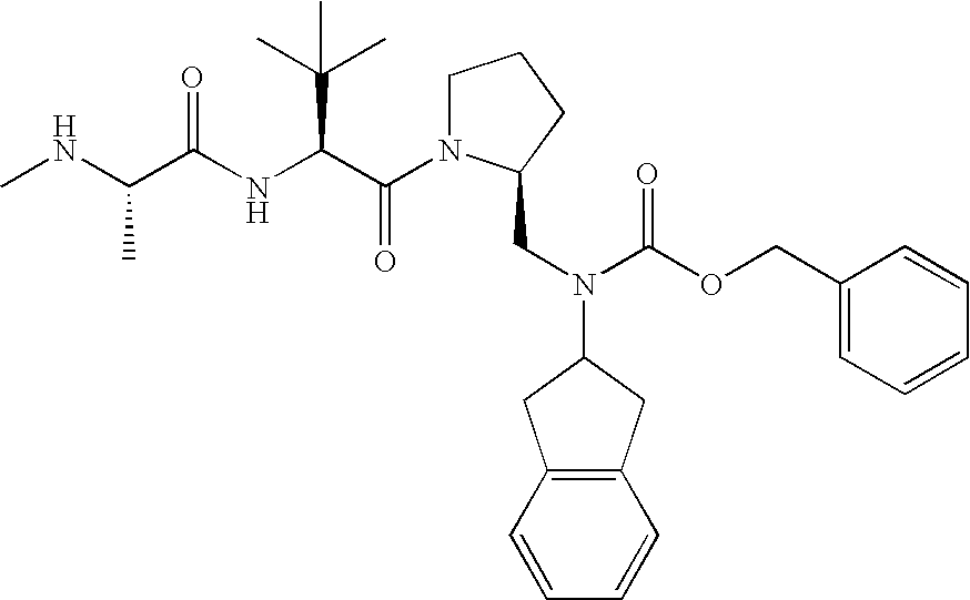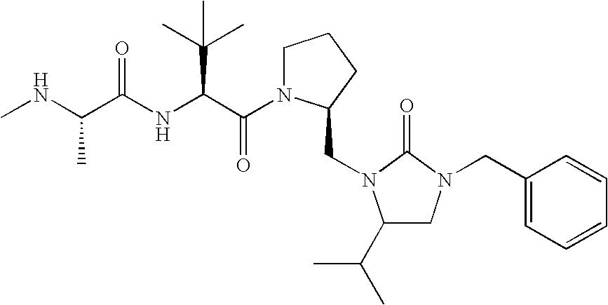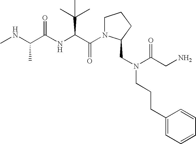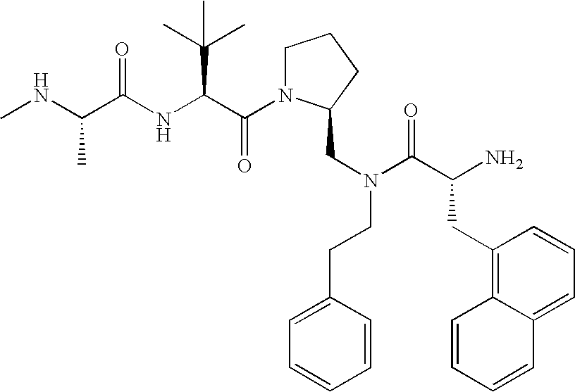 Without wishing to be bound by theory, we believe that the compounds of the present invention bind within the BIR domains of the IAPs. More specifically, compounds of the instant invention bind XIAP and prevent the interaction of the activated caspases with XIAP. Specifically, our data supports the notion that the compounds of the present invention can significantly reduce or essentially eliminate the interaction of XIAP with active caspase-9 and with active caspase-3. Since caspase-7 can also bind to the BIR2 site of XIAP, it is possible that the compounds can also prevent activated caspase-7 from binding to XIAP. Thus one possible mechanism of action of the compounds is to bind to the BIR motif and prevent the interaction with the caspase. In doing so the ratio of active/non-bound caspase in the cells is believed to increase and prime the cells to apoptosis. Alternatively, the compounds of the present invention may bind to the IAPs and modify the global protein conformation and thus modulate its half-life or again prevent XIAP from binding to other proteins. For IAPs having RING domain/E3 ligase activity, the mechanism of action of the compounds may be to prevent the interaction of yet other unknown protein to interact with IAP domains and possibly preventing or inducing the ubiquination of these proteins.