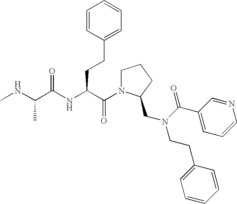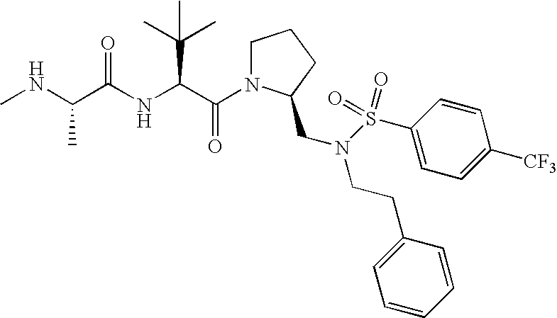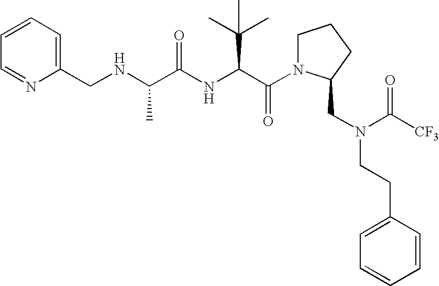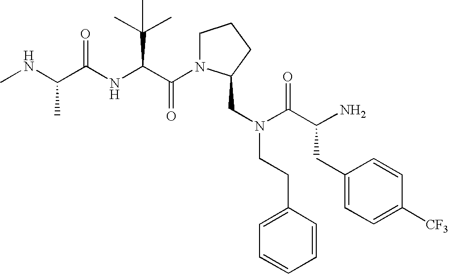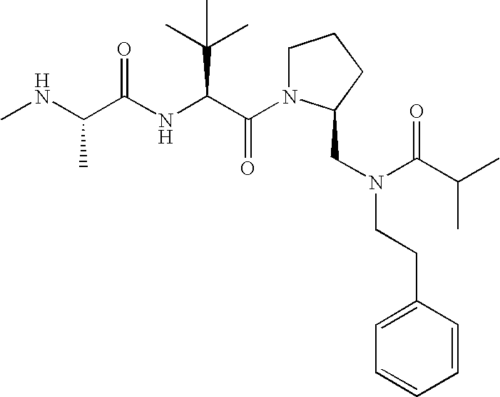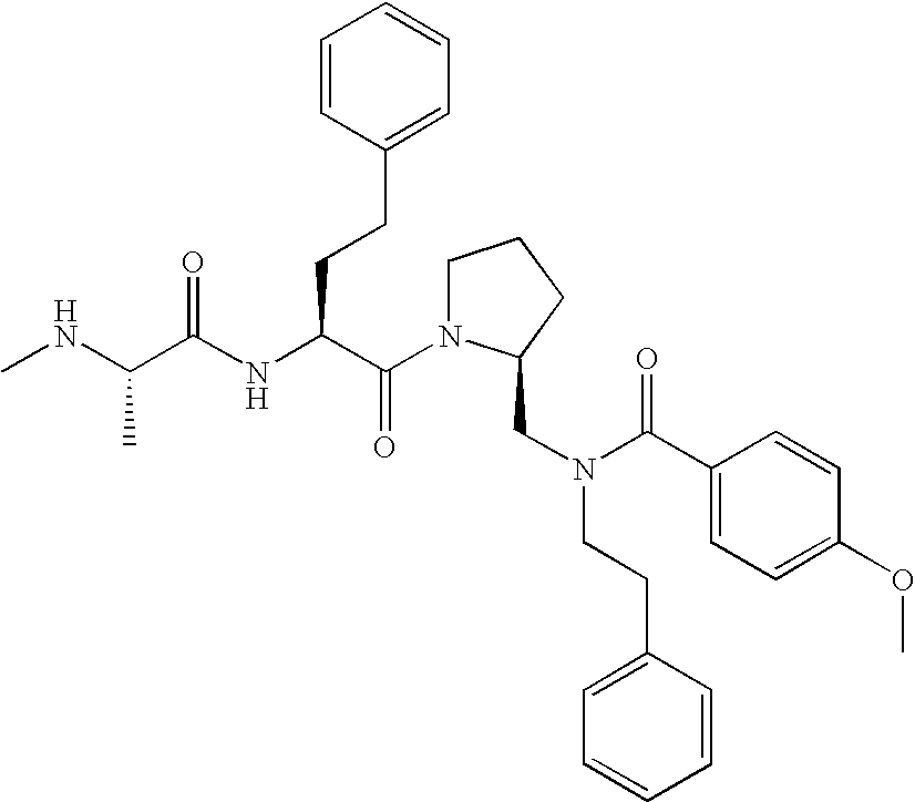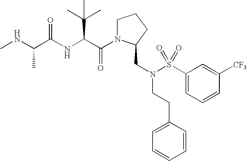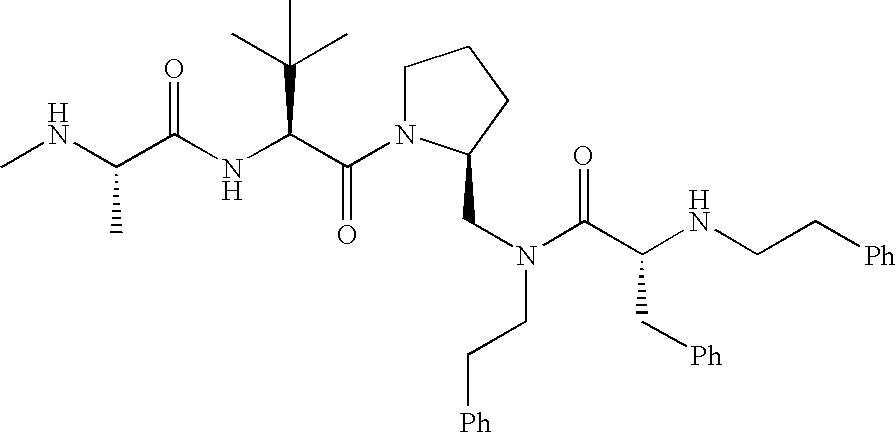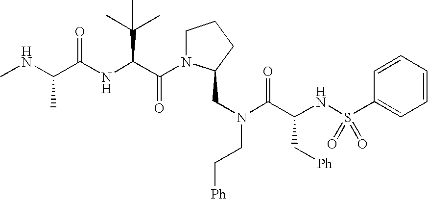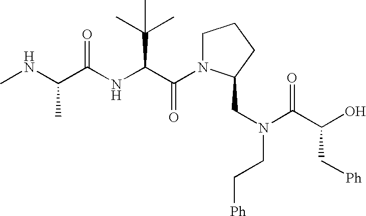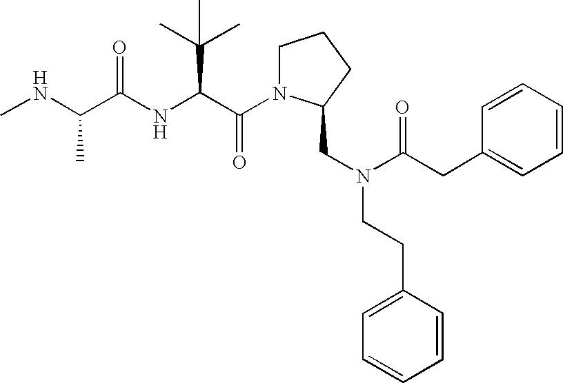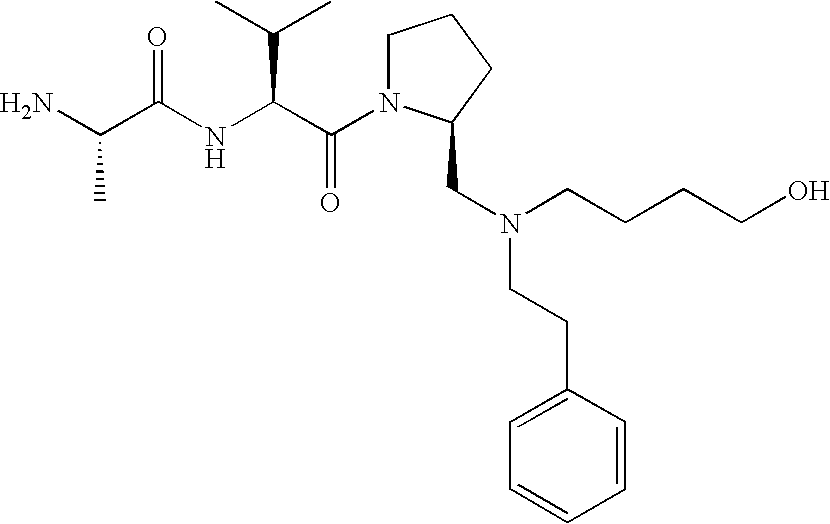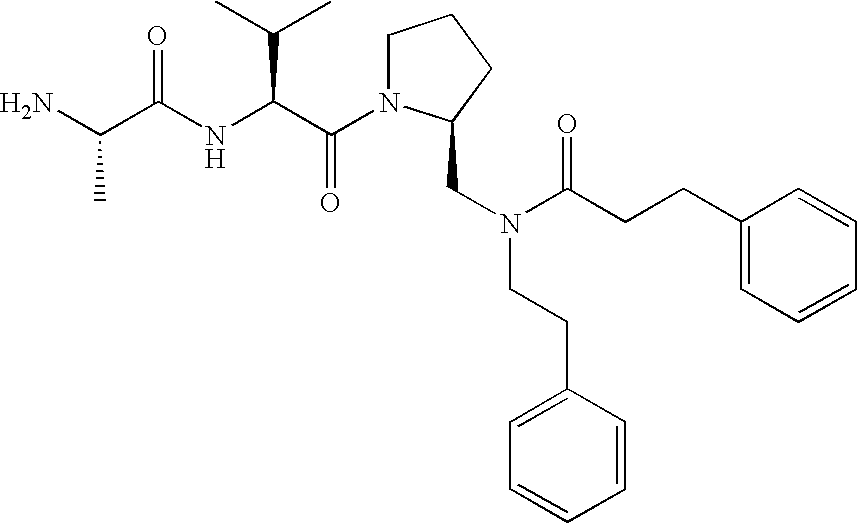 Without wishing to be bound by theory, we believe that the compounds of the present invention bind within the BIR domains of the IAPs. More specifically, compounds of the instant invention bind XIAP and prevent the interaction of the activated caspases with XIAP. Specifically, our data supports the notion that the compounds of the present invention can significantly reduce or essentially eliminate the interaction of XIAP with active caspase-9 and with active caspase-3. Since caspase-7 can also bind to the BIR2 site of XIAP, it is possible that the compounds can also prevent activated caspase-7 from binding to XIAP. Thus one possible mechanism of action of the compounds is to bind to the BIR motif and prevent the interaction with the caspase. In doing so the ratio of active/non-bound caspase in the cells is believed to increase and prime the cells to apoptosis. Alternatively, the compounds of the present invention may bind to the IAPs and modify the global protein conformation and thus modulate its half-life or again prevent XIAP from binding to other proteins. For IAPs having RING domain/E3 ligase activity, the mechanism of action of the compounds may be to prevent the interaction of yet other unknown protein to interact with IAP domains and possibly preventing or inducing the ubiquination of these proteins.