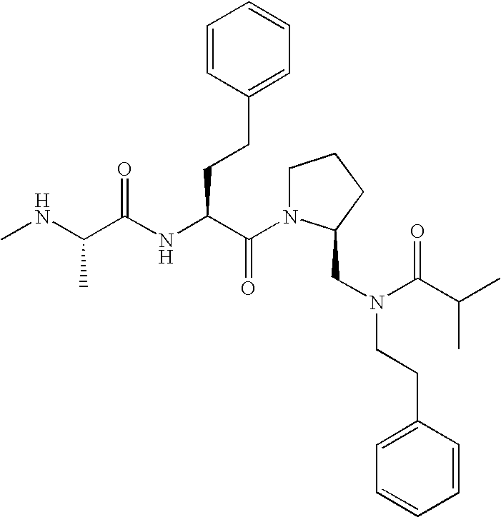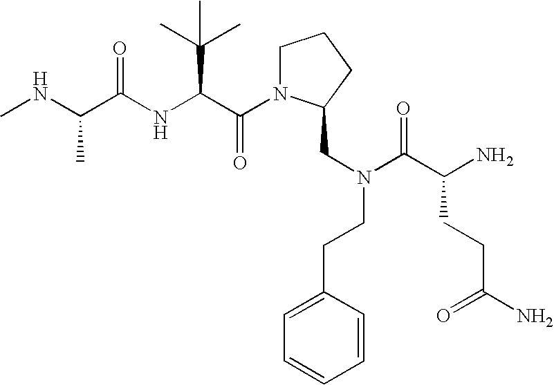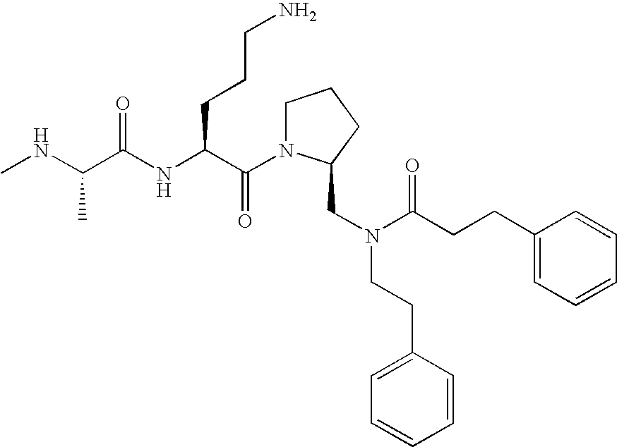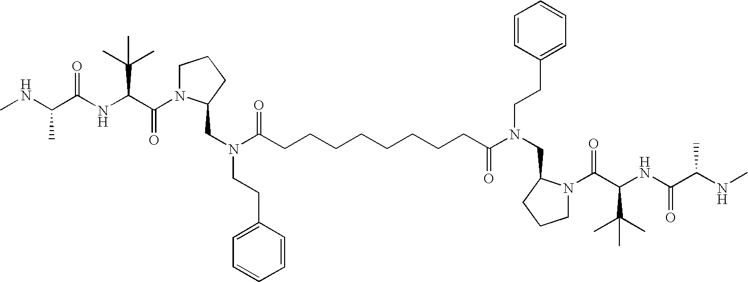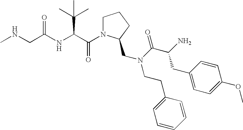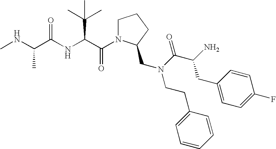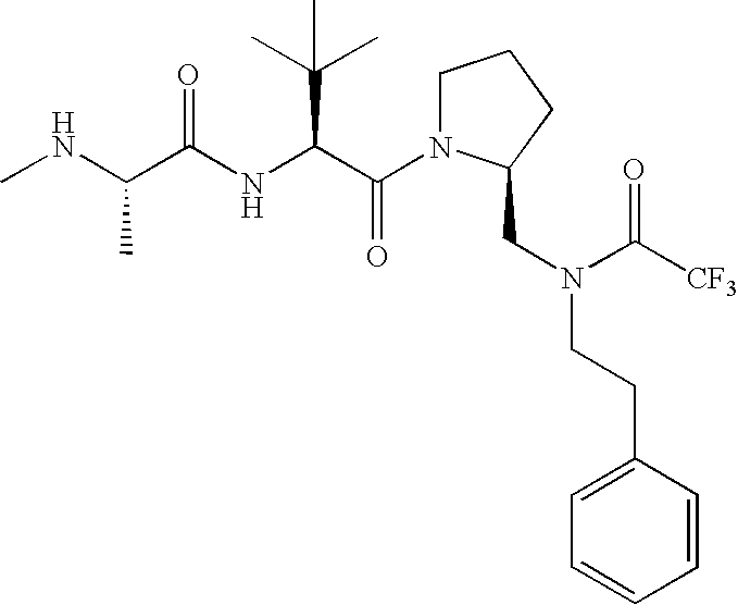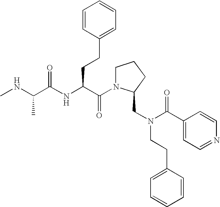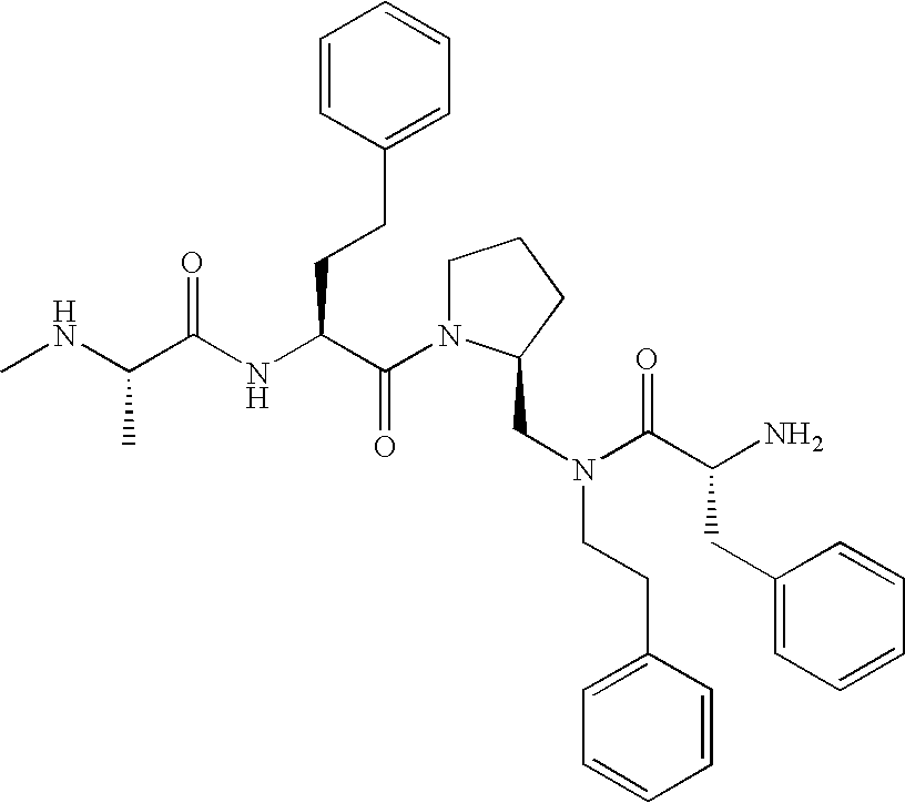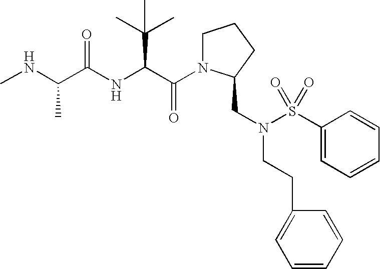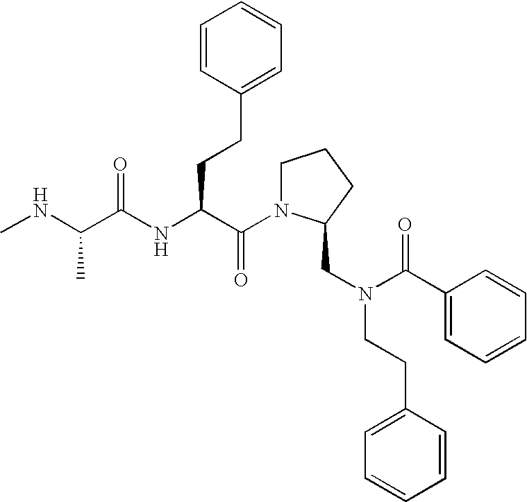 Without wishing to be bound by theory, we believe that the compounds of the present invention bind within the BIR domains of the IAPs. More specifically, compounds of the instant invention bind XIAP and prevent the interaction of the activated caspases with XIAP. Specifically, our data supports the notion that the compounds of the present invention can significantly reduce or essentially eliminate the interaction of XIAP with active caspase-9 and with active caspase-3. Since caspase-7 can also bind to the BIR2 site of XIAP, it is possible that the compounds can also prevent activated caspase-7 from binding to XIAP. Thus one possible mechanism of action of the compounds is to bind to the BIR motif and prevent the interaction with the caspase. In doing so the ratio of active/non-bound caspase in the cells is believed to increase and prime the cells to apoptosis. Alternatively, the compounds of the present invention may bind to the IAPs and modify the global protein conformation and thus modulate its half-life or again prevent XIAP from binding to other proteins. For IAPs having RING domain/E3 ligase activity, the mechanism of action of the compounds may be to prevent the interaction of yet other unknown protein to interact with IAP domains and possibly preventing or inducing the ubiquination of these proteins.
