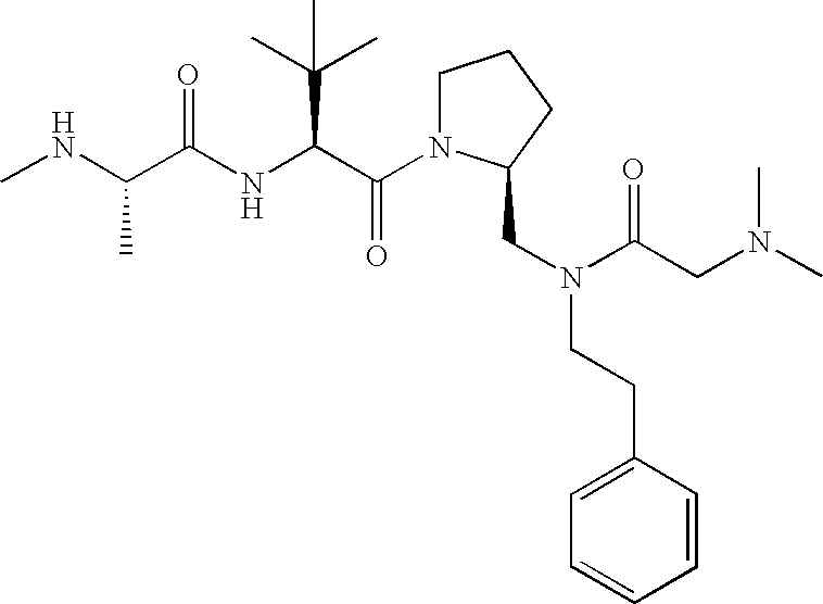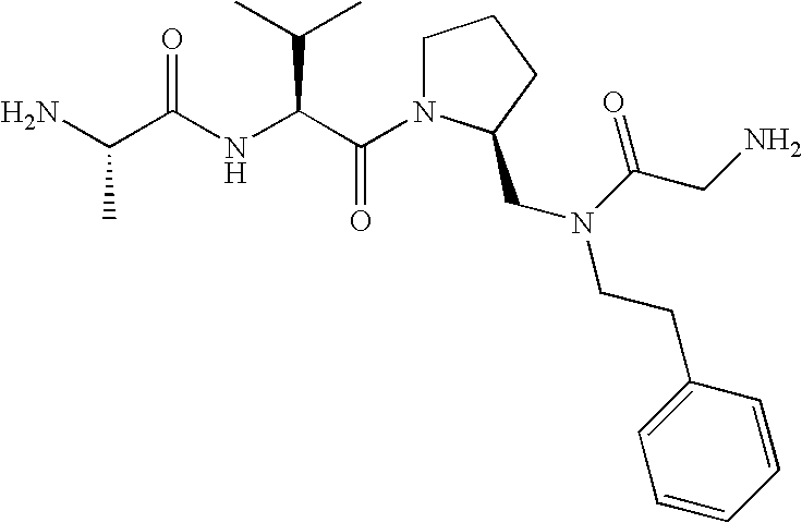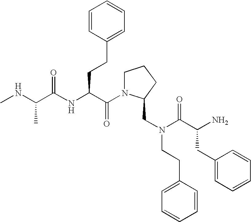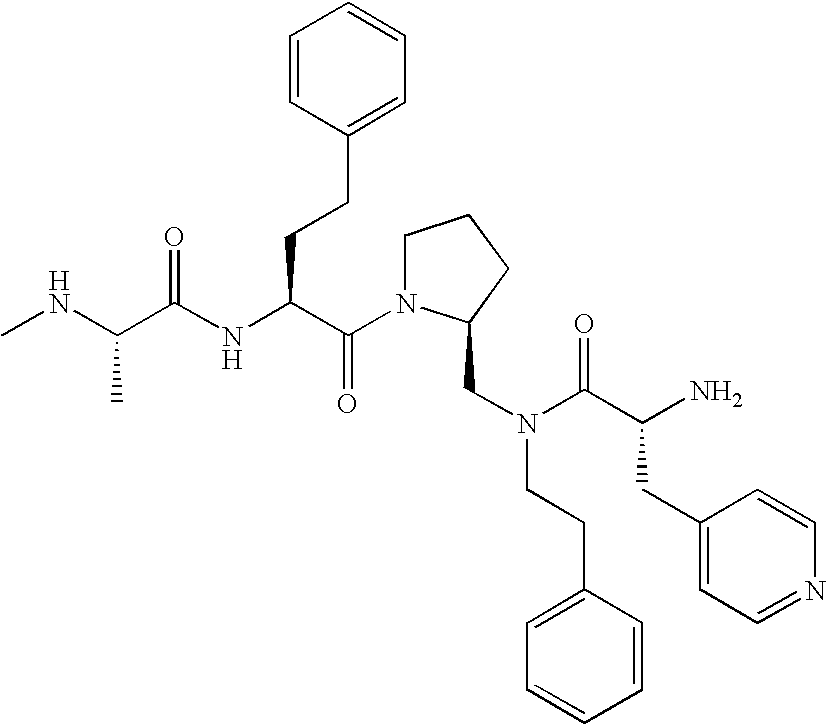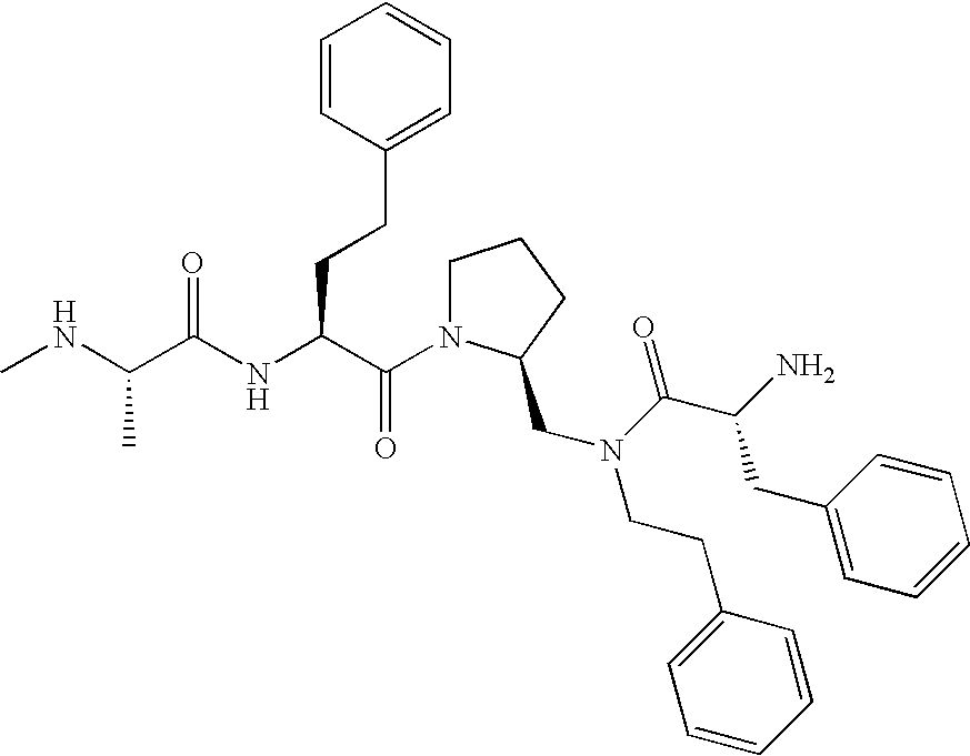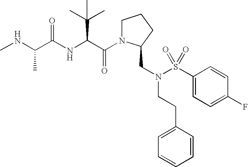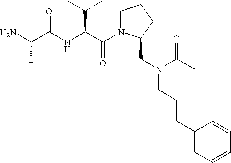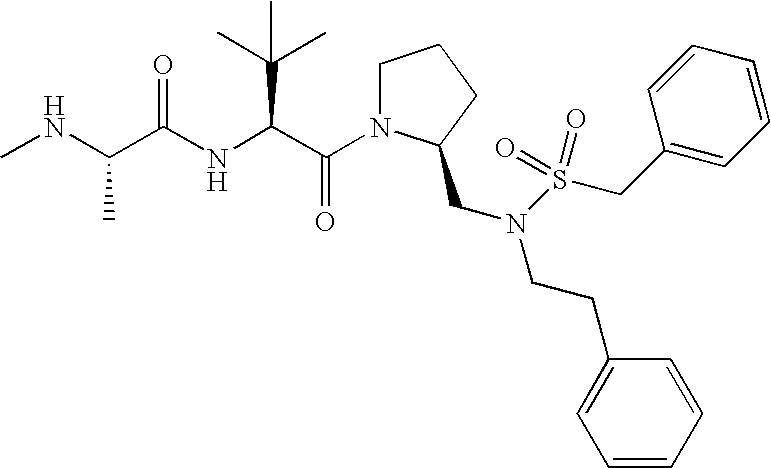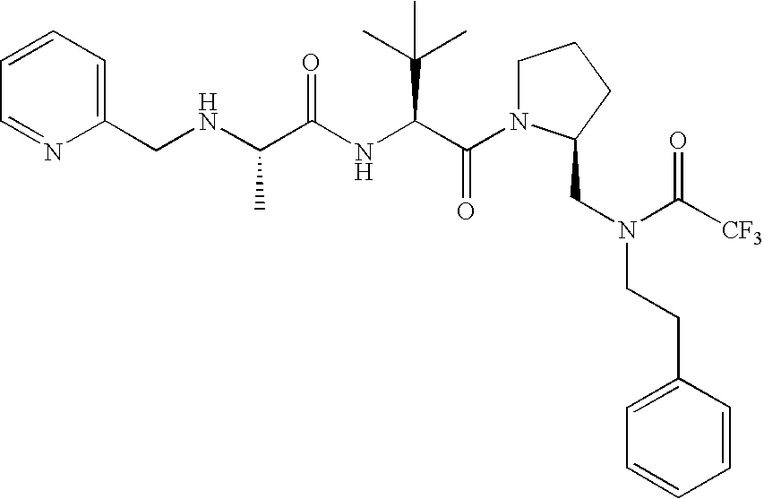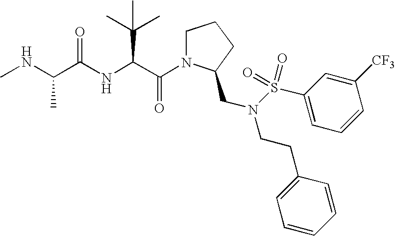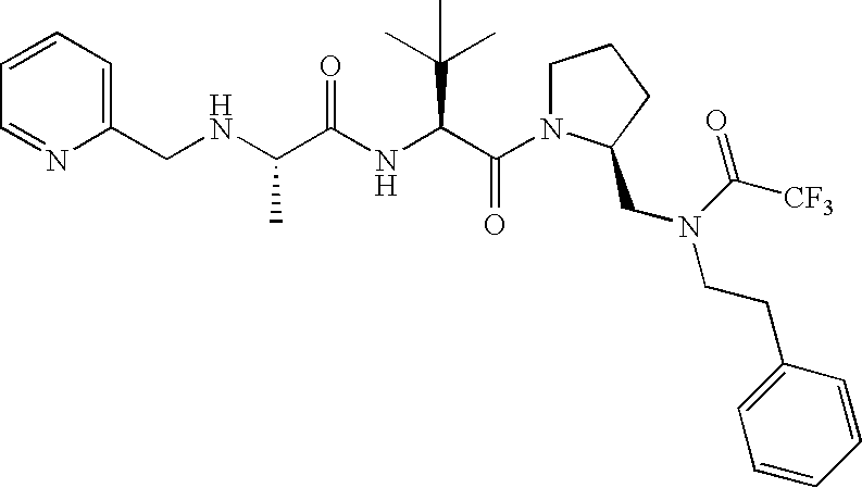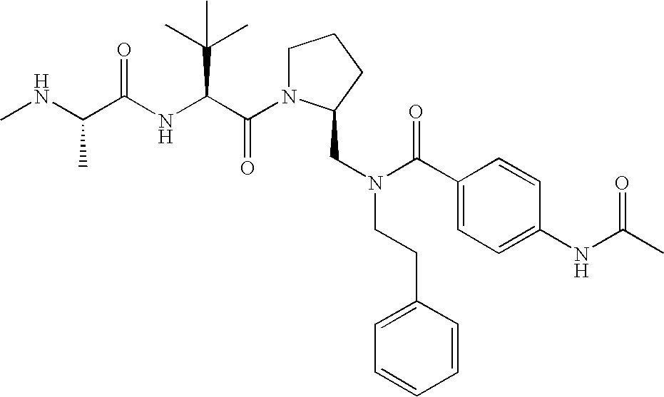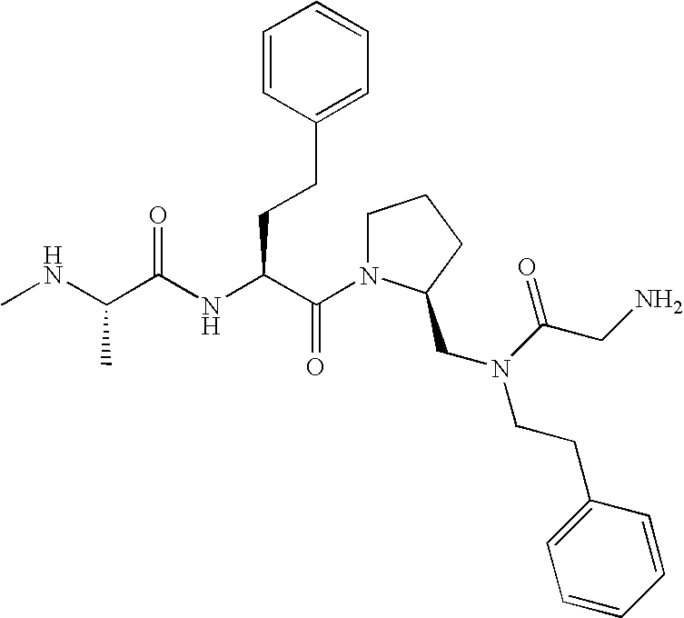 Without wishing to be bound by theory, we believe that the compounds of the present invention bind within the BIR domains of the IAPs. More specifically, compounds of the instant invention bind XIAP and prevent the interaction of the activated caspases with XIAP. Specifically, our data supports the notion that the compounds of the present invention can significantly reduce or essentially eliminate the interaction of XIAP with active caspase-9 and with active caspase-3. Since caspase-7 can also bind to the BIR2 site of XIAP, it is possible that the compounds can also prevent activated caspase-7 from binding to XIAP. Thus one possible mechanism of action of the compounds is to bind to the BIR motif and prevent the interaction with the caspase. In doing so the ratio of active/non-bound caspase in the cells is believed to increase and prime the cells to apoptosis. Alternatively, the compounds of the present invention may bind to the IAPs and modify the global protein conformation and thus modulate its half-life or again prevent XIAP from binding to other proteins. For IAPs having RING domain/E3 ligase activity, the mechanism of action of the compounds may be to prevent the interaction of yet other unknown protein to interact with IAP domains and possibly preventing or inducing the ubiquination of these proteins.
