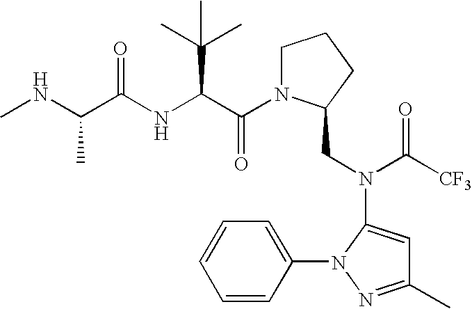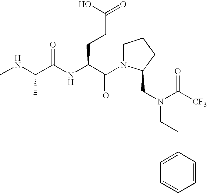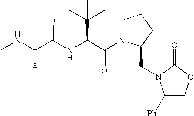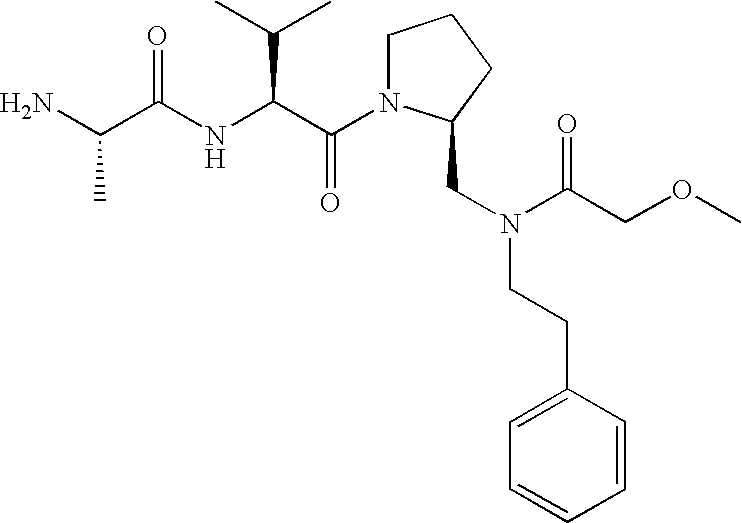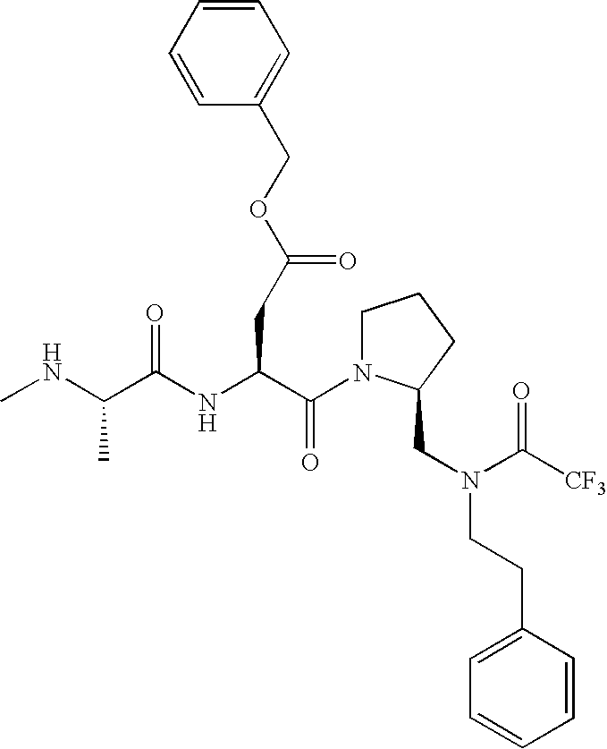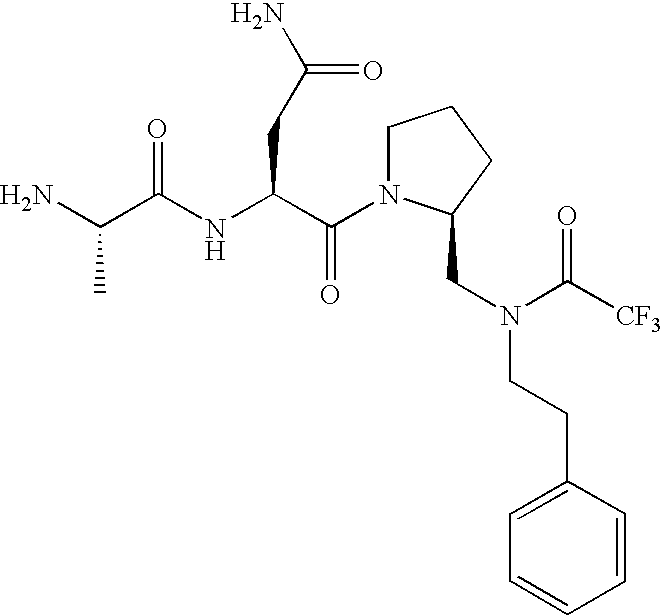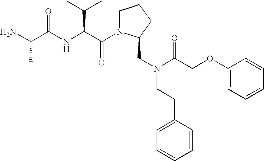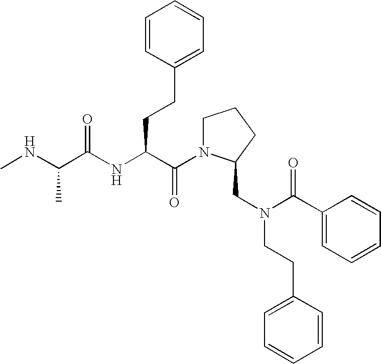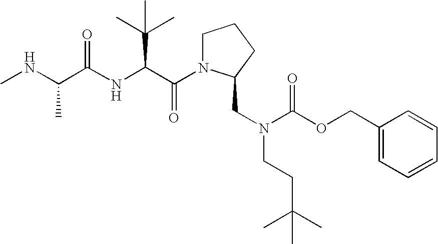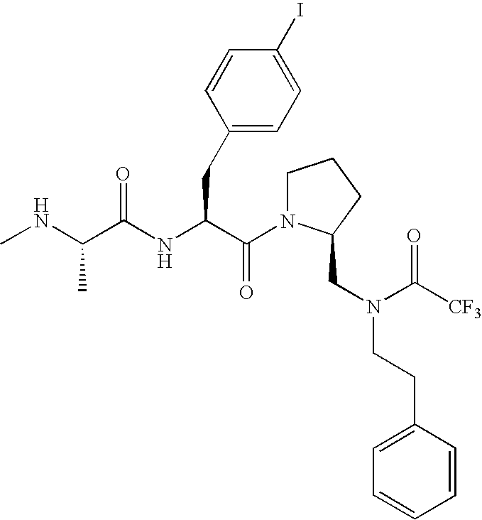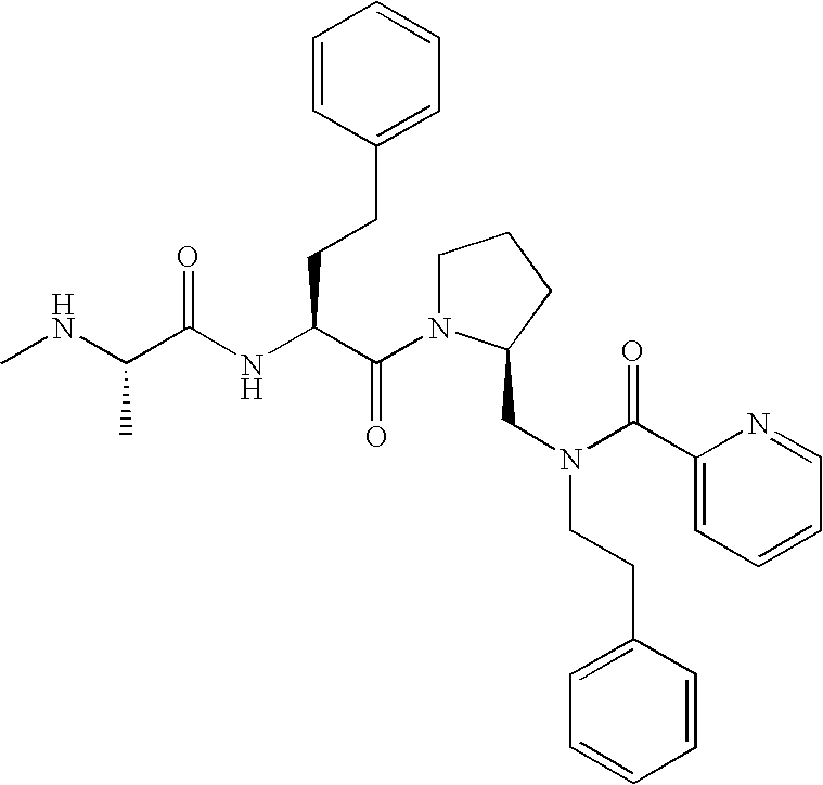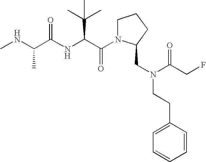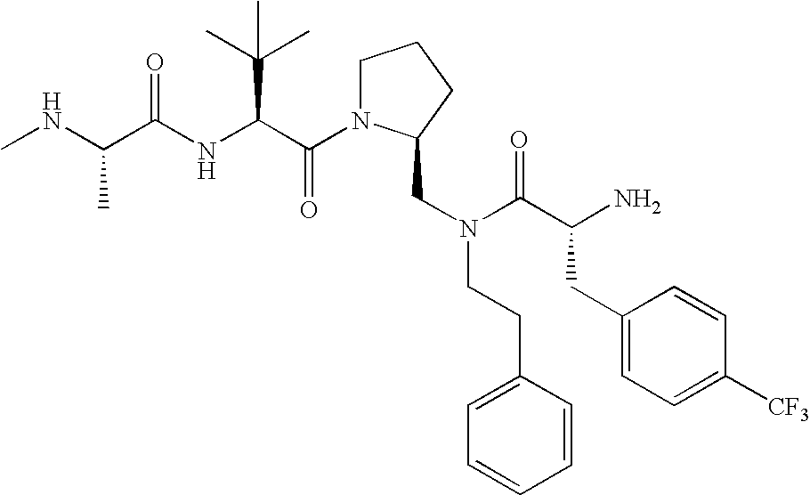 Without wishing to be bound by theory, we believe that the compounds of the present invention bind within the BIR domains of the IAPs. More specifically, compounds of the instant invention bind XIAP and prevent the interaction of the activated caspases with XIAP. Specifically, our data supports the notion that the compounds of the present invention can significantly reduce or essentially eliminate the interaction of XIAP with active caspase-9 and with active caspase-3. Since caspase-7 can also bind to the BIR2 site of XIAP, it is possible that the compounds can also prevent activated caspase-7 from binding to XIAP. Thus one possible mechanism of action of the compounds is to bind to the BIR motif and prevent the interaction with the caspase. In doing so the ratio of active/non-bound caspase in the cells is believed to increase and prime the cells to apoptosis. Alternatively, the compounds of the present invention may bind to the IAPs and modify the global protein conformation and thus modulate its half-life or again prevent XIAP from binding to other proteins. For IAPs having RING domain/E3 ligase activity, the mechanism of action of the compounds may be to prevent the interaction of yet other unknown protein to interact with IAP domains and possibly preventing or inducing the ubiquination of these proteins.