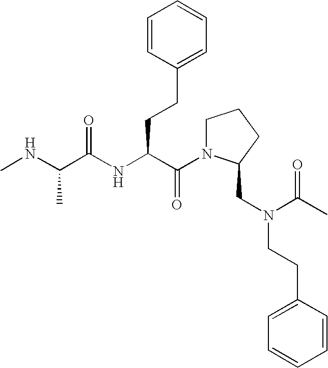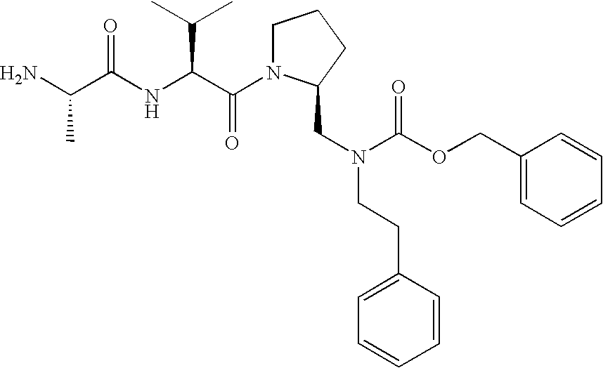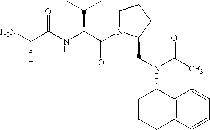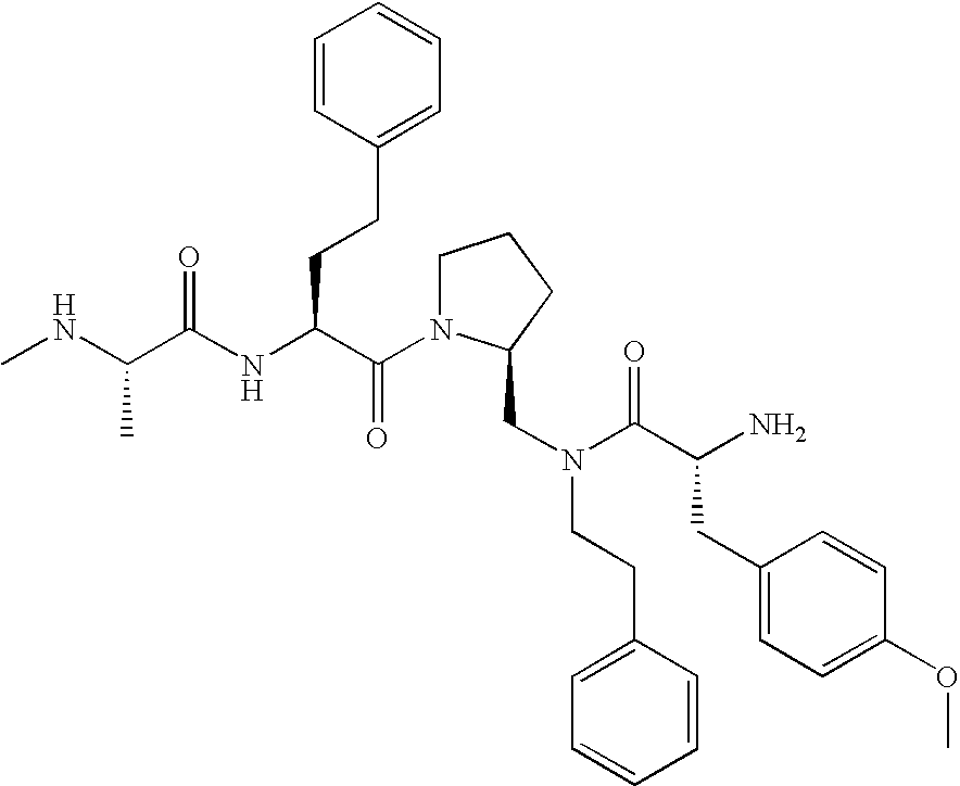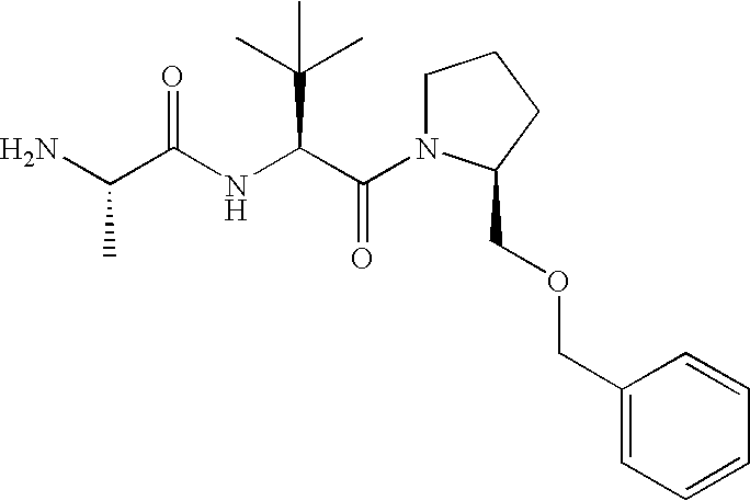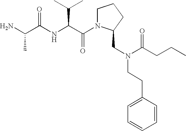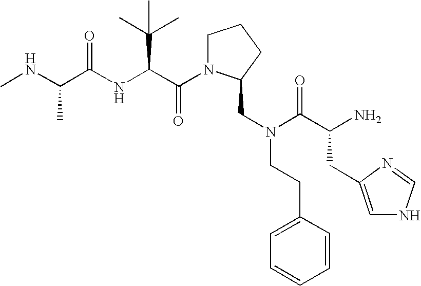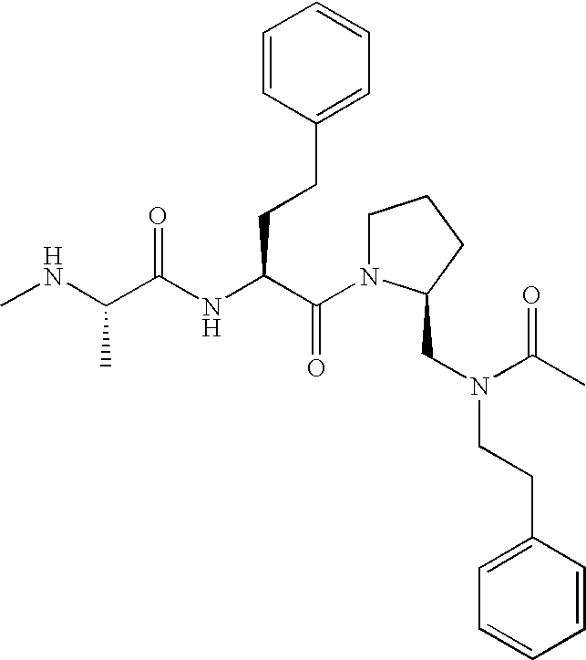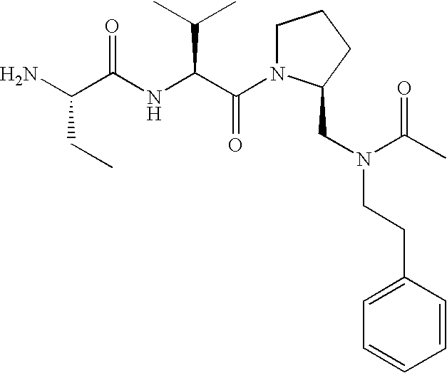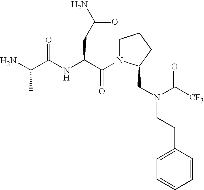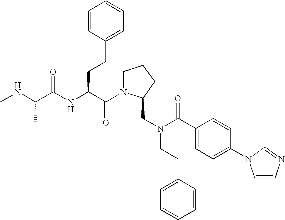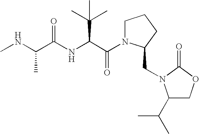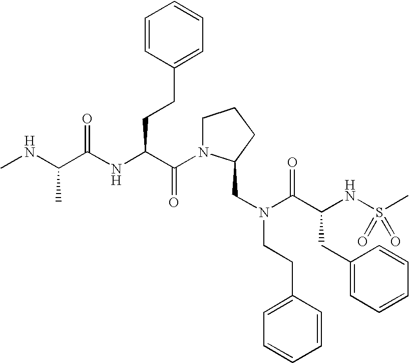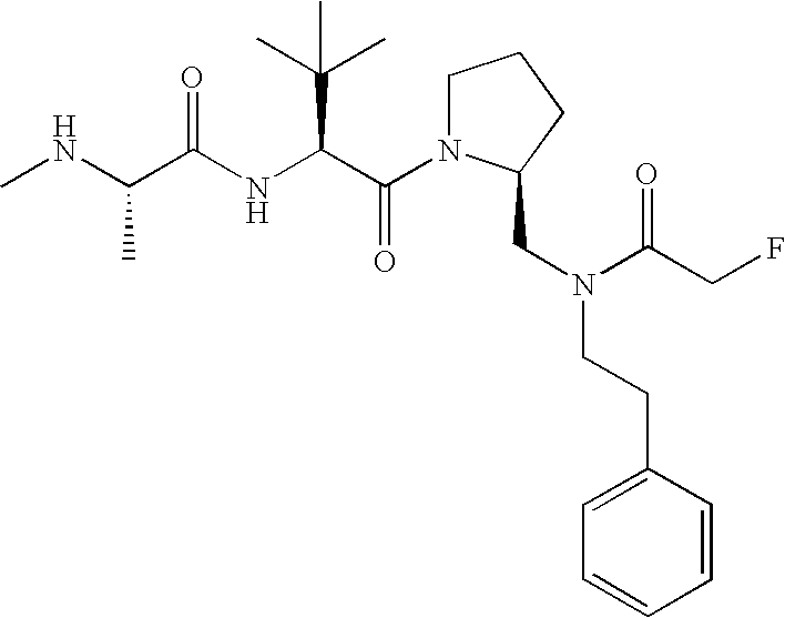 Without wishing to be bound by theory, we believe that the compounds of the present invention bind within the BIR domains of the IAPs. More specifically, compounds of the instant invention bind XIAP and prevent the interaction of the activated caspases with XIAP. Specifically, our data supports the notion that the compounds of the present invention can significantly reduce or essentially eliminate the interaction of XIAP with active caspase-9 and with active caspase-3. Since caspase-7 can also bind to the BIR2 site of XIAP, it is possible that the compounds can also prevent activated caspase-7 from binding to XIAP. Thus one possible mechanism of action of the compounds is to bind to the BIR motif and prevent the interaction with the caspase. In doing so the ratio of active/non-bound caspase in the cells is believed to increase and prime the cells to apoptosis. Alternatively, the compounds of the present invention may bind to the IAPs and modify the global protein conformation and thus modulate its half-life or again prevent XIAP from binding to other proteins. For IAPs having RING domain/E3 ligase activity, the mechanism of action of the compounds may be to prevent the interaction of yet other unknown protein to interact with IAP domains and possibly preventing or inducing the ubiquination of these proteins.