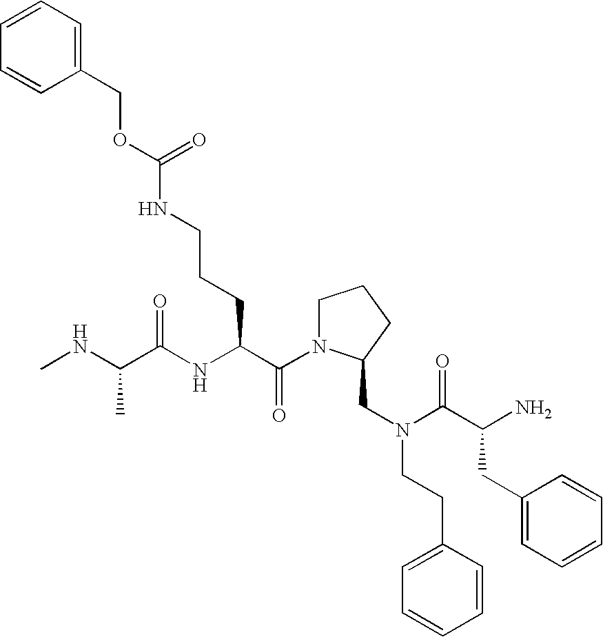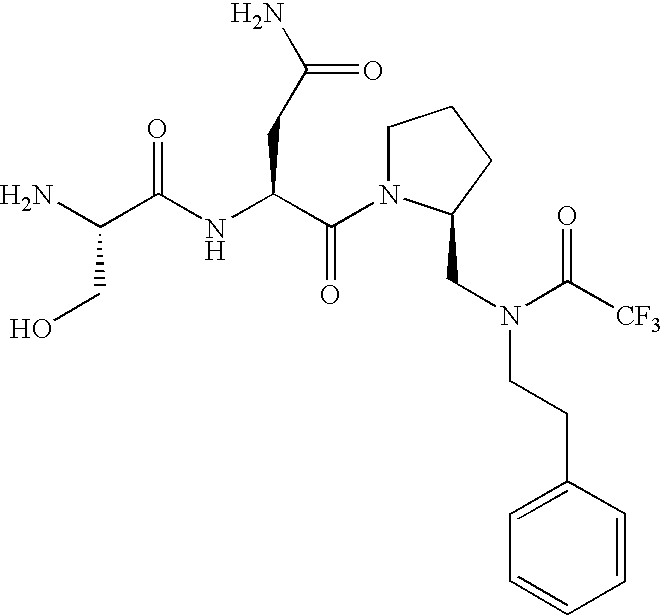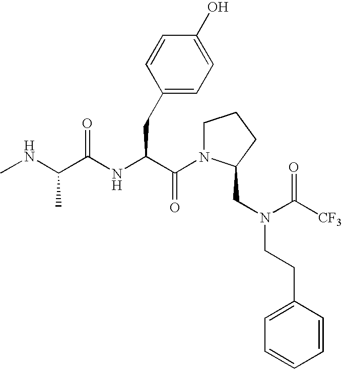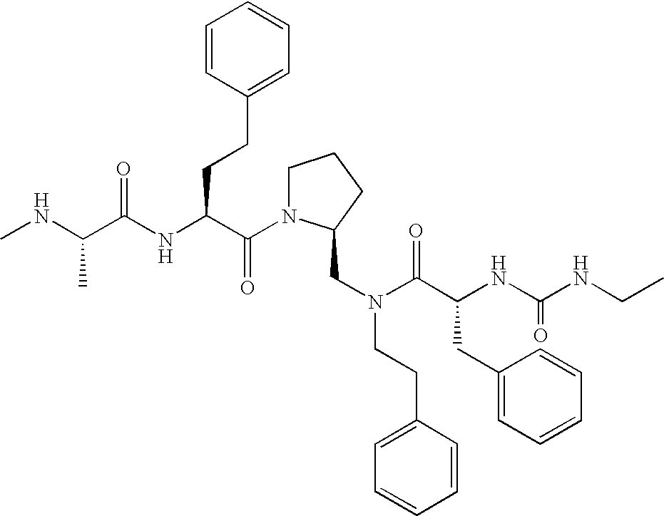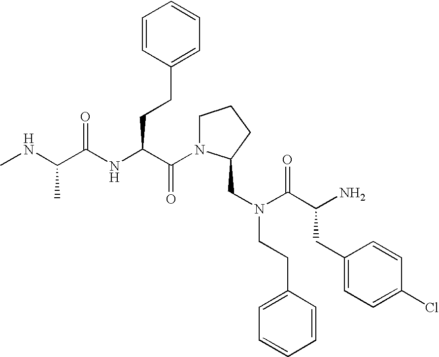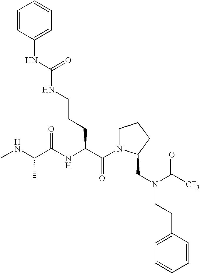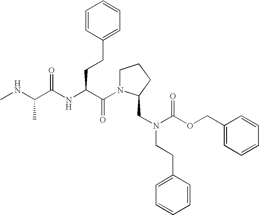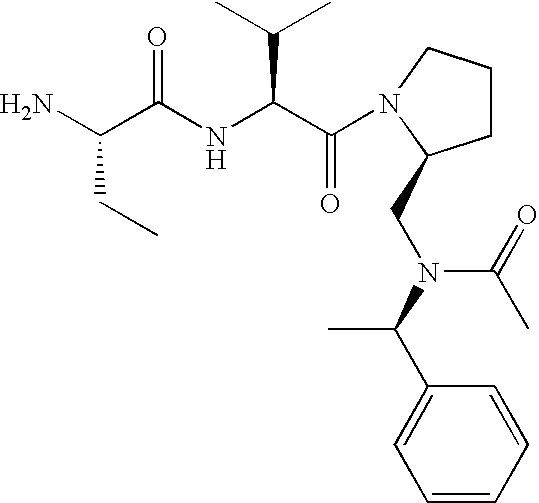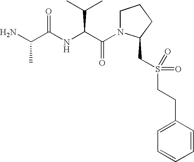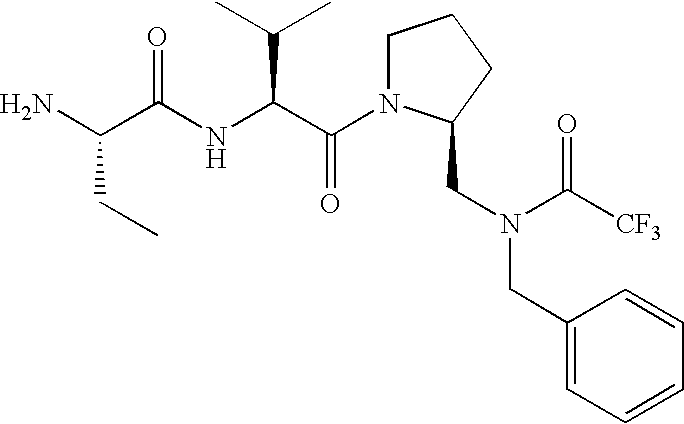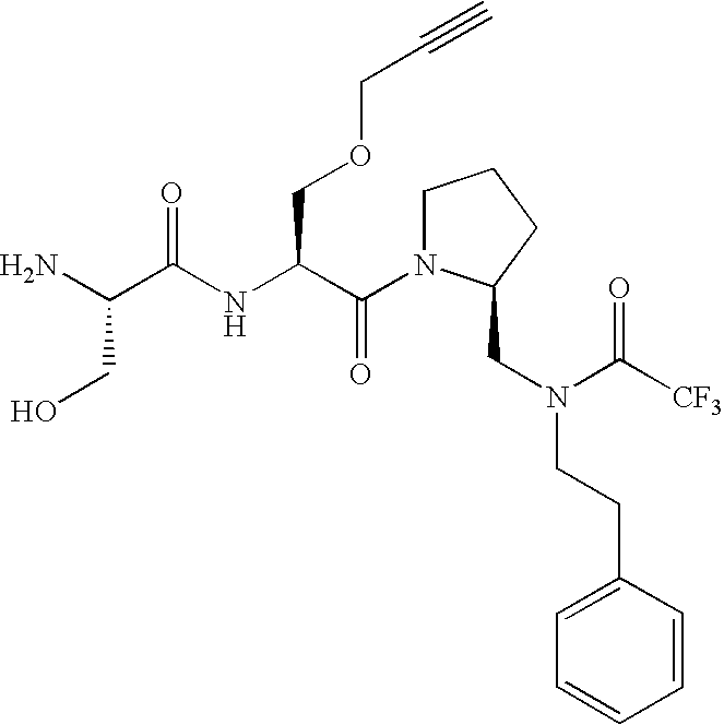 Without wishing to be bound by theory, we believe that the compounds of the present invention bind within the BIR domains of the IAPs. More specifically, compounds of the instant invention bind XIAP and prevent the interaction of the activated caspases with XIAP. Specifically, our data supports the notion that the compounds of the present invention can significantly reduce or essentially eliminate the interaction of XIAP with active caspase-9 and with active caspase-3. Since caspase-7 can also bind to the BIR2 site of XIAP, it is possible that the compounds can also prevent activated caspase-7 from binding to XIAP. Thus one possible mechanism of action of the compounds is to bind to the BIR motif and prevent the interaction with the caspase. In doing so the ratio of active/non-bound caspase in the cells is believed to increase and prime the cells to apoptosis. Alternatively, the compounds of the present invention may bind to the IAPs and modify the global protein conformation and thus modulate its half-life or again prevent XIAP from binding to other proteins. For IAPs having RING domain/E3 ligase activity, the mechanism of action of the compounds may be to prevent the interaction of yet other unknown protein to interact with IAP domains and possibly preventing or inducing the ubiquination of these proteins.
