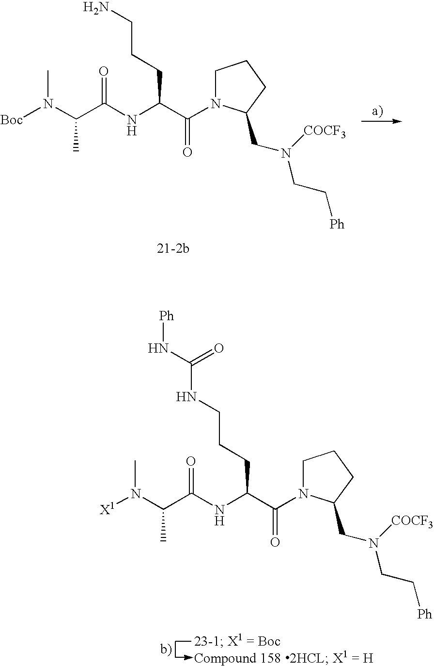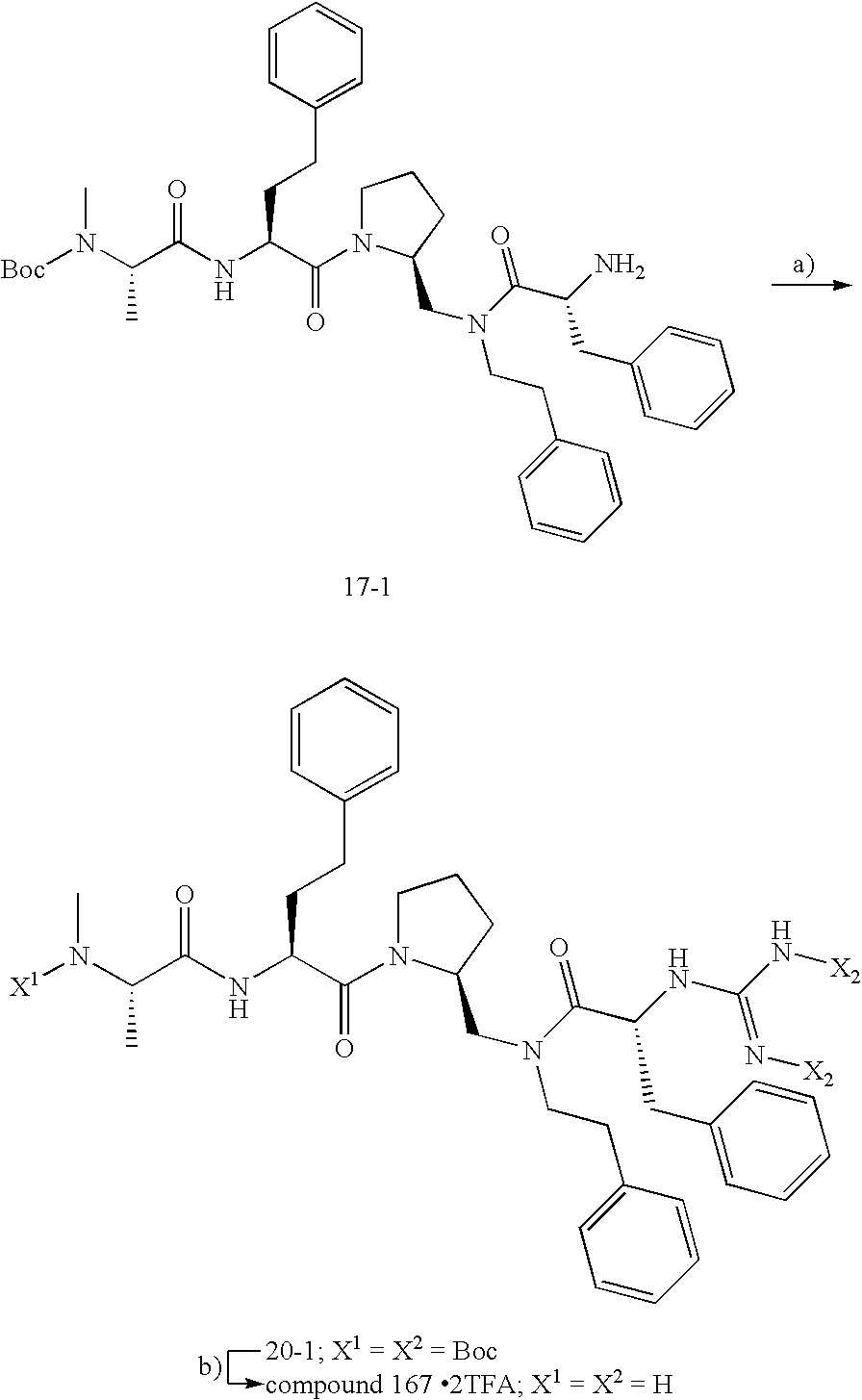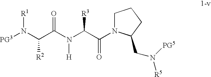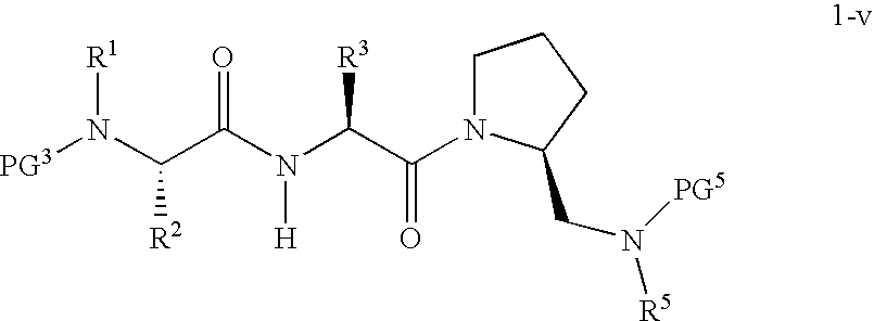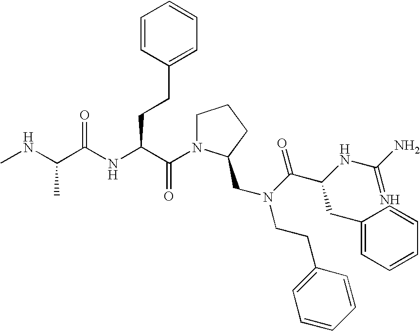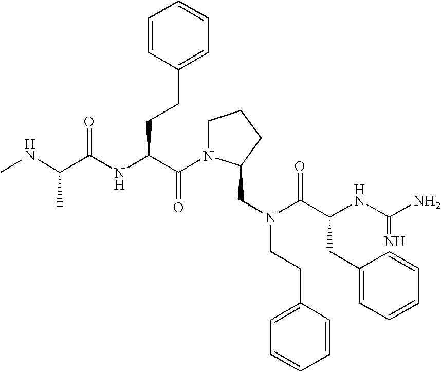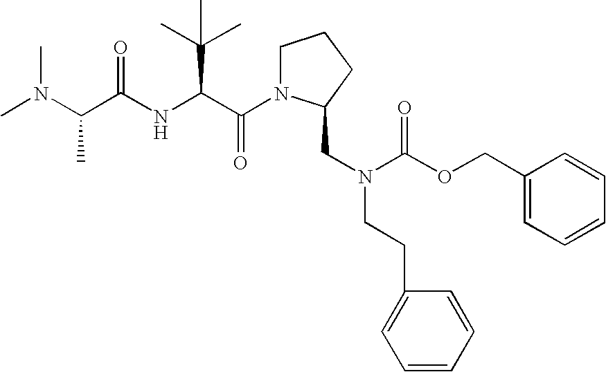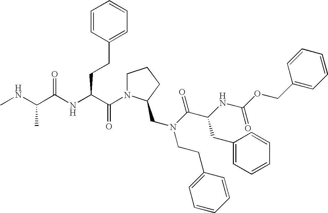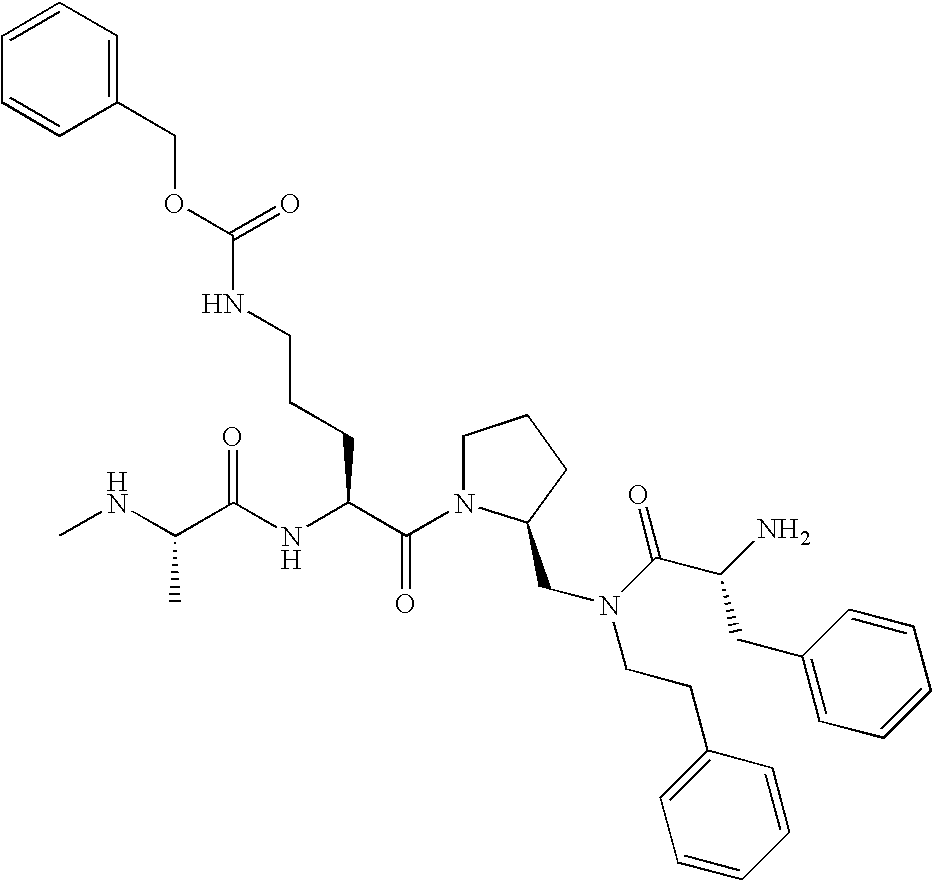 Without wishing to be bound by theory, we believe that the compounds of the present invention bind within the BIR domains of the IAPs. More specifically, compounds of the instant invention bind XIAP and prevent the interaction of the activated caspases with XIAP. Specifically, our data supports the notion that the compounds of the present invention can significantly reduce or essentially eliminate the interaction of XIAP with active caspase-9 and with active caspase-3. Since caspase-7 can also bind to the BIR2 site of XIAP, it is possible that the compounds can also prevent activated caspase-7 from binding to XIAP. Thus one possible mechanism of action of the compounds is to bind to the BIR motif and prevent the interaction with the caspase. In doing so the ratio of active/non-bound caspase in the cells is believed to increase and prime the cells to apoptosis. Alternatively, the compounds of the present invention may bind to the IAPs and modify the global protein conformation and thus modulate its half-life or again prevent XIAP from binding to other proteins. For IAPs having RING domain/E3 ligase activity, the mechanism of action of the compounds may be to prevent the interaction of yet other unknown protein to interact with IAP domains and possibly preventing or inducing the ubiquination of these proteins.