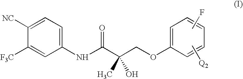 Anabolic and androgenic efficacy of Compound (II) administered by daily oral gavage were tested. The S-isomer of Compound (II) was synthesized and tested as described herein Materials and Methods: Male Sprague-Dawley rats weighing approximately 200 g were purchased from Harlan Bioproducts for Science (Indianapolis, Ind.). The animals were maintained on a 12-h light/dark cycle with food (7012C LM-485 Mouse/Rat Sterilizable Diet, Harlan Teklad, Madison, Wis.) and water available ad libitum. The animal protocol was reviewed and approved by the Institutional Animal Care and Use Committee of the University of Tennessee. The anabolic and androgenic activity of Compound (II) in intact animals, acutely orchidectomized (ORX) animals and chronically (9 days) ORX rats. The test article for this study was weighed and dissolved in 10% DMSO (Fisher) diluted with PEG 300 (Acros Organics, NJ) for preparation of the appropriate dosage concentrations. The animals were housed in groups of 2 to 3 animals per cage. Animals were randomly assigned to one of seven groups consisting of 4 to 5 animals per group. Control groups (intact and ORX) were administered vehicle daily. Compound (II) was administered via oral gavage at doses of 0.01, 0.03, 0.1, 0.3, 0.75, and 1 mg/day to both intact and ORX groups. Where appropriate, animals were castrated on day one of the study. Treatment with Compound (II) began nine days post ORX and was administered daily via oral gavage for fourteen days. The animals were sacrificed under anesthesia (ketamine/xyalzine, 87:13 mg/kg) and body weights were recorded. In addition, ventral prostate, seminal vesicles, and levator ani muscle were removed, individually weighed, normalized to body weight, and expressed as a percentage of intact control. Student's T-test was used to compare individual dose groups to the intact control group. Significance was defined a priori as a P-value <0.05. Ventral prostate and seminal vesicle weights were evaluated as a measure of androgenic activity, whereas levator ani muscle weight was evaluated as a measure of anabolic activity. Blood was collected from the abdominal aorta, centrifuged, and sera were frozen at −80° C. prior to determination of serum hormone levels. Serum luteinizing hormone (LH) and follicle stimulating hormone (FSH) concentrations were determined. Results: A series of dose-response studies in intact and castrated rats in order to evaluate the potency and efficacy of Compound (II) in both androgenic (prostate and seminal vesicles) and anabolic (levator ani muscle) tissue was conducted. In intact animals, Compound (II) treatment resulted in decreases in the weight of both prostate and seminal vesicles while the levator ani muscle weight was significantly increased. Levator ani muscle weight following Compound II treatment were 100%±10%, 98%±7%, 110%±5%, 110%±5%, 125%±10%, and 129%±10% of intact controls following doses of 0.01, 0.03, 0.1, 0.3, 0.75, and 1 mg/day, respectively. The prostate weights were 117%±20%, 98%±15%, 82%±20%, 62%±5%, 107%±30%, and 110%±14% of intact controls following doses of 0.01, 0.03, 0.1, 0.3, 0.75, and 1 mg/day, respectively. These results are significant since current androgen therapies are contraindicated in some patient populations due to the proliferative androgenic effects in prostate and breast tissues. However, many patients in these populations could benefit from the anabolic actions of androgens in muscle and bone. Since Compound (II) exhibited tissue selective anabolic effects, it may be possible to treat patient groups in which androgens were contraindicated in the past. In castrated, ORX animals, prostate weights following Compound II treatment were 10%±3%, 12%±3%, 26%±7%, 39%±6%, 60%±14%, 88%±16%, and 123%±22% of intact controls following doses of 0, 0.01, 0.03, 0.1, 0.3, 0.75, and 1 mg/day, respectively ( Testosterone propionate (TP) and S-3-(4-Acetylaminophenoxy)-2-hydroxy-2-methyl-N-(4-nitro-3-trifluoromethylphenyl) propionamide (S-4), maximally stimulated the levator ani muscle weight to 104% and 101%, respectively. These data show that Compound (II) exhibited significantly greater efficacy and potency than either TP or S-4. As a whole, these data show that Compound II is able to stimulate muscle growth in the presence or absence of testosterone while exerting anti-proliferative effects on the prostate. These data show that Compound (II) restore lost muscle mass in patients with sarcopenia or cachexia. Additionally, the antiproliferative effects of Compound (II) on the prostate may allow some patient populations, in which androgens are currently contraindicated, access to anabolic agents. Compound II exhibited anabolic muscle/prostate ratio in castrated rats of 4.10, 2.39, 2.28, 1.97, 1.53, 1.05 following doses of 0.01, 0.03, 0.1, 0.3, 0.75 and 1 mg/day, respectively. Pharmacology results following 1 mg/day of compound II exhibited that prostate weight was 110%±14% of intact control and levator ani muscle weight was 129%±10% of intact control. Compound II maintained prostate weight following orchidectomy at 123±22% of intact controls and levator ani muscle weight at 129±14% of intact controls. A range of between 0.1 mg/day to 0.3 mg/day of Compound II restored 100% of levator ani muscle weight, while between 39 to 60% prostate weight was restored. Materials and Methods: P450 enzyme inhibition was measured using human cDNA-expressed CYP3A4, 2D6, 2C19, 2C9, and 1A2 recombinant enzymes and fluorogenic substrates (coumarin analogues) that are converted to fluorescent products. The analogues utilized for each isoenzyme are as follows: 7-Benzyloxy-trifluoromethylcoumarin, (BFC) for 3A4; 3-[2-(N,N-diethyl-N-methyl amino)ethyl] 7-methoxy-4-methylcoumarin, (AMMC) for 2D6; 3-Cyano-7-Ethoxycoumarin, (CEC) for 2C19 and 1A2; and 7-Methoxy-4-trifluoro-methylcoumarin, (MFC) for 2C9. These substrates were utilized at a single concentration (either 50 μM or 75 μM) at or near the appa