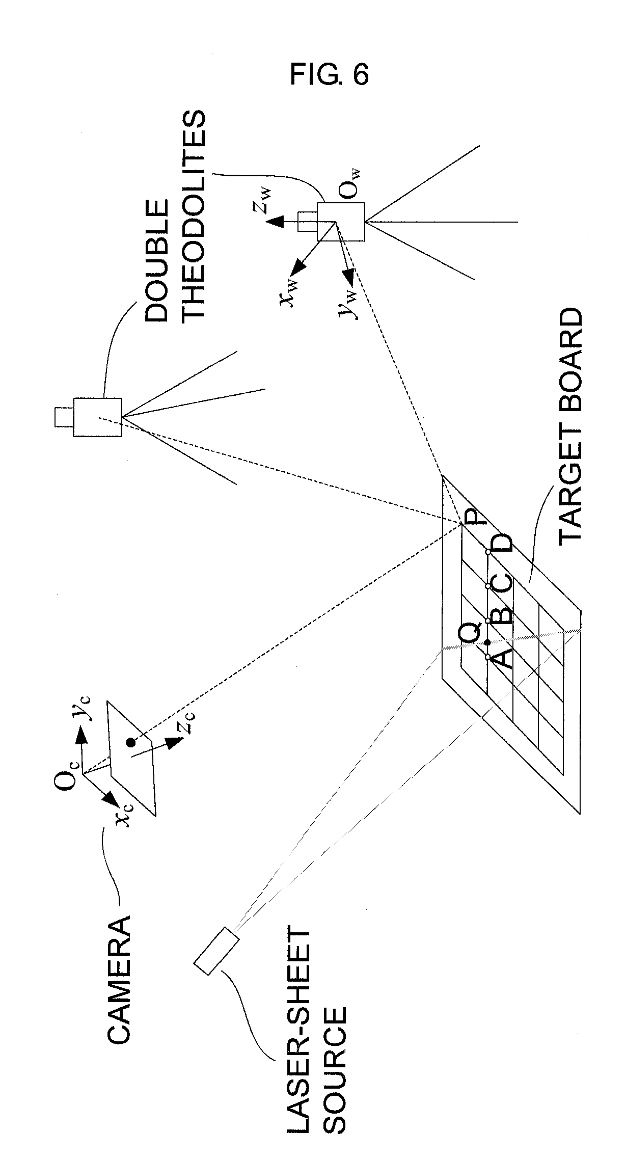 where Xw=[xwywzW]T, Xb=[xbybzb]T, Rbwis the rotation matrix between the space of target board and the space of double-theodolite, and Tbwis the translation vector. In general, we can get a unique solution for Rbwand Tbwafter three target points are measured by double-theodolite system. Then the coordinates of other target points in the space of double-theodolite can be determined by equation (5). If the images of target board on n (n≧3) noncoplanar positions are captured, we can calibrate the parameters of camera by “noncoplanar algorithm”.