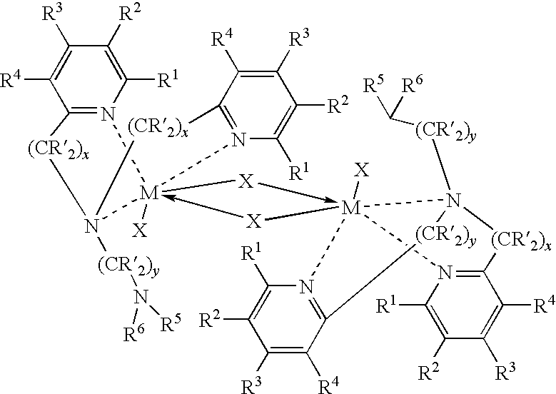 38. The catalyst precursor of claim 2, wherein M comprises one or more of cobalt, iron or manganese and R6is selected from the group consisting of phenyl, phenethyl, dimethylphenyl, trimethylphenyl, methylphenyl, ethylphenyl, diethylphenyl, triethylphenyl, propylphenyl, dipropylphenyl, tripropylphenyl, methylethylphenyl, dibutylphenyl, and butylphenyl.
