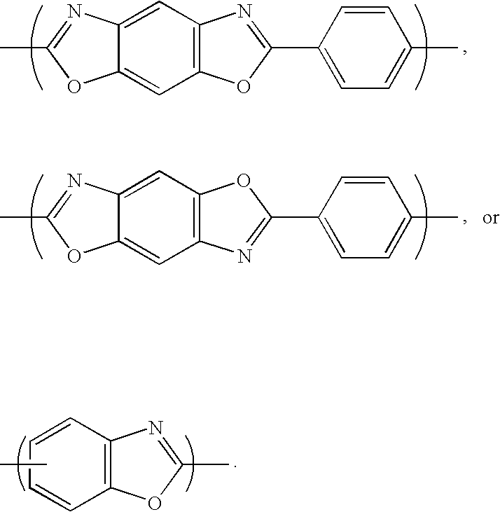 where ln is the natural logarithm function and C is the concentration of the polymer solution. Vrelis a unitless ratio of the polymer solution viscosity to that of the solvent free of polymer, thus Vinhis expressed in units of inverse concentration, typically as deciliters per gram (“dl/g”). Accordingly, in certain aspects of the present invention the polypyridoimidazole polymers are produced that are characterized as providing a polymer solution having an inherent viscosity of at least about 20 dl/g at 30° C. at a polymer concentration of 0.05 g/dl in methane sulfonic acid. Because the higher molecular weight polymers that result from the invention disclosed herein give rise to viscous polymer solutions, a concentration of about 0.05 g/dl polymer in methane sulfonic acid is useful for measuring inherent viscosities in a reasonable amount of time.