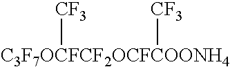 as an emulsifier, and 0.09 g of disodium hydrogen phosphate•12 hydrate as a pH adjuster, the inside of the autoclave was sufficiently displaced with nitrogen gas and deaerated thereof, then, a temperature was raised to 50° C. while agitating at 600 rpm, and the autoclave was charged with a mixed gas of tetrafluoroethylene (TFE) and perfluoro (methyl vinyl ether) (PMVE) (a molar ratio of TFE/PMVE=25/75) to have an internal pressure at 0.78 MPa·G. Subsequently, 10 ml of a solution of ammonium persulphate (APS) having a concentration of 527 mg/ml was pressed into the autoclave at a pressure of nitrogen to initiate a reaction.