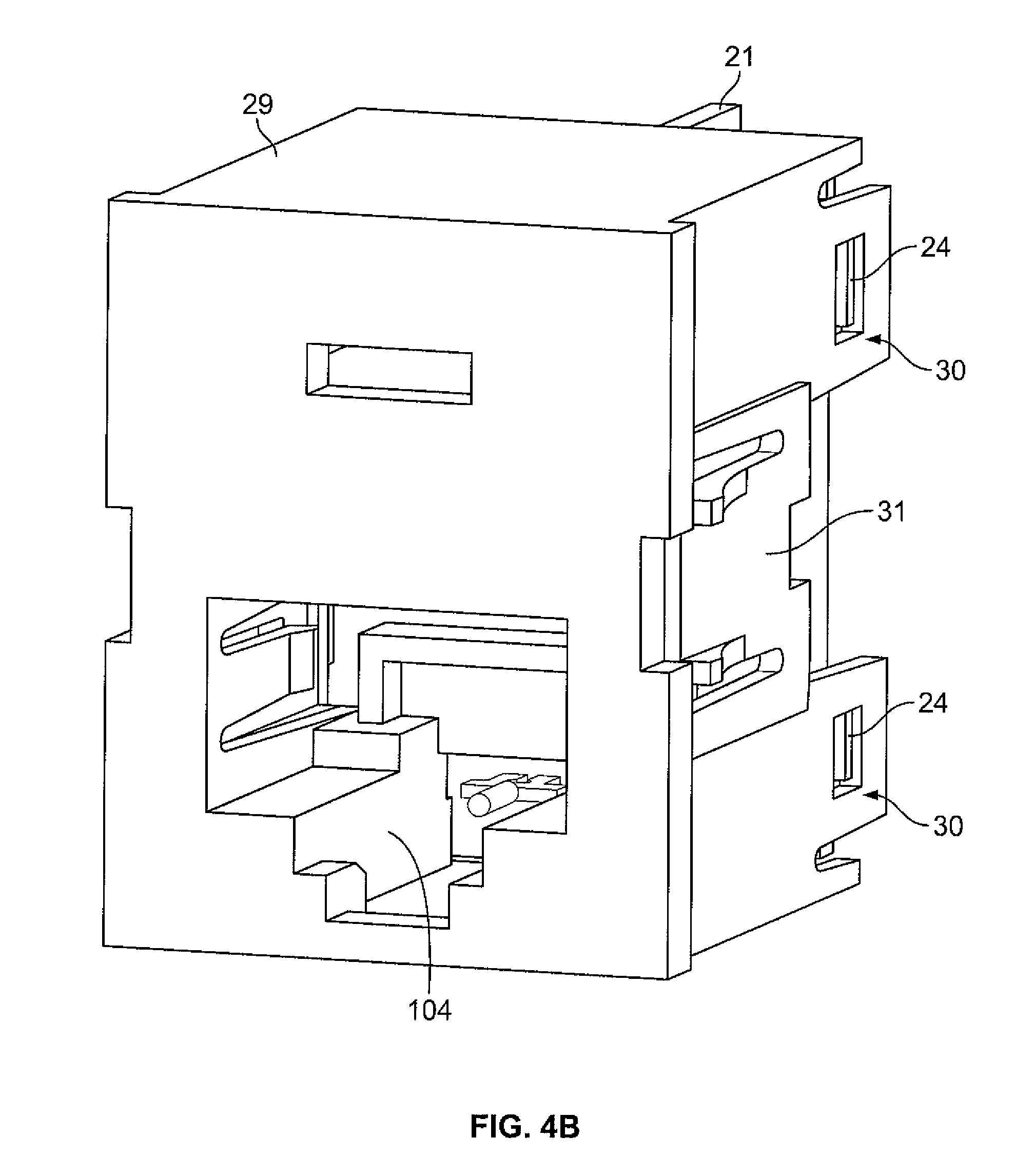 i. a jack housing defining a plug opening and a first opening; ii. a connector sub-assembly housing detachably coupled to said jack housing in proximity to the first opening, wherein said first connector sub-assembly housing defines a cam member that includes a cam slot; iii. a printed circuit board that includes a plurality of plug connection elements and terminals held between the jack housing and the first connector sub-assembly housing, and wherein at least one of said plurality of plug connection elements aligns with the plug opening of the jack housing; and iv. a contact insert held between the jack housing and the printed circuit board, and b. a second connector sub-assembly including:
