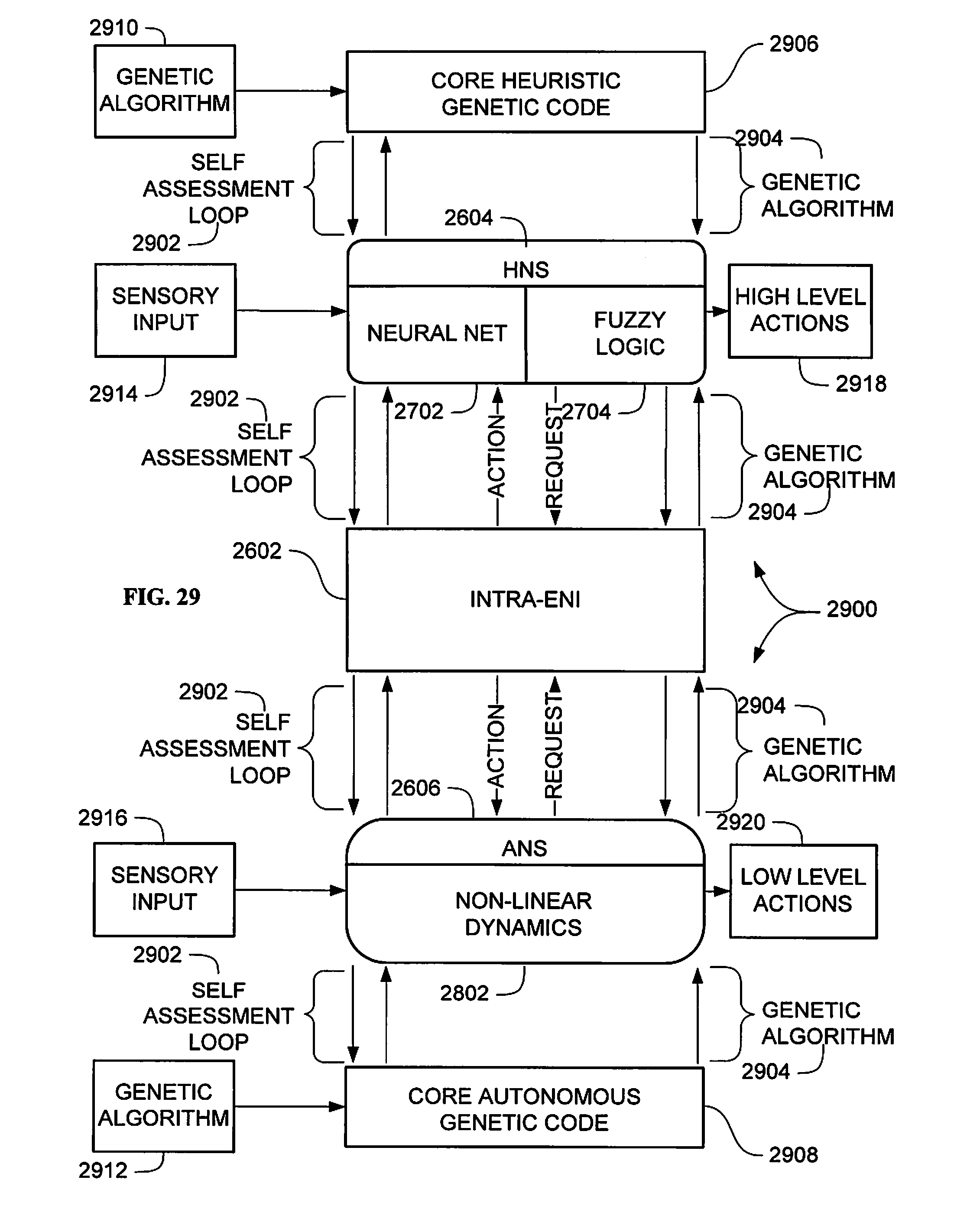 instantiating a first embryonic evolvable neural interface; evolving the first embryonic evolvable neural interface towards complex complete connectivity; wherein the evolvable neural interface receives one or more heart beat monitor signal, pulse monitor signal, and quiesce signal, wherein the evolvable neural interface generates one or more heart beat monitor signal, pulse monitor signal, and quiesce signal, wherein the quiesce signal comprises a stay-awake signal, wherein the first embryonic evolvable neural interface receives the quiesce signal from a second embryonic evolvable neural interface to withdraw a stay-awake signal, and then, if the first embryonic evolvable neural interface does not receive a stay-alive reprieve signal after a predetermined period of time, the first embryonic evolvable neural interface self-destructs. 30. The computer-accessible medium of 31. The computer-accessible medium of 32. A computer-accessible medium having executable instructions to protect an autonomic system, the executable instructions capable of directing a processor of the autonomic system to perform: