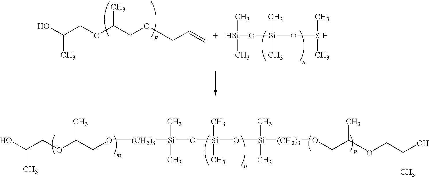 • Step 1) Firstly a mixture was made with 0.041 g of DABCO LV-33 (Airproducts), 0.120 g of bismuth neodecanoate (Bicat 8108M from Shepherd chemicals), 0.467 g of diethanol amine (DEOA, from Sigma), 3.056 g of poly(dimethyl siloxane) diol (DMS-s14 Gelest Inc.), 1.633 g of polypropylene oxide (Mw=700 g/mol), 0.200 g water and 0.1 g of surfactant (Max L-618 from Airproducts). These were added to a plastic flat bottomed container and were thoroughly mixed manually for 30 sec until a homogenous mixture was obtained.