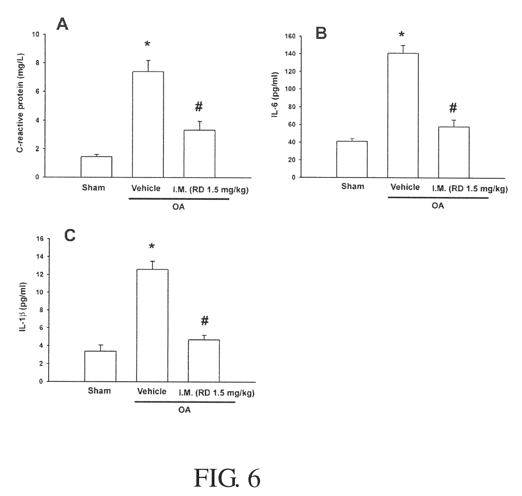 Lewis rats are given intradermal/subcutaneous (SC) injections of bovine type II collagen (2 mg/ml in Freund's incomplete adjuvant). As rats develop the rheumatoid disease, they are randomly divided into several study groups. Treatment is initiated on the first day when the clinical signs of arthritis are clearly visible, as evidenced, for example, by ankle joint swelling. After measuring the paw volume, rats are sacrificed, and ankle and knee joints are collected for the examination of histopathological change.
