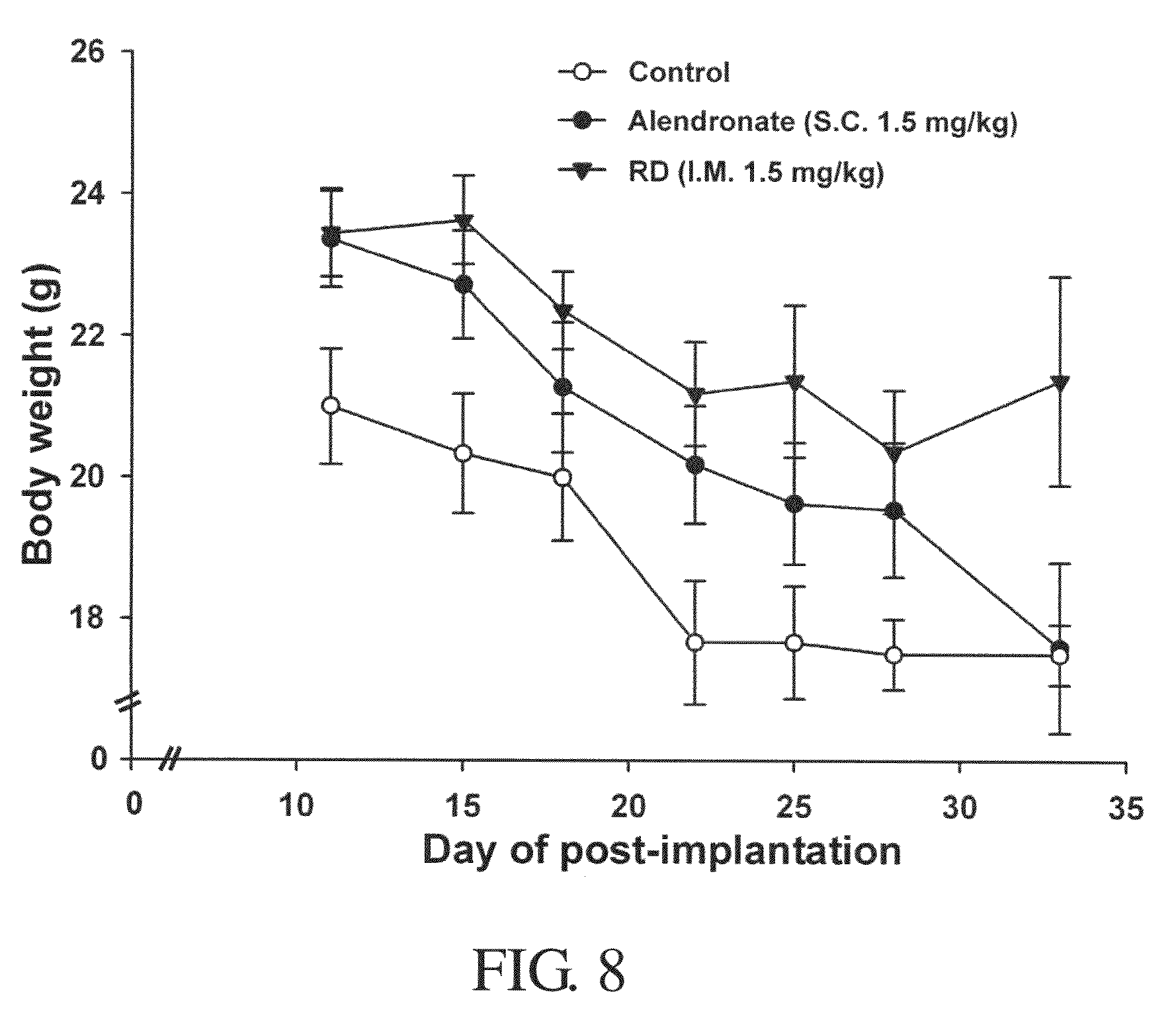 FIG. 8 shows the effect of RD on the decrease in body weight in response to the tumor growth in SCID mice. Untreated control mice showed a decrease in body weight at the end of the experiment. Treatment with RD prevented the loss of body weight caused by the tumor growth. Alendronate was used as a positive control.