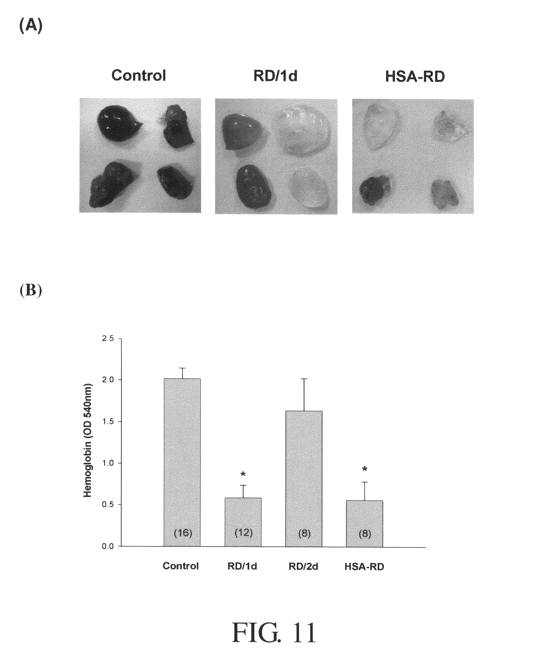 It has been reported that integrin αvβ3 is related to angiogenesis. Whether RD protein can inhibit angiogenesis was thus investigated using MATRIGEL™ plug angiogenesis assays as described previously with minor modifications [32]. Briefly, an aliquot (500 μl) of MATRIGEL™ (Becton Dickinson Lab.) containing 200 ng/ml VEGF was injected subcutaneously into the dorsal region of 6-8 week-old C57BL/6 mice. The MATRIGEL™ formed a plug rapidly. RD was administered intramuscularly (3 mg/kg) daily (RD/1d) or the other day (RD/2d or HSA-RD) before sacrifice. After 8 days, plugs were taken and photographed (FIG. 11A). Neovessels were quantified by measuring the hemoglobin of the plugs as an indication of blood vessel formation with the Drabkin method and Drabkin reagent kit 525 (Sigma) (FIG. 11B). As shown in FIGS. 11A and 11B, RD protein was effective in inhibiting angiogenesis using MATRIGEL™ plug assays. *: P<0.05 versus control group.