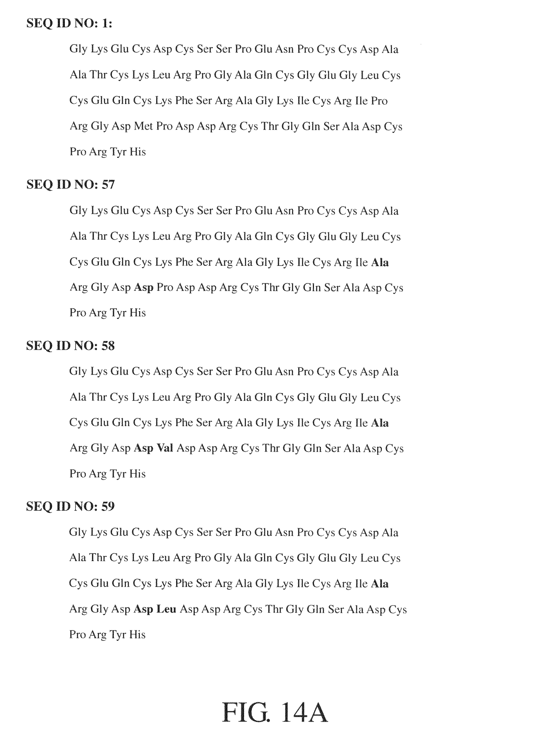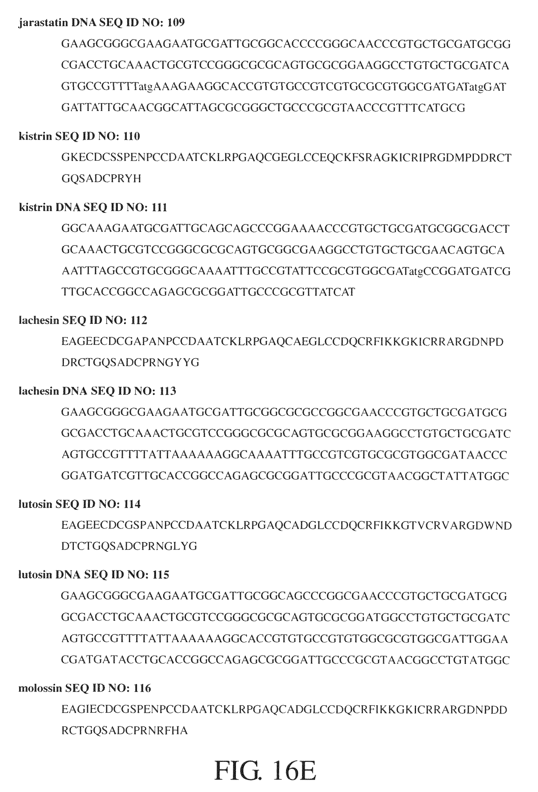FIGS. 14A-D show amino acid sequences of Rho and its variants, SEQ ID NOs: 1, and 57-69, respectively. FIGS. 15A-C show nucleotide sequences of rhodostomin variants, SEQ ID NOs: 43-56. FIGS. 16A-H show amino acid and nucleotide sequences of disintegrin variants, SEQ ID NOs: 78-135.