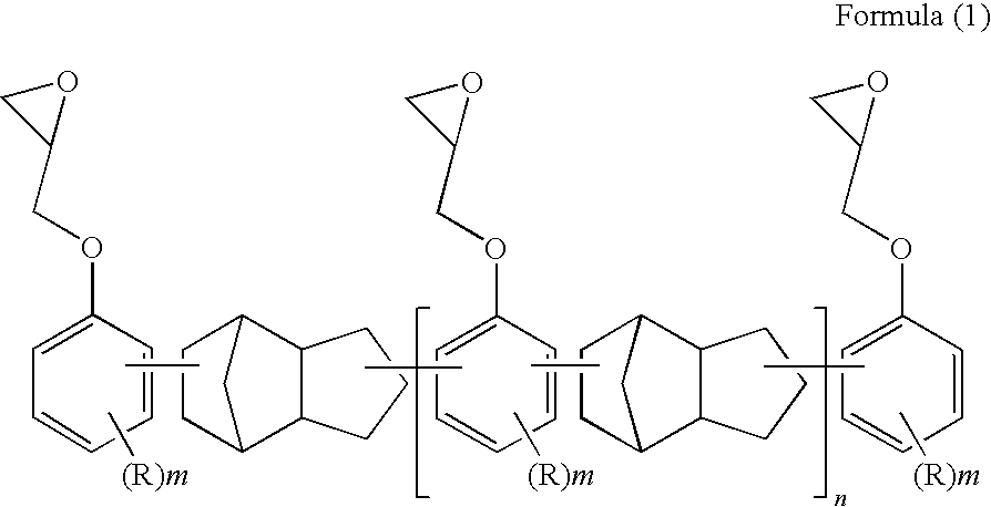 Epoxy resin (A): HP-7200H (manufactured by 66.5 parts Dainippon Ink and Chemicals, Inc.) Epoxy resin (B): EHPE 3150 (epoxy equivalent of 28.5 parts about 180) (manufactured by Daicel Chemical Industries, Ltd.) Photocationic polymerization initiator: SP-172 1.5 parts (manufactured by Adeka Corporation) Additive (silane coupling agent): A-187 3.5 parts (manufactured by Nihonunika Corporation) Example 2