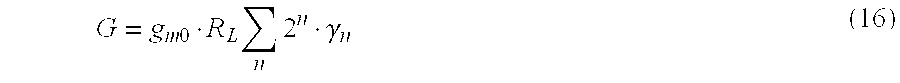 Therefore, the cells 304B, 304C, and 304D manifest transconductance of 2gm0, 4gm0, and 8gm0, respectively. Referring to From Equation 15, the gain of the proposed programmable VGA can be expressed as: When all cells 304 are turned on, γn=1 for 0≦n≦N−1. Consequently, the amplifier's gain approaches its maximum, GMAX. Under these conditions, Equation 16 yields: