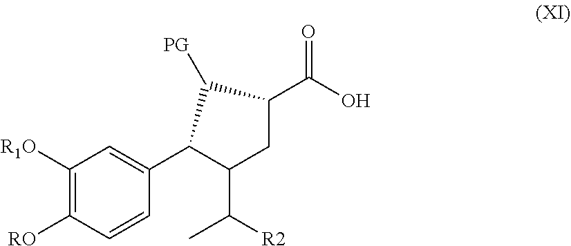 A solution of 0.60 g of (2S,4S,5R)-4-Acetyl-5-[4-methoxy-3-(3-methoxy-propoxy)-phenyl]-pyrrolidine-1,2-dicarboxylic acid 1-tert-butyl ester 2-ethyl ester VIIIa in 10 mL of tetrahydrofuran at room temperature is treated with 2 mL of a 2.0M solution of lithium hydroxide. The solution is stirred for 24 hours at room temperature and diluted with 10 mL of tert-butylmethyl ether and 10 mL of water. The organic layer is removed and the aqueous layer treated with 3 mL of 2.0M hydrochloric acid. The organic phase is separated and washed with 20 mL of water in two portions. The organic layer is dried and the solvent removed in vacuum at 35° C. to give acid XIIa as a white solid.1H-NMR δ (d6-DMSO): 12.90 (1H, Brs, exch D2O, CO2H), 7.45 (1H, m, Ph), 7.05 (1H, m, Ph), 6.90 (1H, m. Ph), 5.05 & 4.80 (1H, d, PhCHN rotamers), 4.30 & 4.15 (1H, m NCHCO2rotamers), 4.00 (2H, m, CH2O), 3.78 (3H, s, CH3O), 3.50 (2H, s, CH2O), 3.33 (3H, s, CH3O), 3.20 (1H, m, CHCO), 2.40 (1H, m, CH), 2.22 & 2.13 (3H, s, Me rotamers), 2.10 (1H, m, CH), 1.95 (2H, m, CH2), 1.40 & 1.05 (9H, s, tBu rotamers).