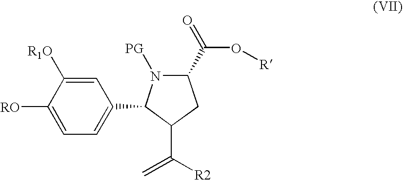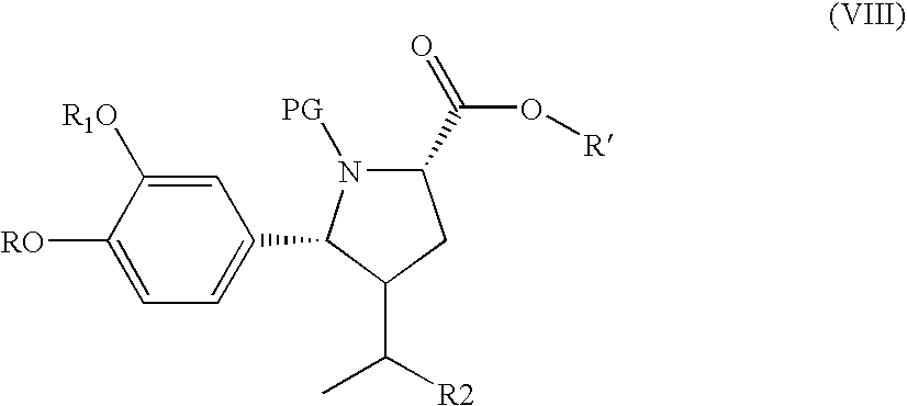 A solution of (2S,4R,5R)-4-Isopropenyl-5-[4-methoxy-3-(3-methoxy-propoxy)-phenyl]-pyrrolidine-1,2-dicarboxylic acid 1-tert-butyl ester 2-ethyl ester VIIa (0.3 g) in 10 mL of toluene is treated with 50 mg of 5% palladium on carbon. The suspension is stirred under an atmosphere of hydrogen for 2 hours at room temperature and filtered. The solvent is removed in vacuum to give the desired compound as an oil.